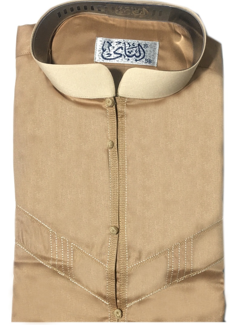 Qamis original de couleur camel et col beige bouton pression décorés (tissés). Tissu satiné.
