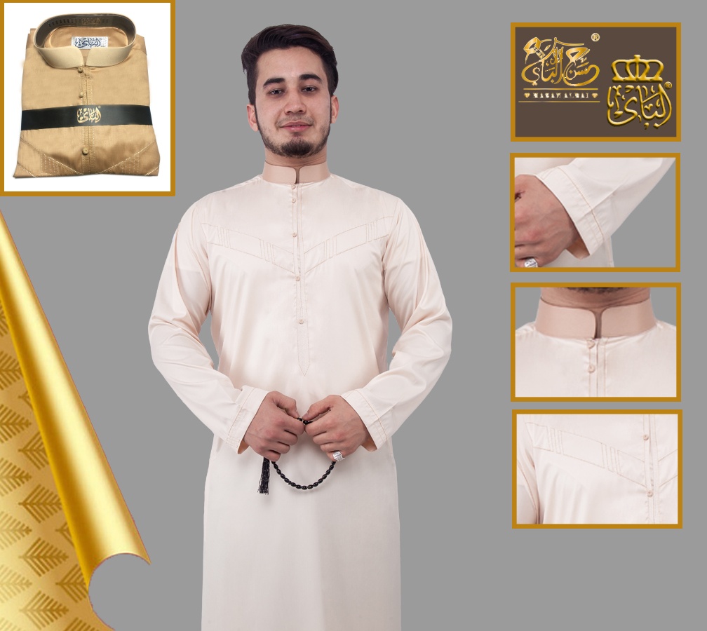 Qamis long manches longues ouverture boutons au niveau de la poitrine. Tissu de qualité supérieure, fluide et très agréable, légèrement satiné, adapté à toutes les saisons. Très bonnes coutures et finitions. Deux grandes poches latérales avec sous-poches internes (pour clés ou petits objets). Le col mao est d'une couleur légèrement plus claire (beige).