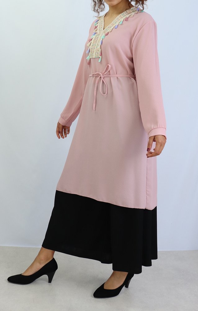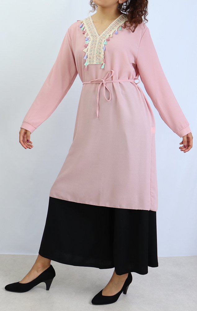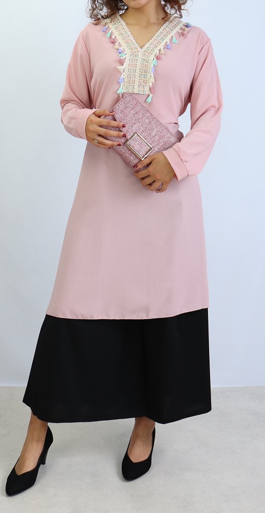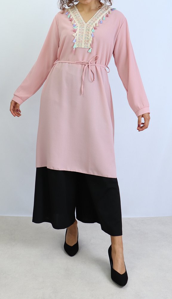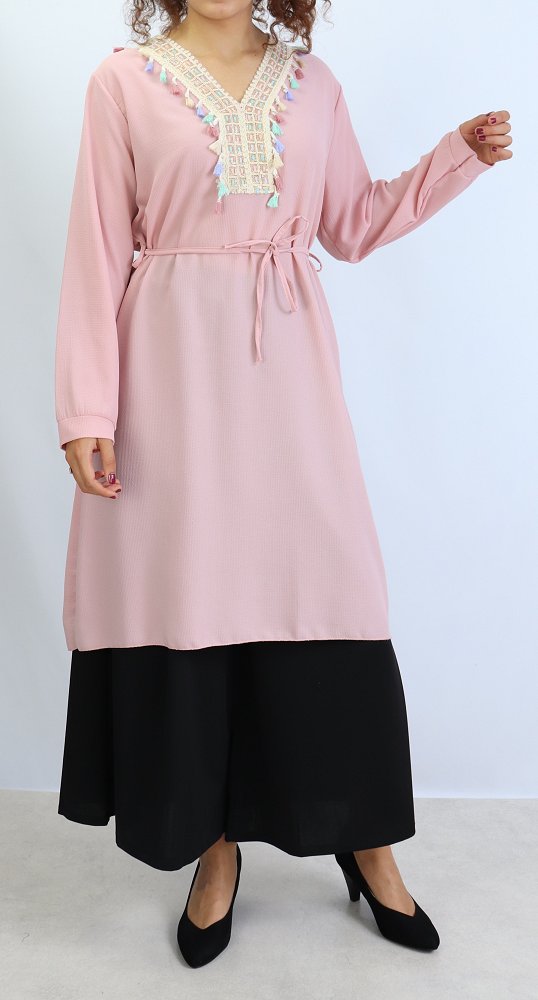 Tunique encolure brodée col V avec pompons - Couleur Rose clair Vetement & Accessoire