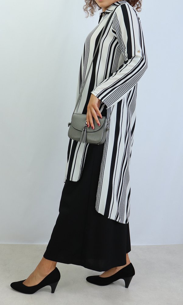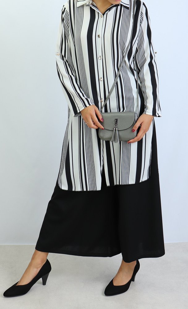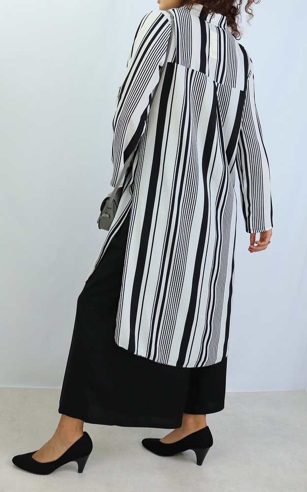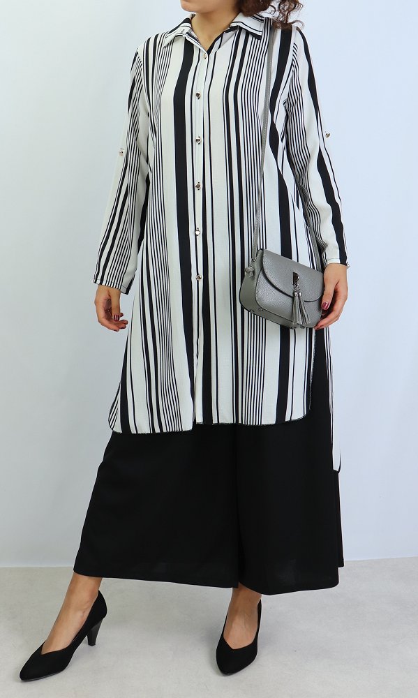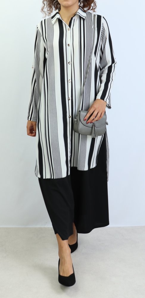 Chemise longue, fermeture boutons, col chemise, les manches sont retroussables et se replient grâce à une patte de boutonnage cousue à l’intérieur.