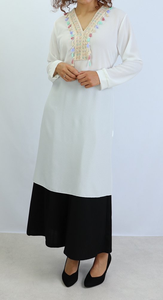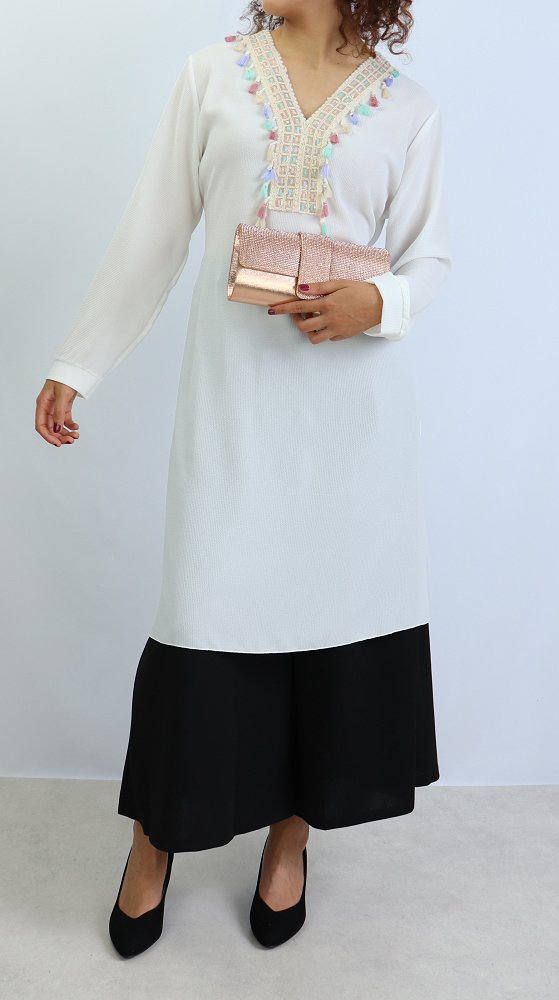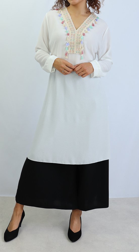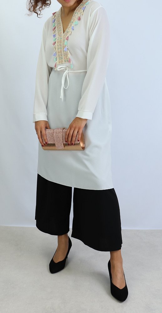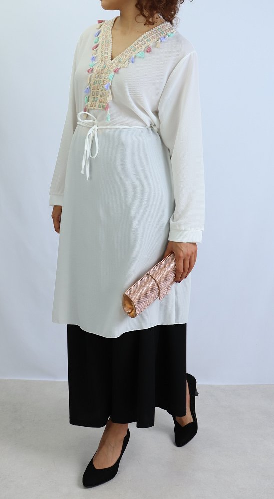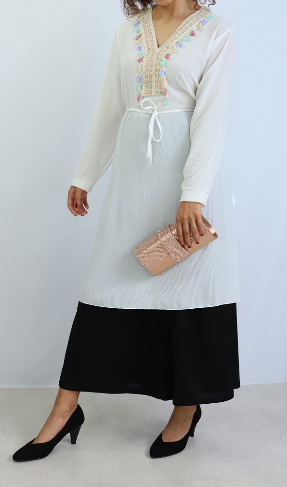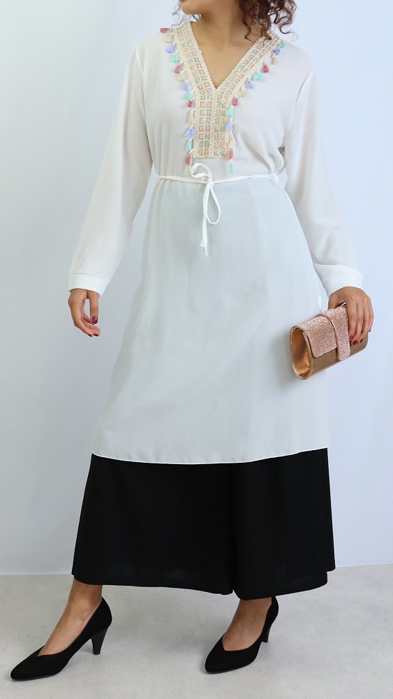 Tunique légère et délicate avec son encolure en V avec plastron broderie. Matière naturelle et légère effet crêpe, accompagnée d'une ceinture à nouer sous passants à la taille. Profitez de ce qui vous rend encore plus belle.