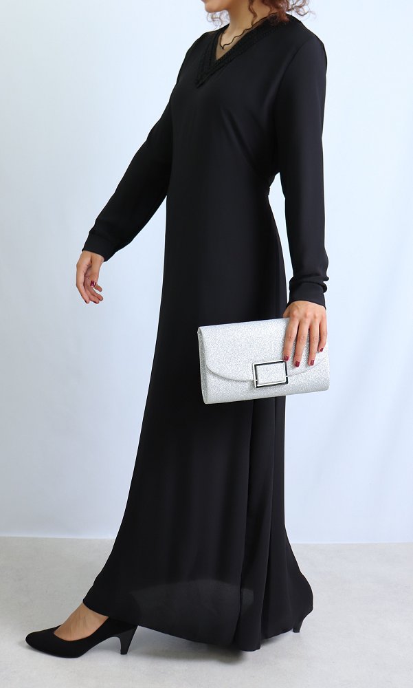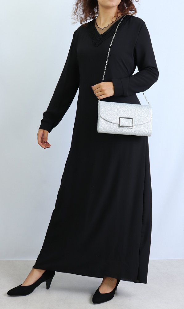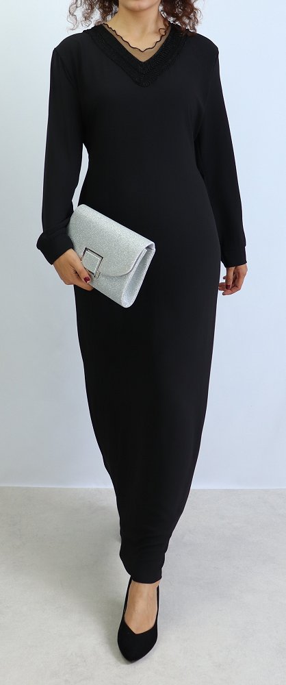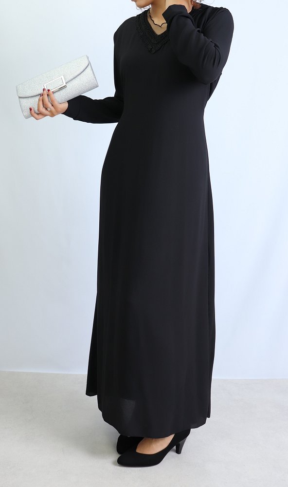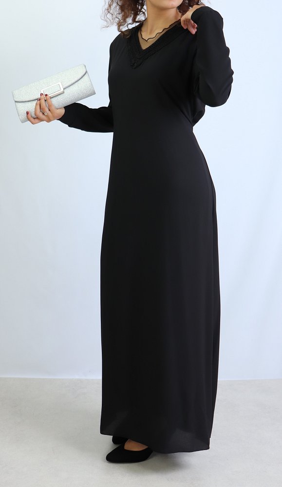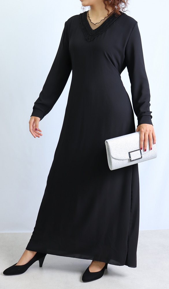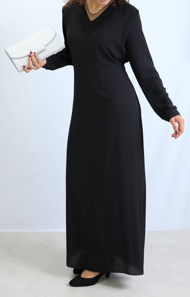 Robe longue entièrement doublée, coup droite, belles décorations sur le col V, ceinture assortie à passant pouvant s'attacher devant comme derrière, tissu fluide est très léger.