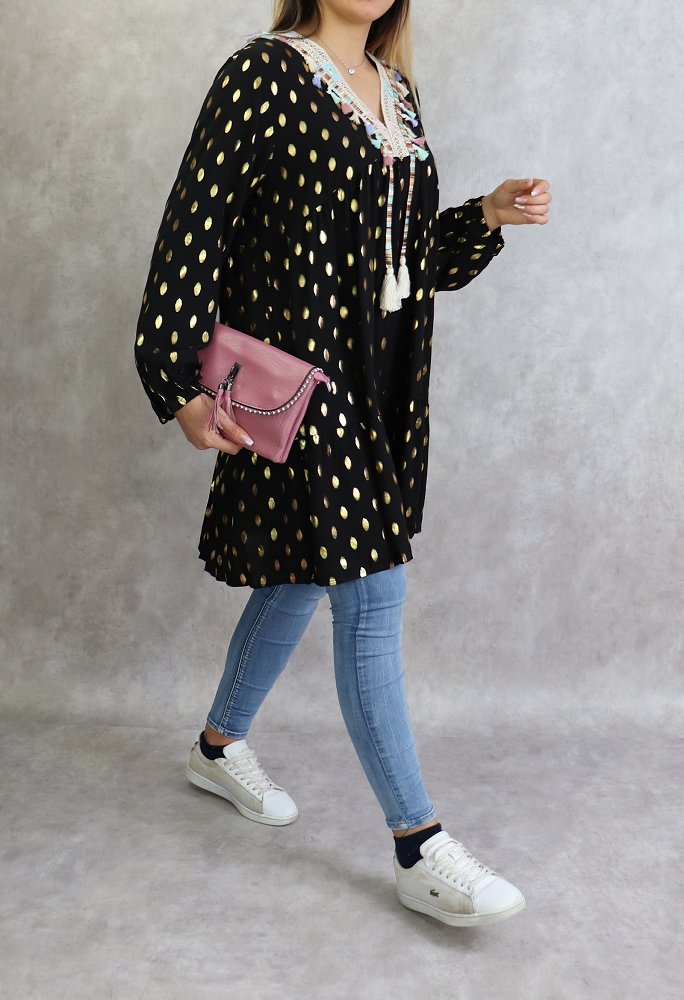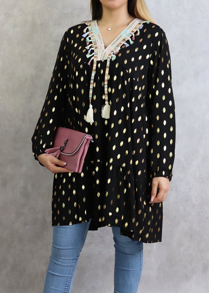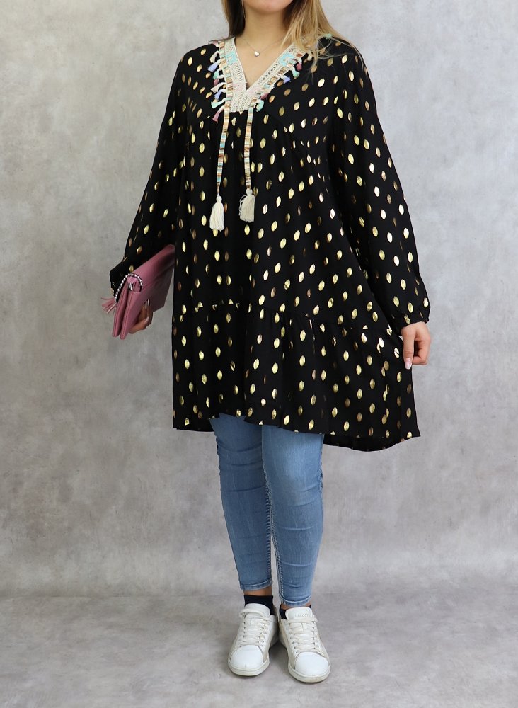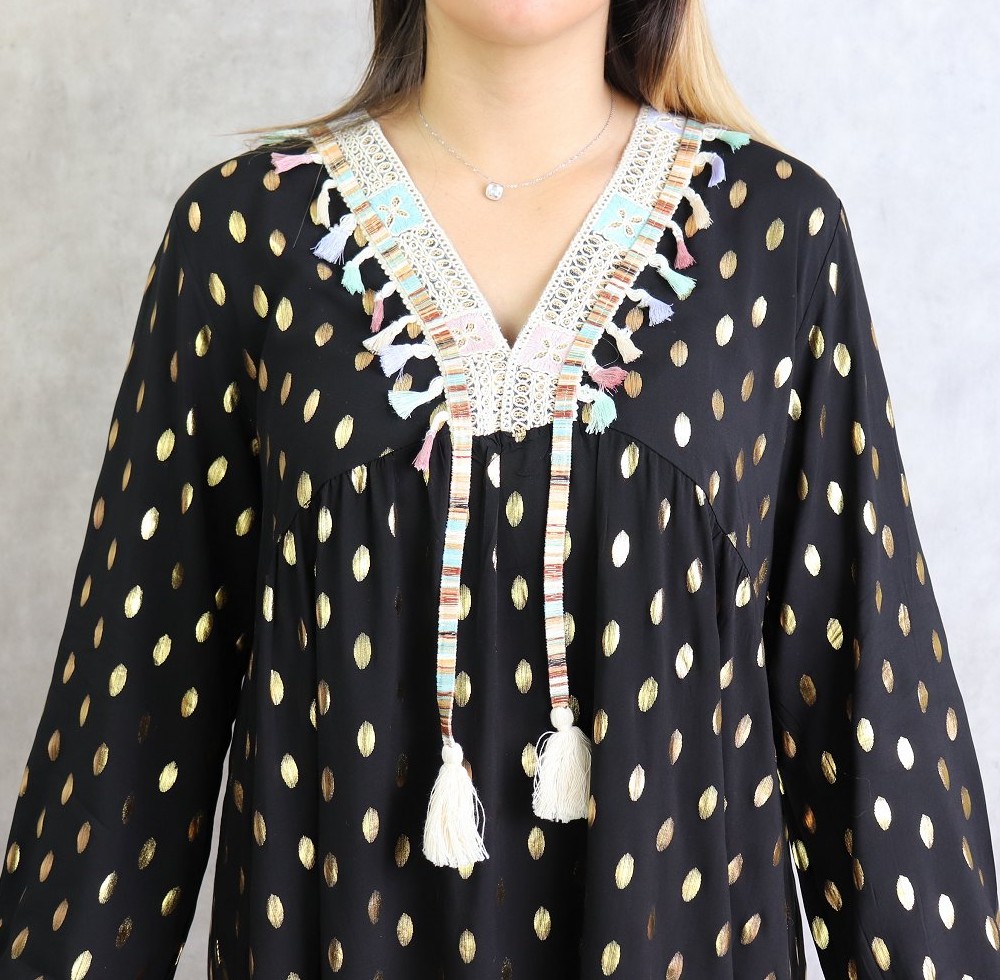 Tunique longue, col en V avec broderies, manches longues, poignets élastiques. Motifs dorés. Coupe évasée, matière légère et fluide.