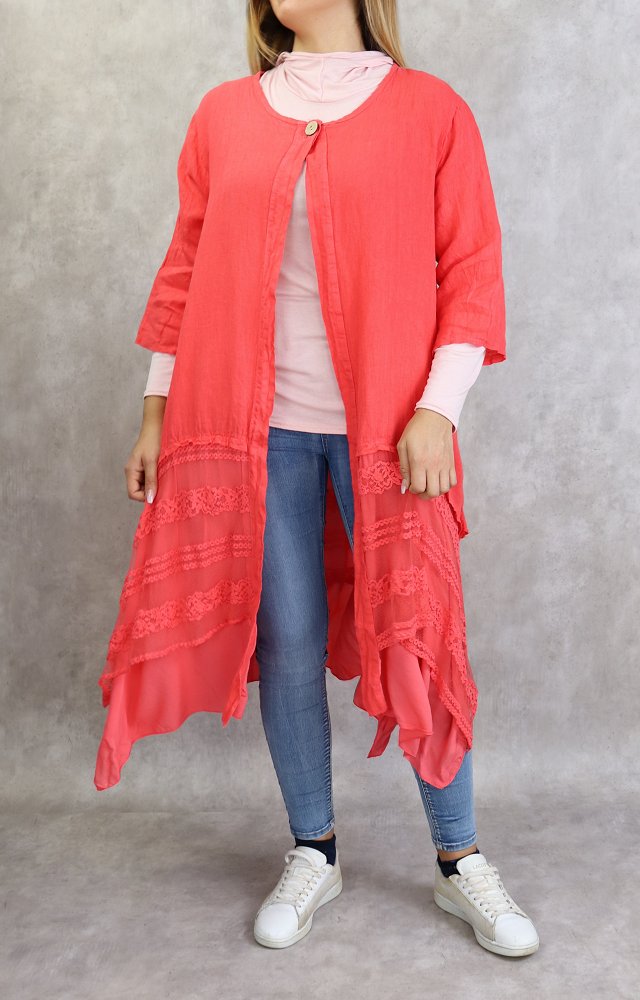 Veste mi longue, col rond, fermeture 1 bouton, manches 3/4, poches latérales. Coupe évasée, matière agréable et fluide, finition sur le bas d'une dentelle doublée.