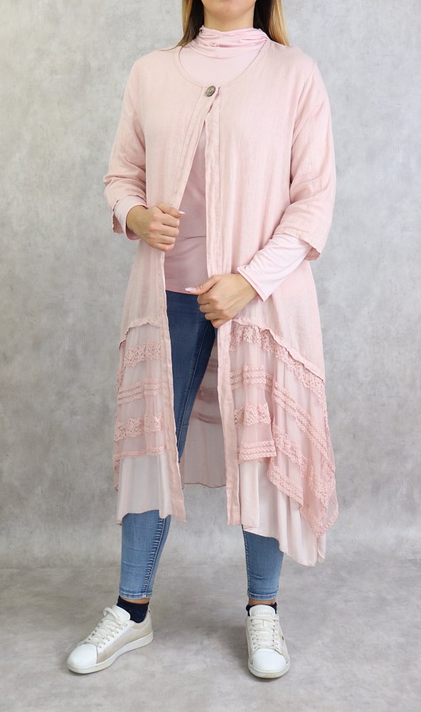 Veste mi longue, col rond, fermeture 1 bouton, manches 3/4, poches latérales. Coupe évasée, matière agréable et fluide, finition sur le bas d'une dentelle doublée.