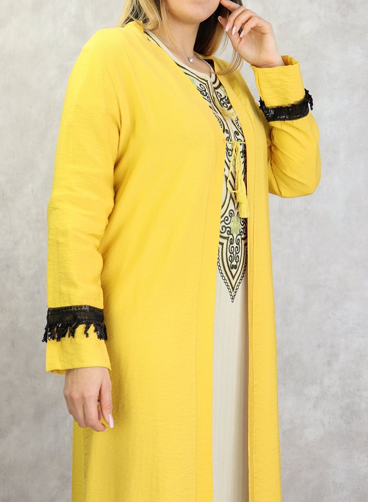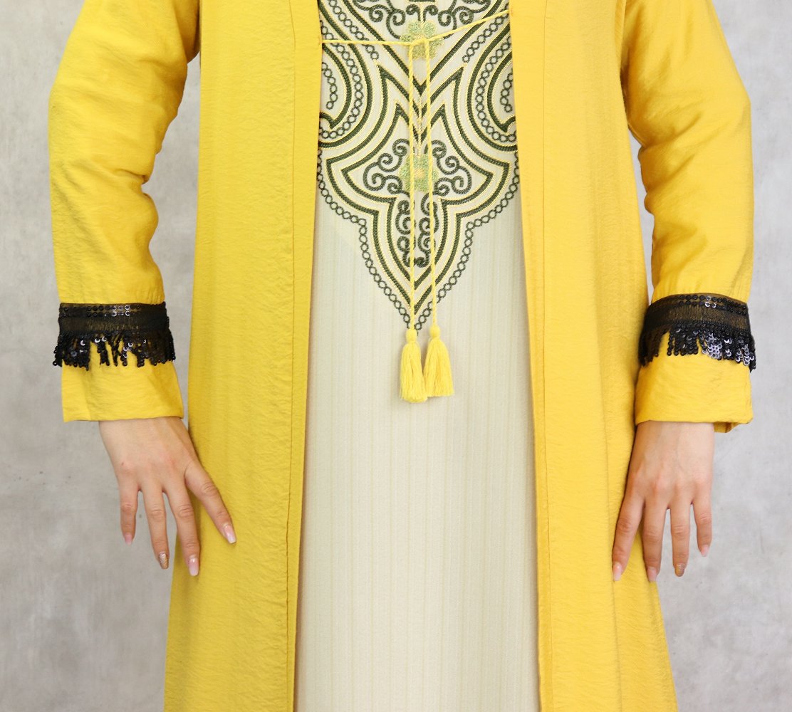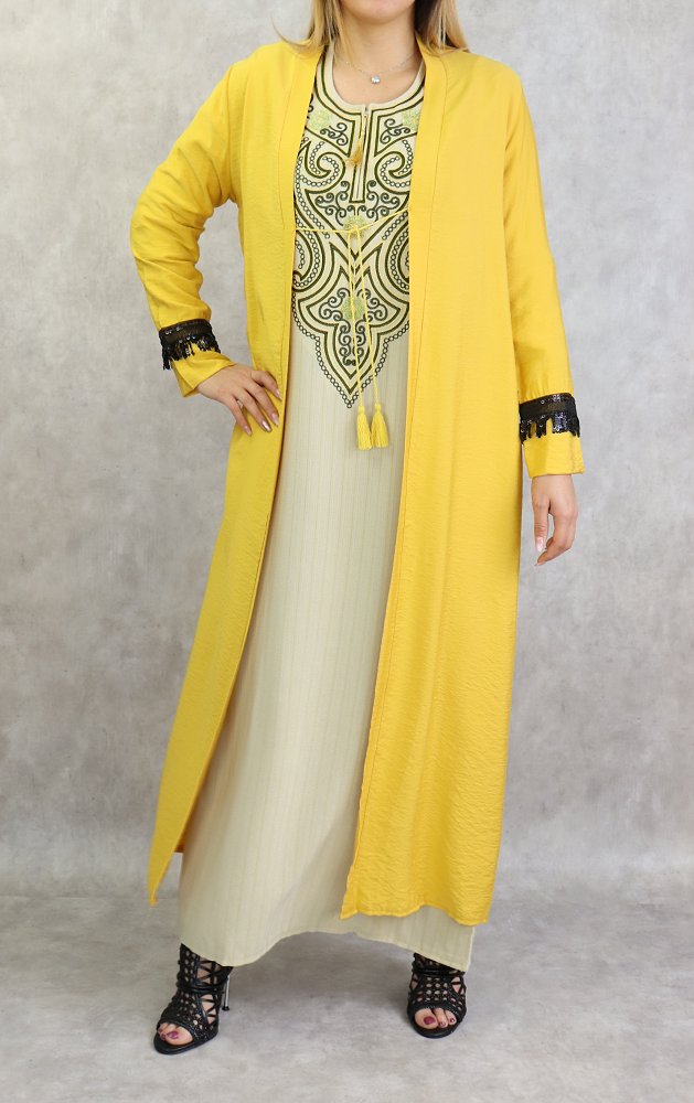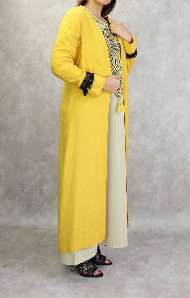 Kimono long, fermeture par cordons à pompons, ornements franges à strass sur le bas des manches, tissu non transparent.