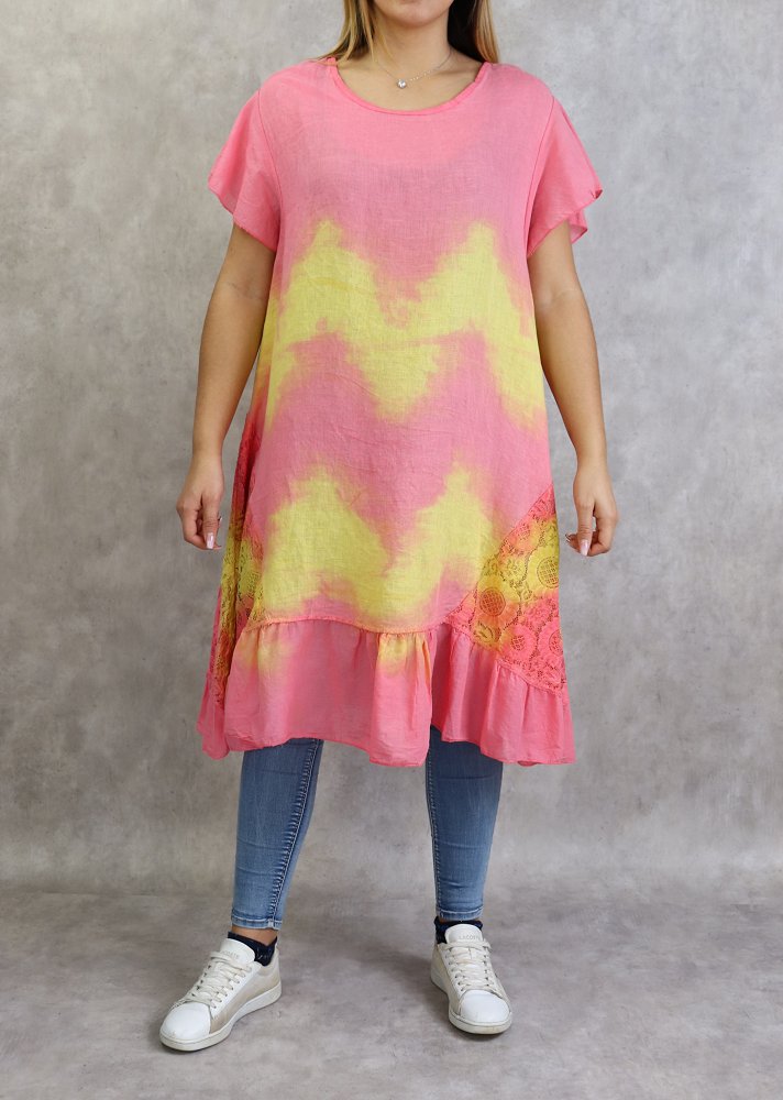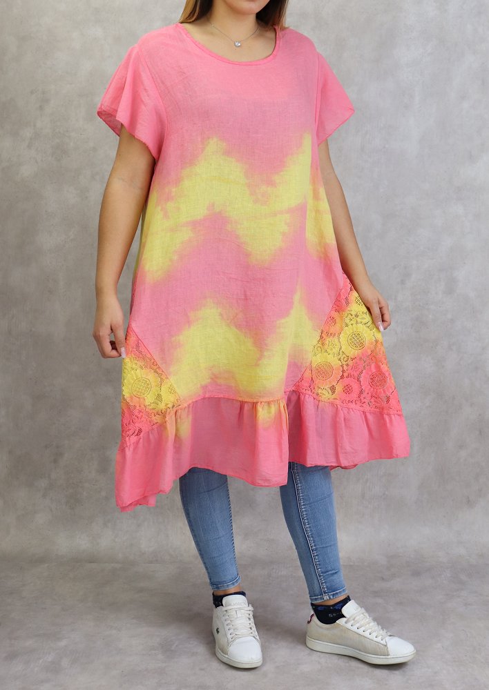 Robe été - Tunique longue et ample délavée de couleur rose et jaune (Coton et Lin - Grande taille pour femme) Vetement & Accessoire