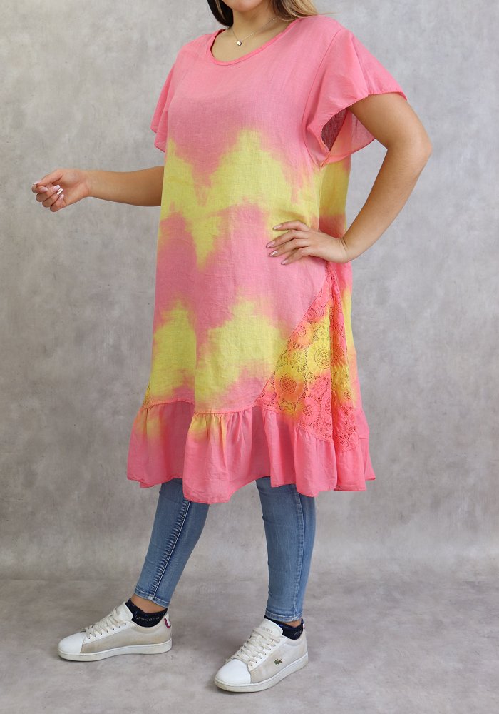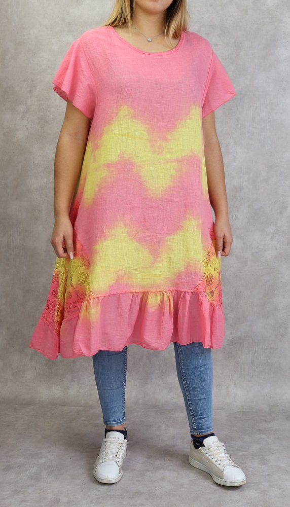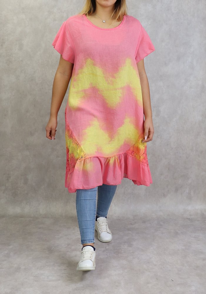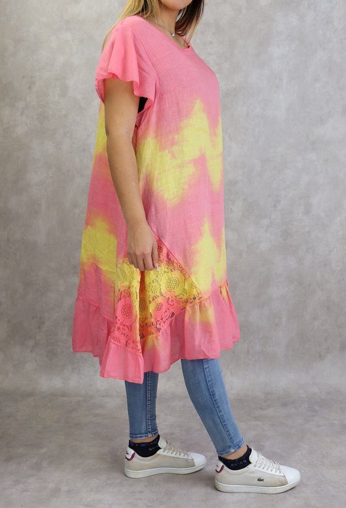 Robe ete - Tunique longue et ample delavee de couleur rose et jaune (Coton et Lin - Grande taille pour femme)