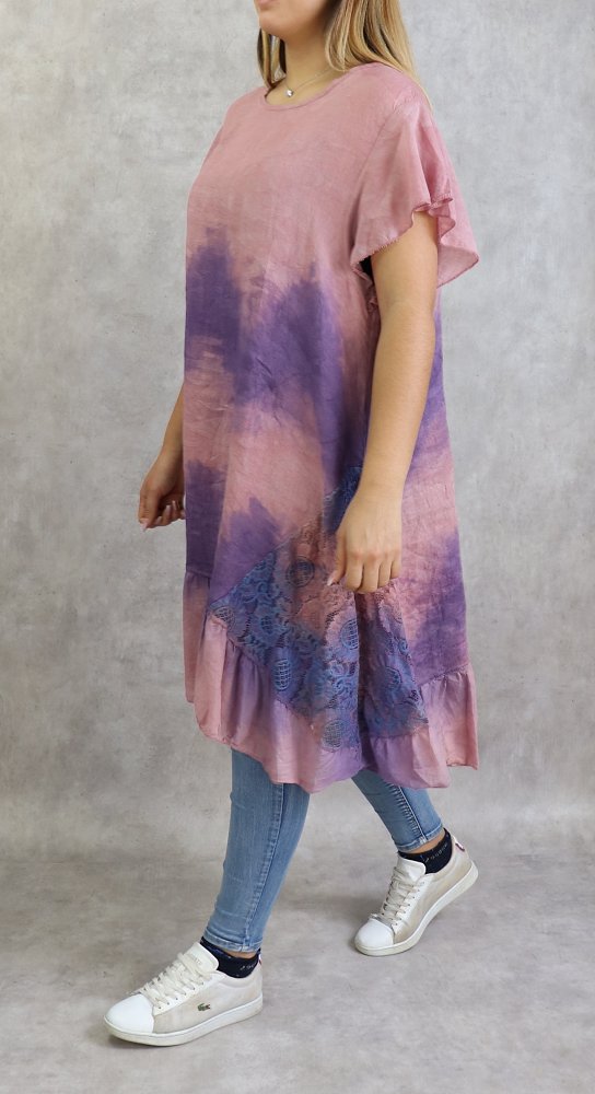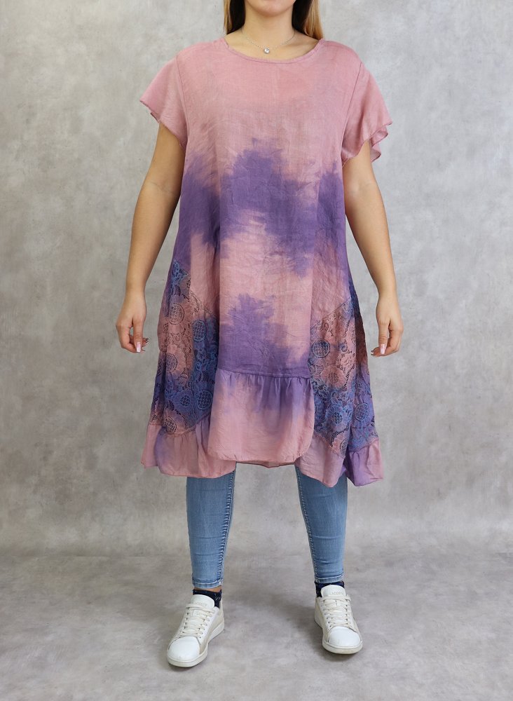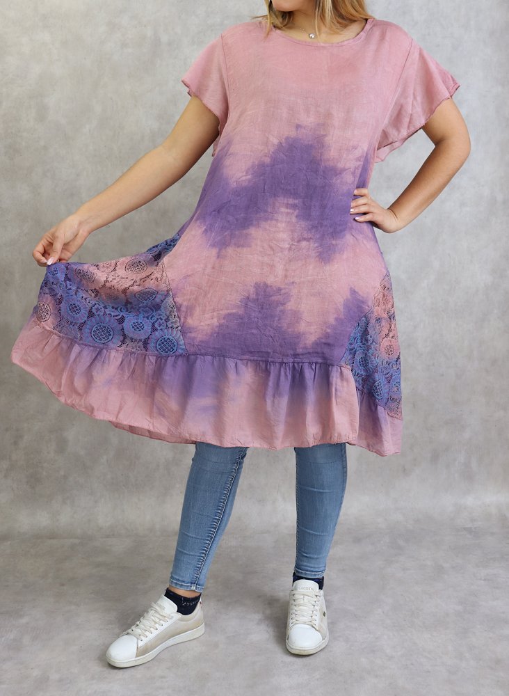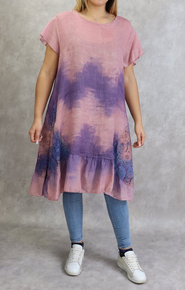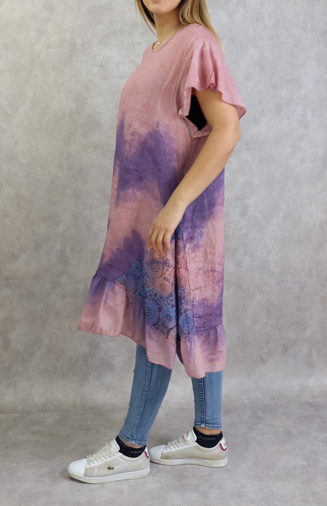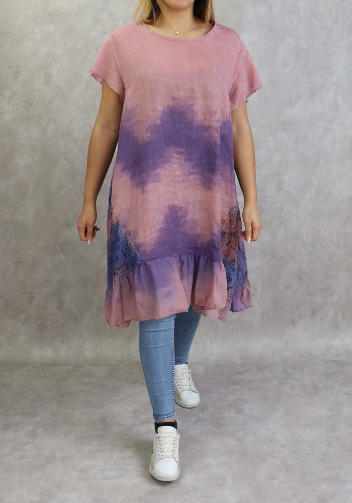 Tunique longue et ample delavee de couleur vieux rose et mauve (Coton et Lin - Grandes tailles pour femmes)