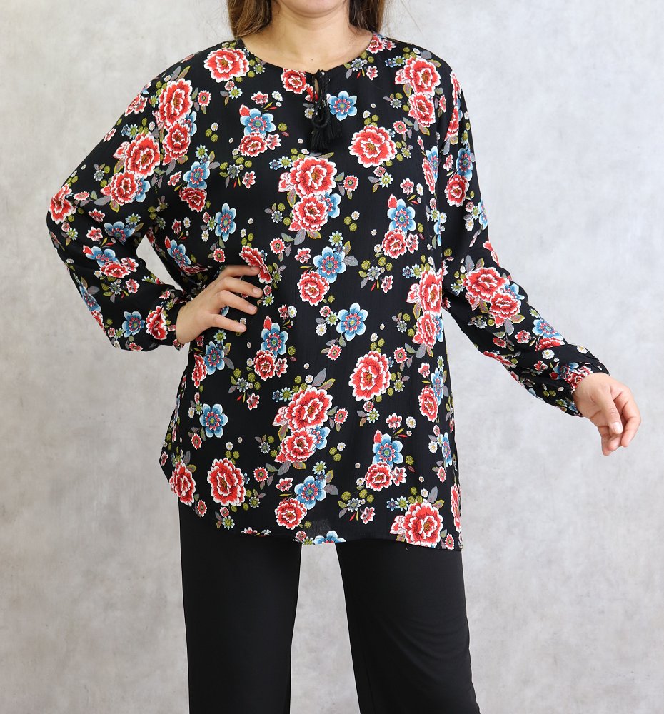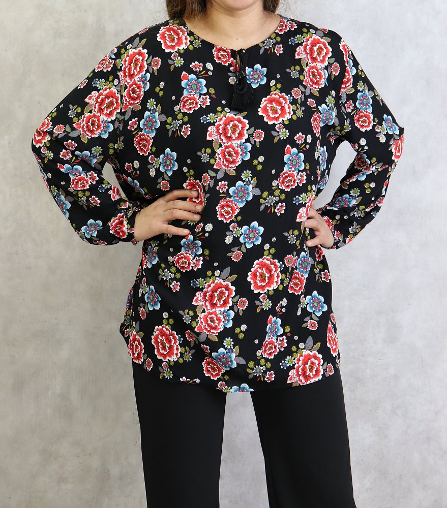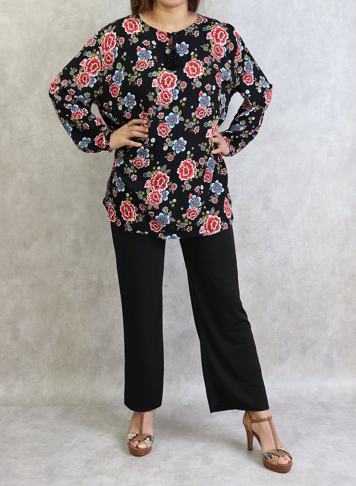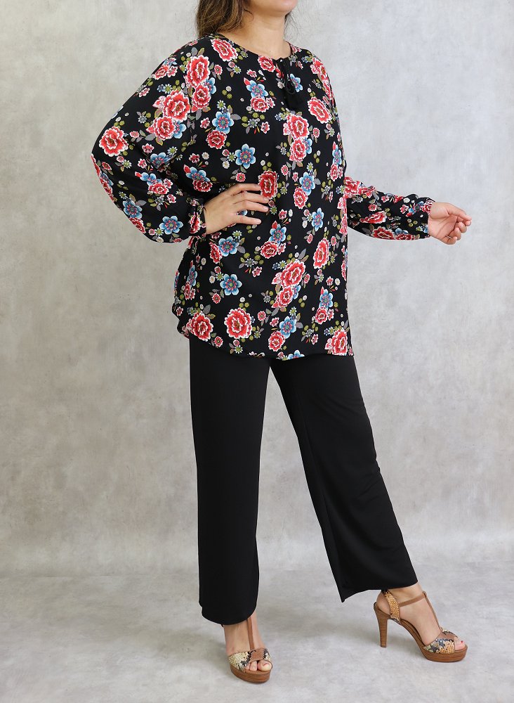 Tunique noire a fleurs rouges et bleues (Grande taille disponible pour femme)