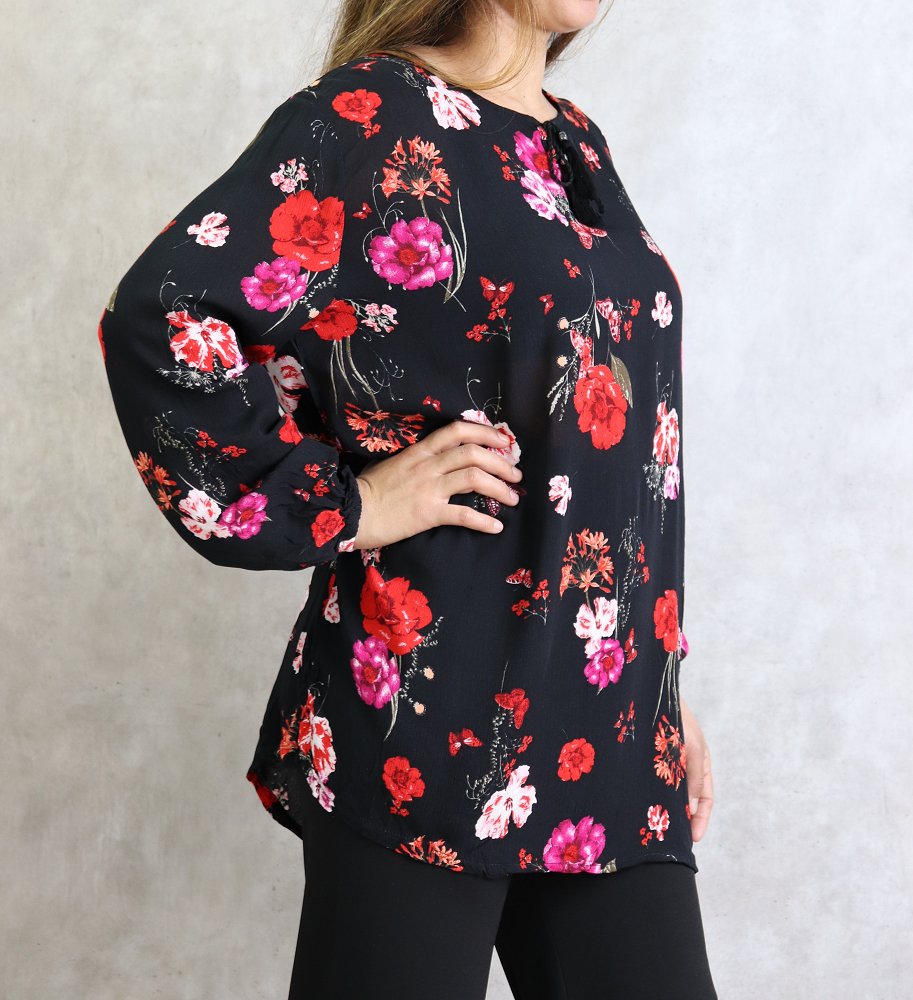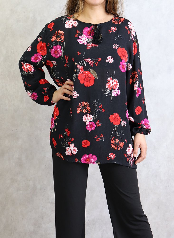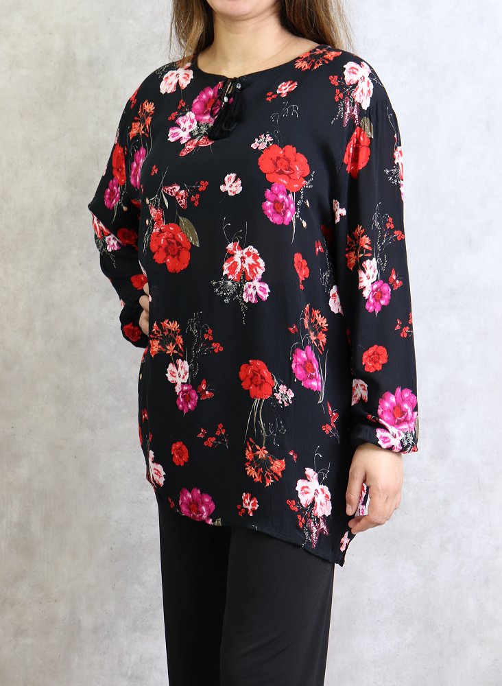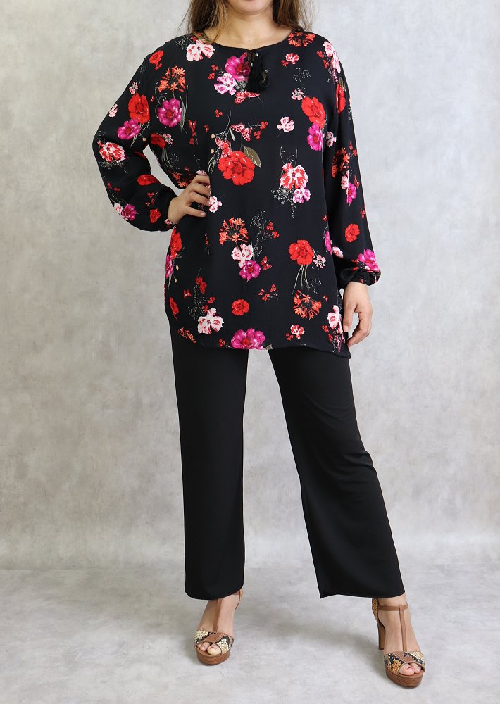 Tunique courte, col dégagé, lien de serrage, manches longues finition élastiques aux poignets. Coupe droite, tissu fluide et léger.