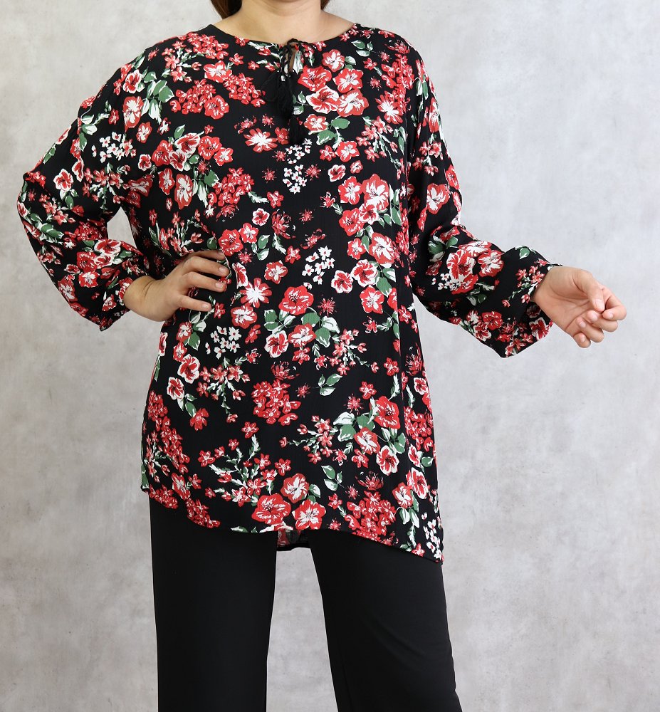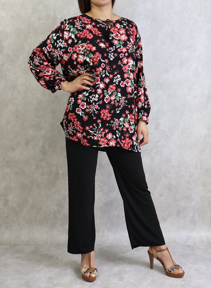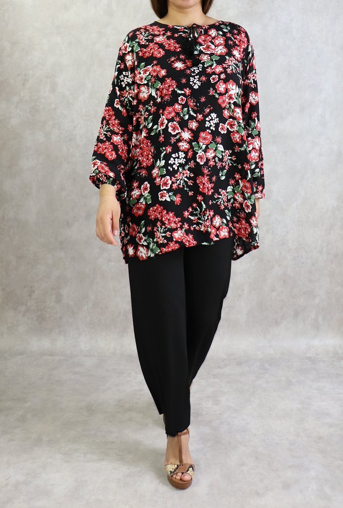 Tunique courte, col dégagé, lien de serrage, manches longues finition élastiques aux poignets. Coupe droite, tissu fluide et léger.