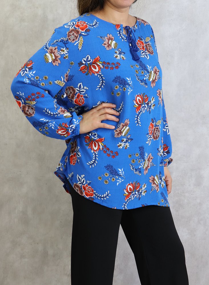 Tunique courte, col dégagé, lien de serrage, manches longues finition élastiques aux poignets. Coupe droite, tissu fluide et léger.