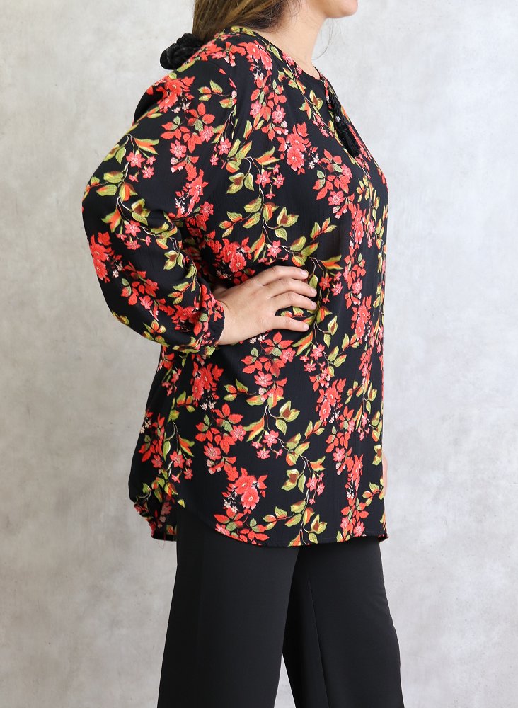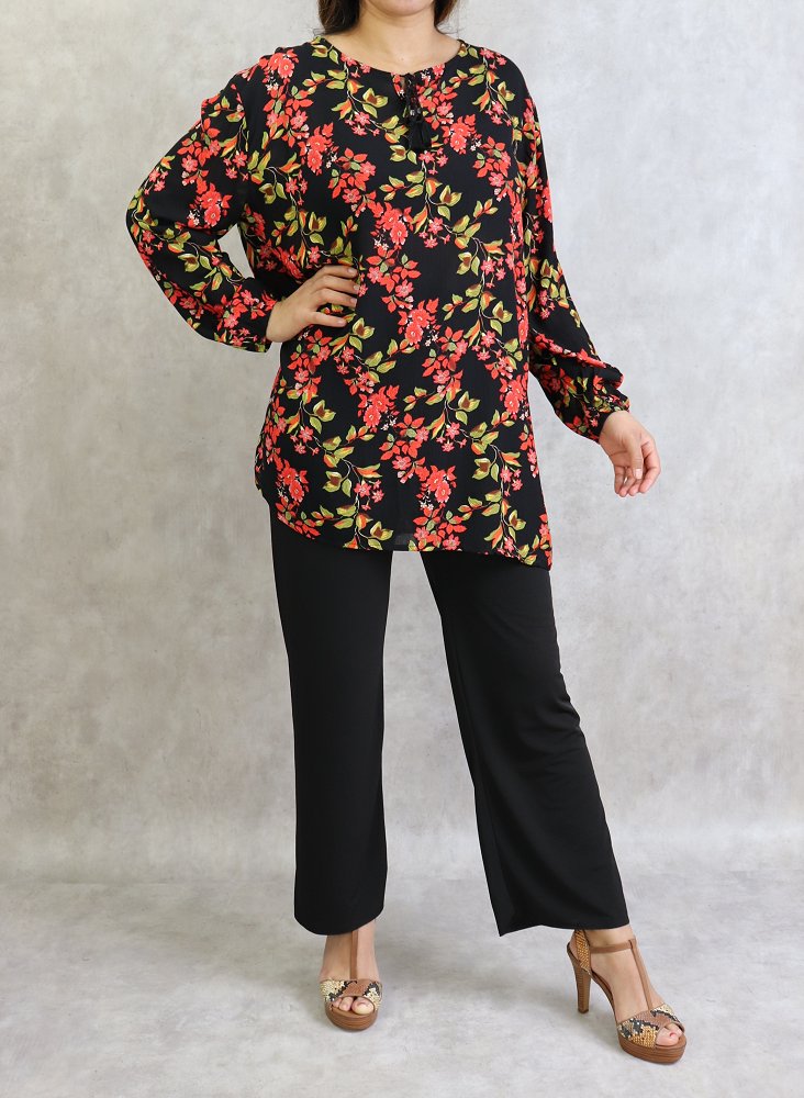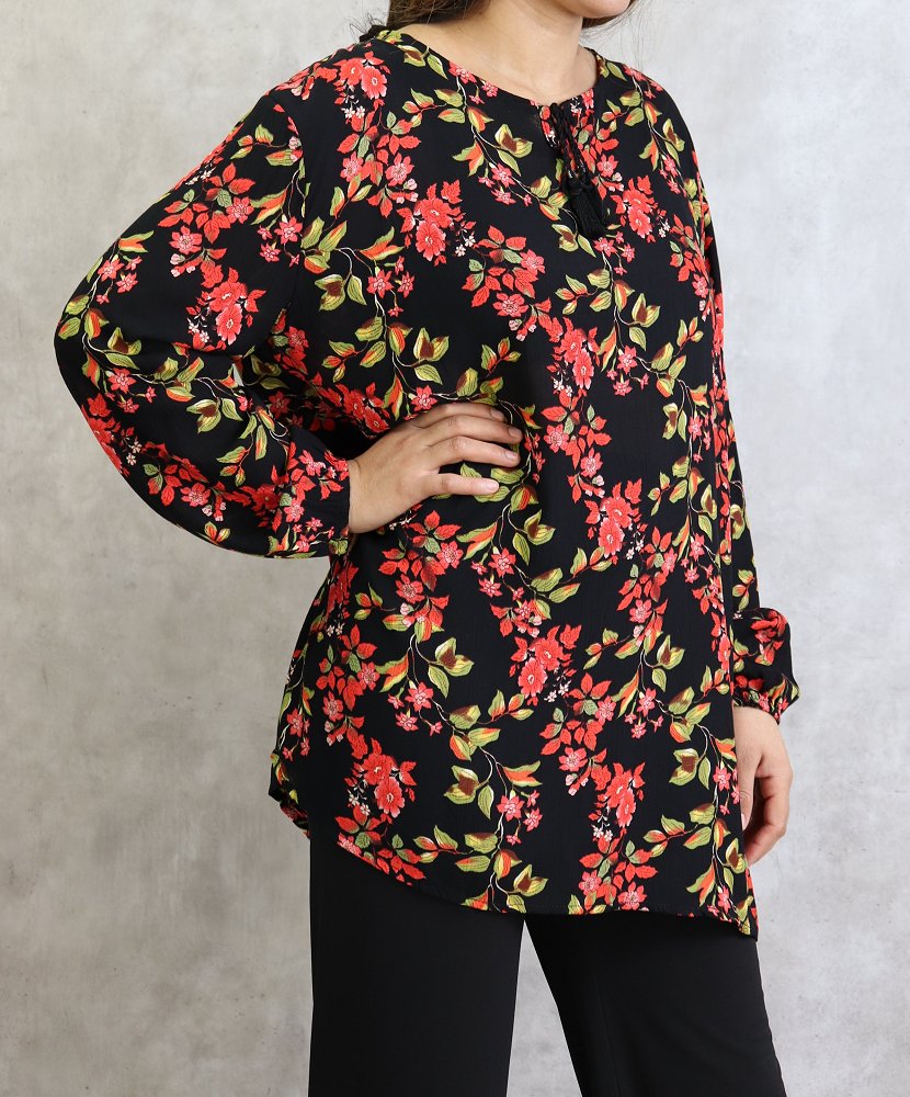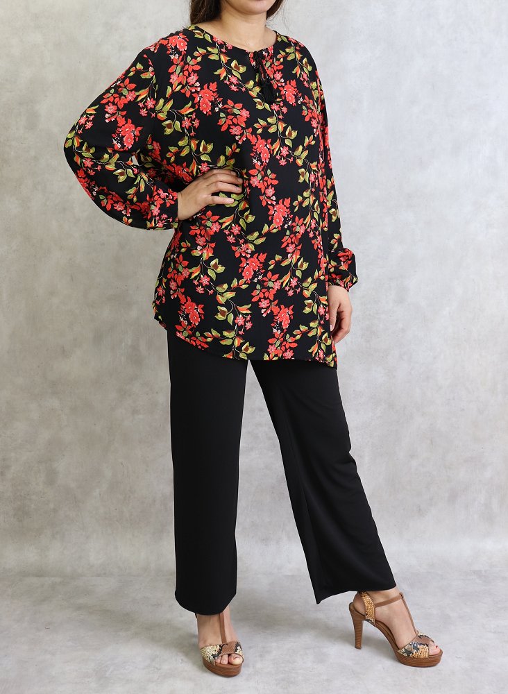 Tunique courte, col dégagé, lien de serrage, manches longues finition élastiques aux poignets. Coupe droite, tissu fluide et léger.