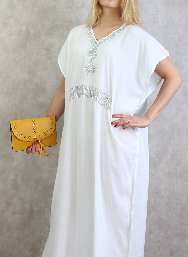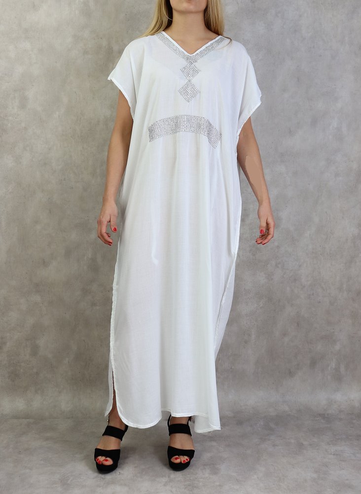 Robe gandoura marocaine avec strass argentés pour la maison - Couleur Blanc - REF. 32140 (25.00 €)