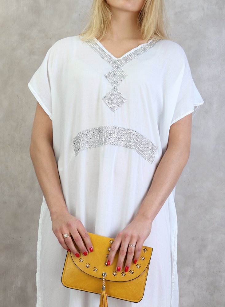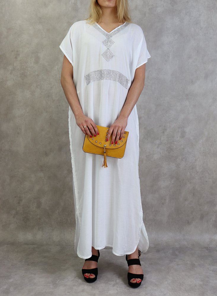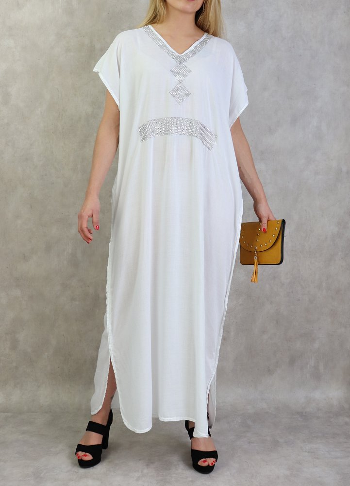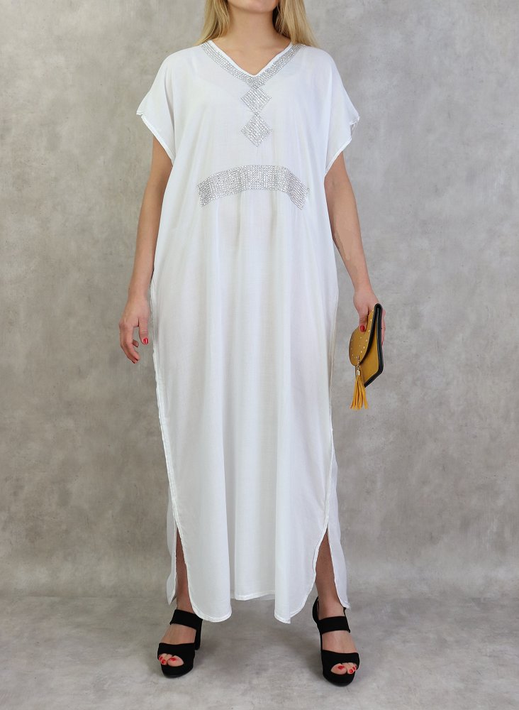 Robe gandoura marocaine avec strass argentés pour la maison - Couleur Blanc Vetement & Accessoire