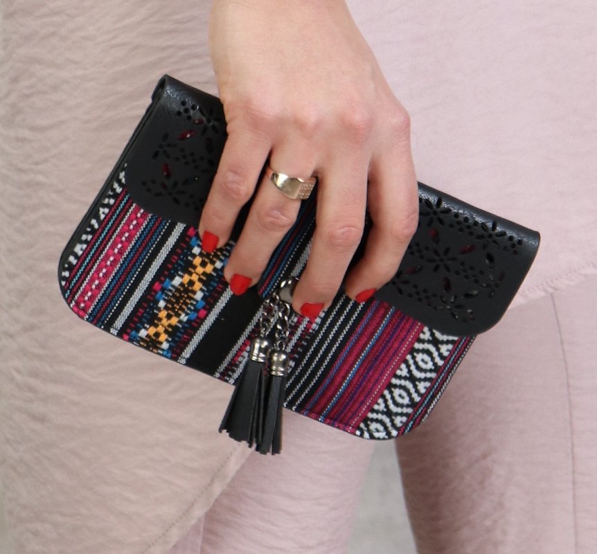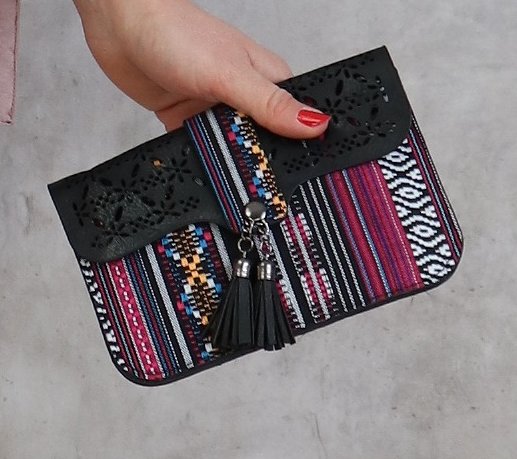 Un très joli sac à main pochette ethnique, plein de couleurs, confectionné avec d' anciennes broderies d' Inde de l' Ouest et du Pakistan. Fermeture à pression. Livré avec une bandoulière en semi cuir.