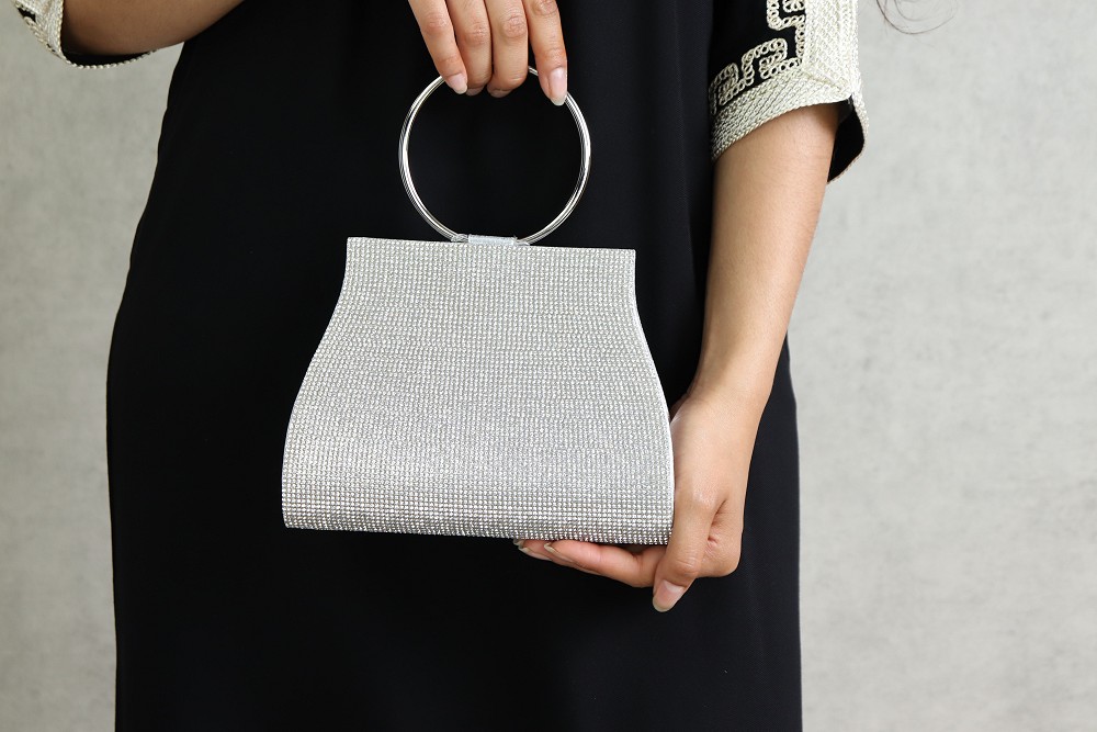 Sac a main femme entierement recouvert de strass, anse metallique ronde pour soiree, mariage et fete - Couleur argente