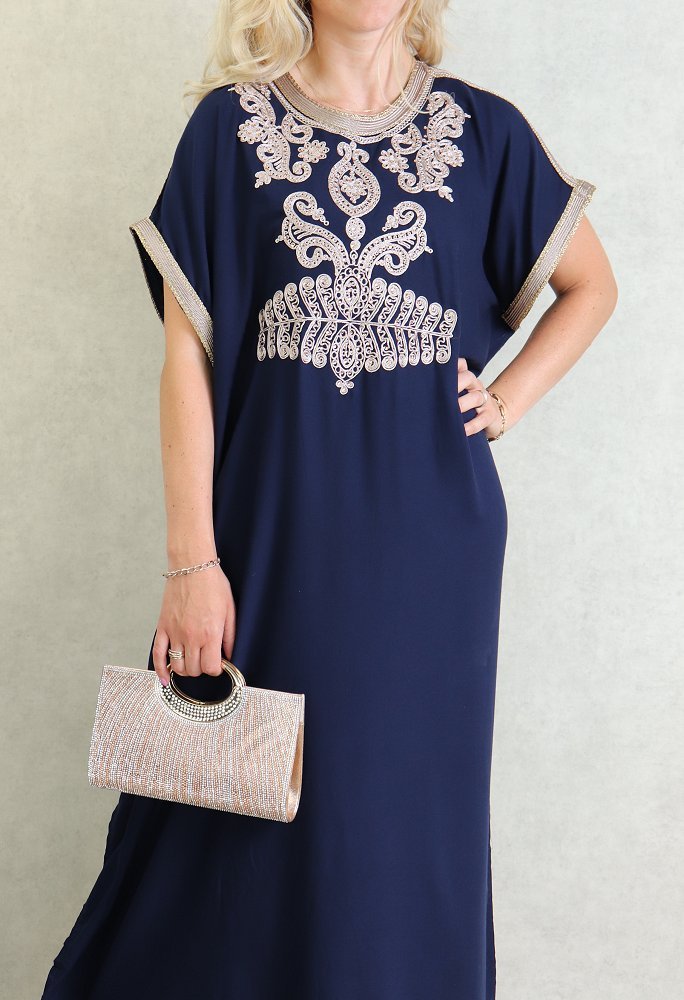 Très belle pochette pour femme avec jolies décorations à base de strass. Ouverture fermée par deux boutons-pression au niveau des poignets métalliques.