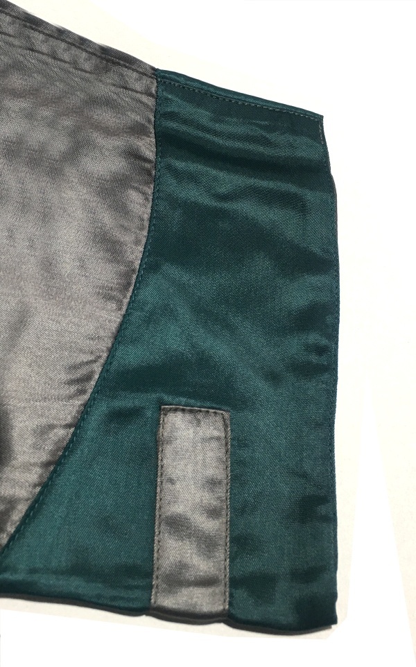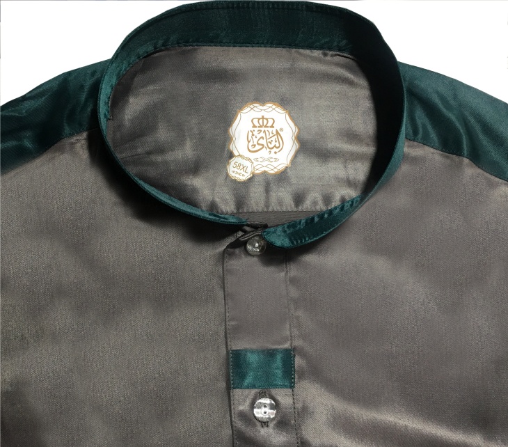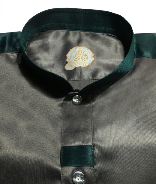 Qamis beige moderne avec poche sur le devant. Bandes décoratives vertes au niveau des épaules du devant et des poignets. Fermeture boutons argentés au niveau de la poitrine. Tissu satiné. Col mao.
