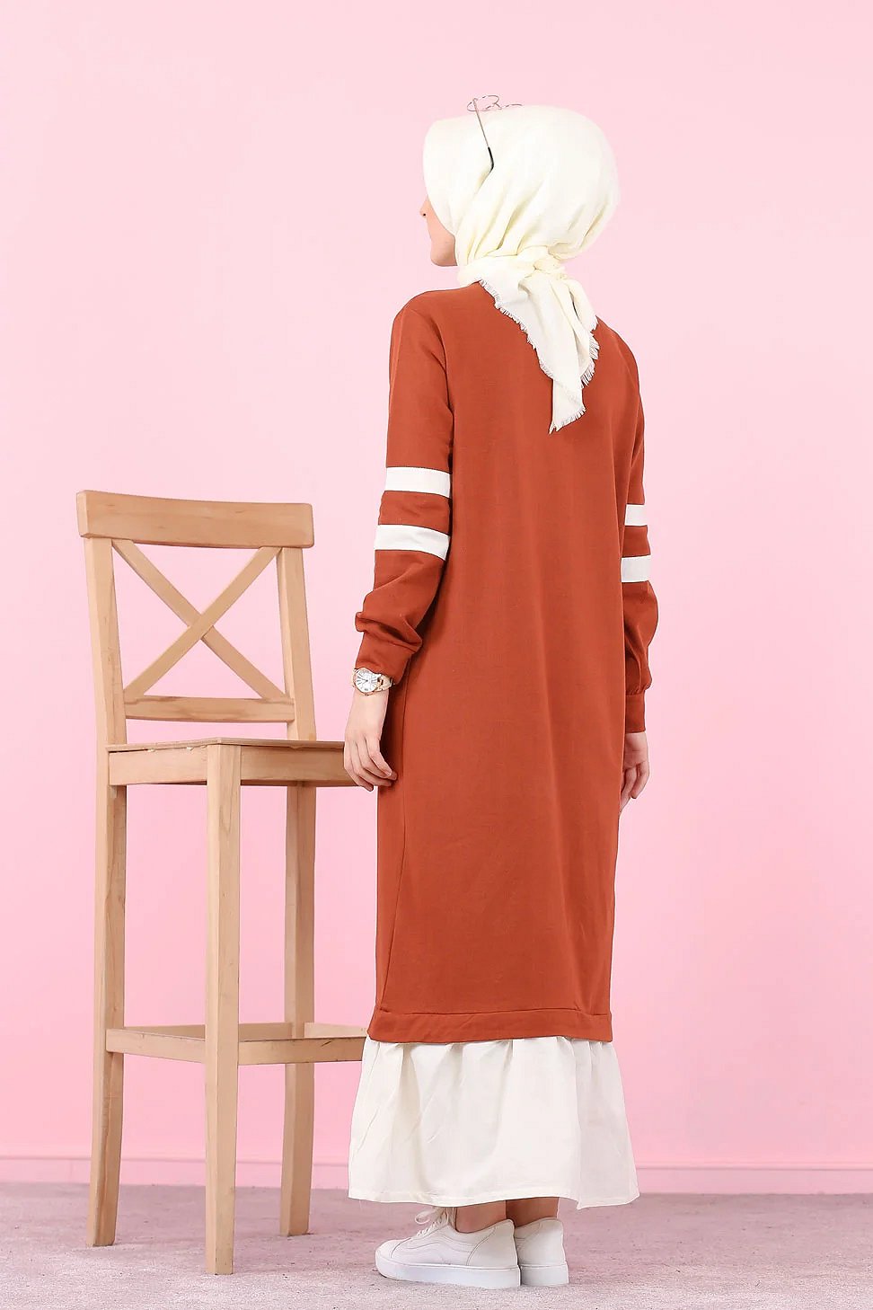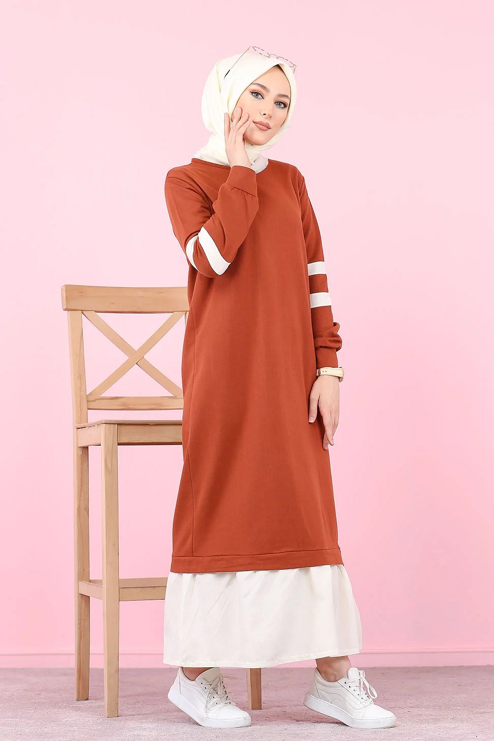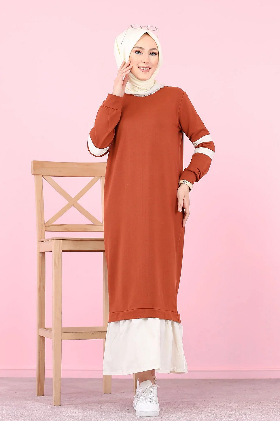 Robe longue style décontracté moderne bi-couleur (Vetement pas cher pour femme voilée) - Couleur brique et blanc Vetement & Accessoire