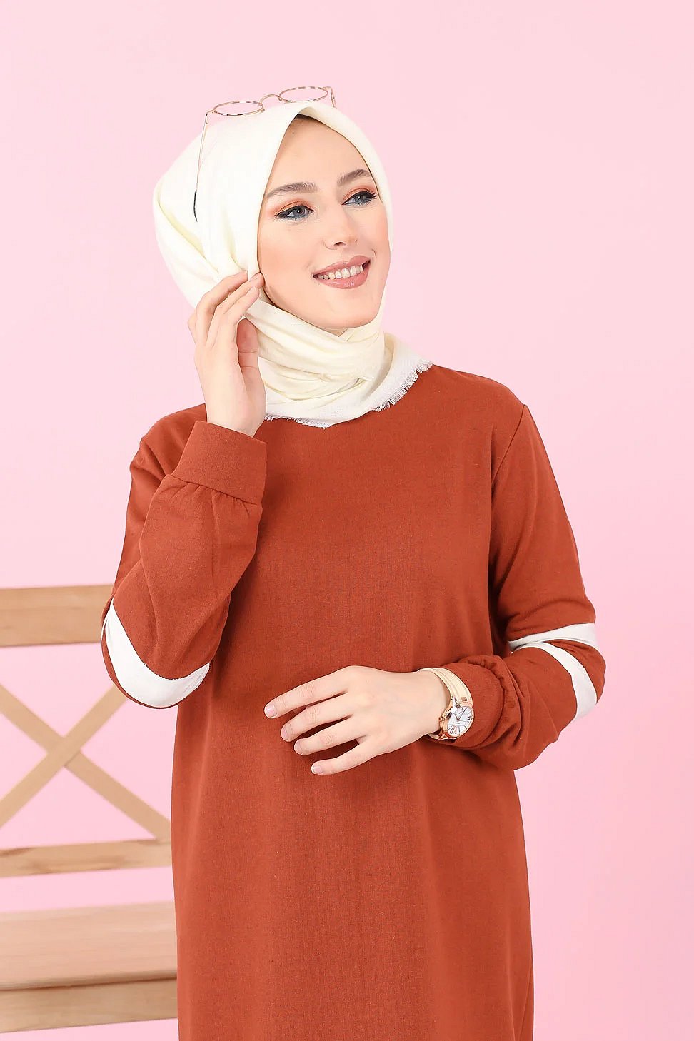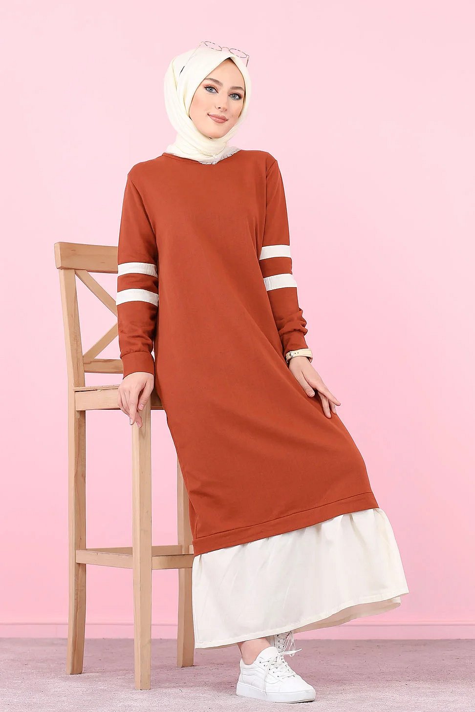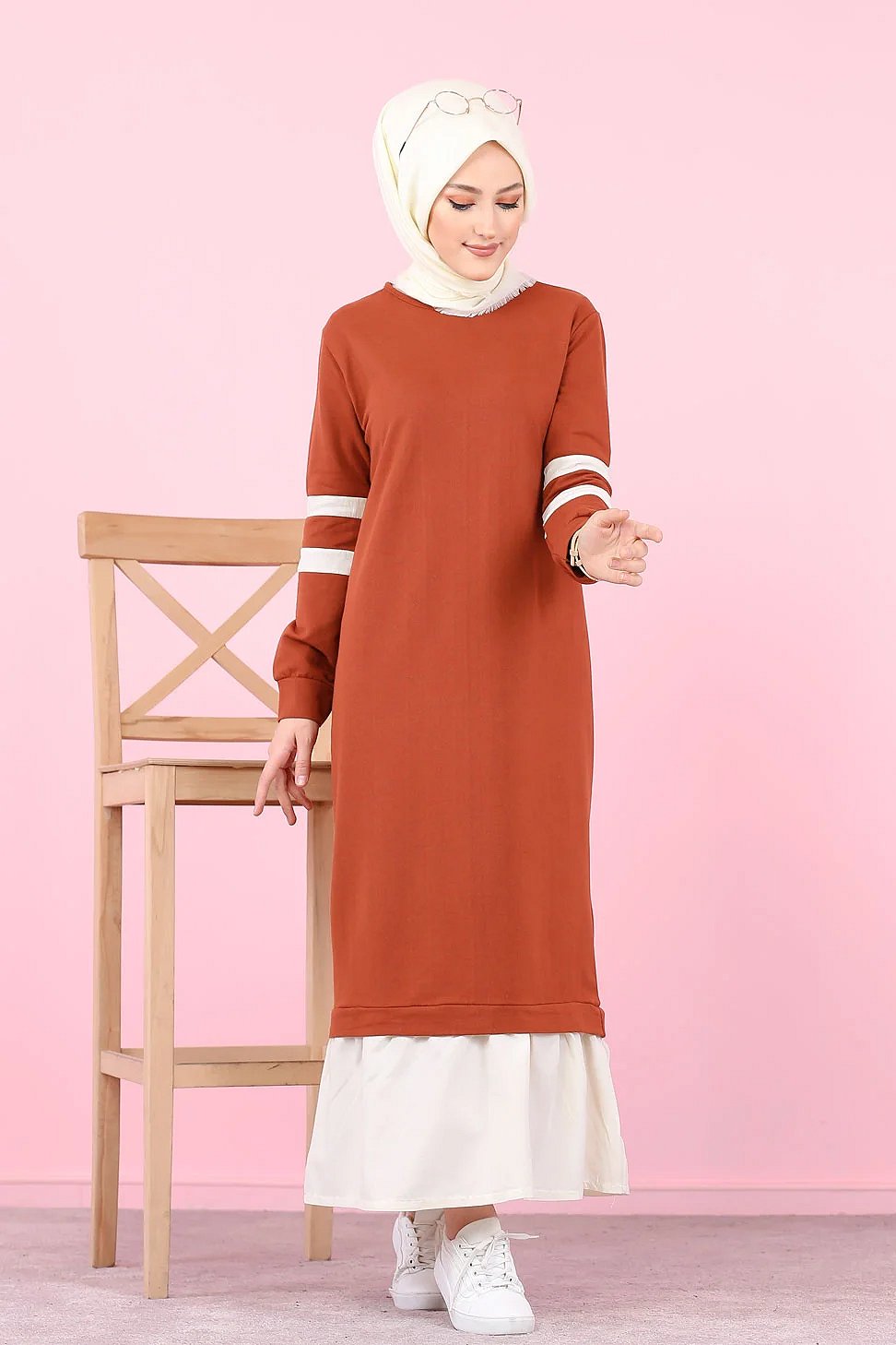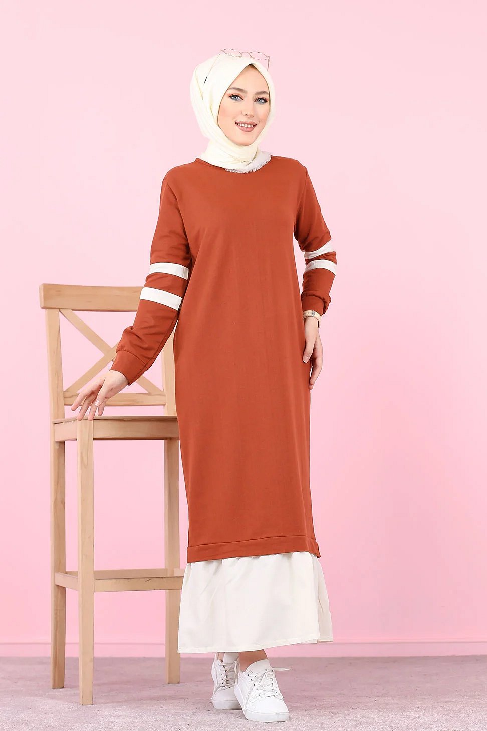 Robe longue style décontracté moderne bi-couleur (Vetement pas cher pour femme voilée) - Couleur brique et blanc Vetement & Accessoire