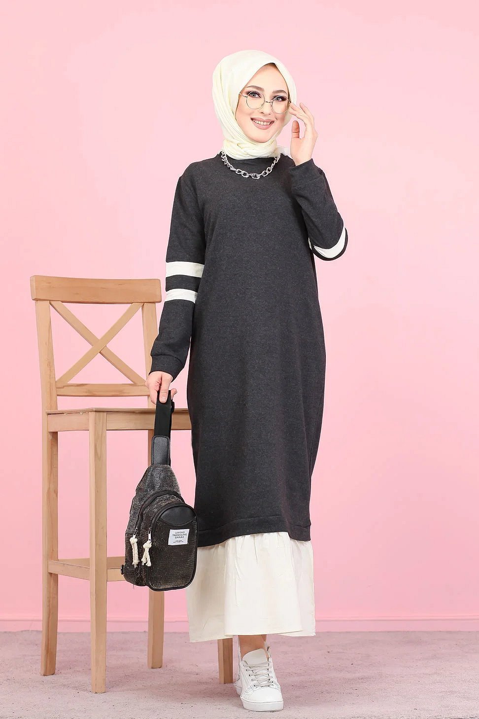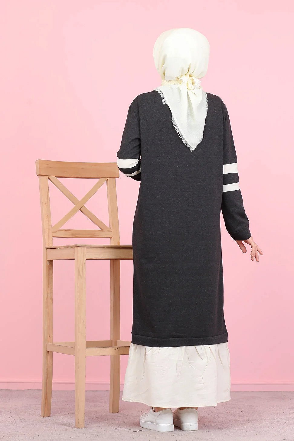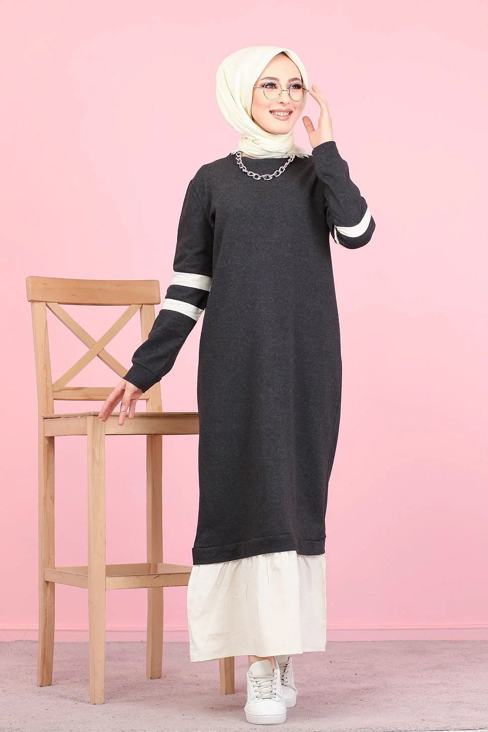 Robe longue moderne bi-couleur (Vetement hijab pas cher de Turquie pour femme voilée) - Couleur gris anthracite et blanc Vetement & Accessoire