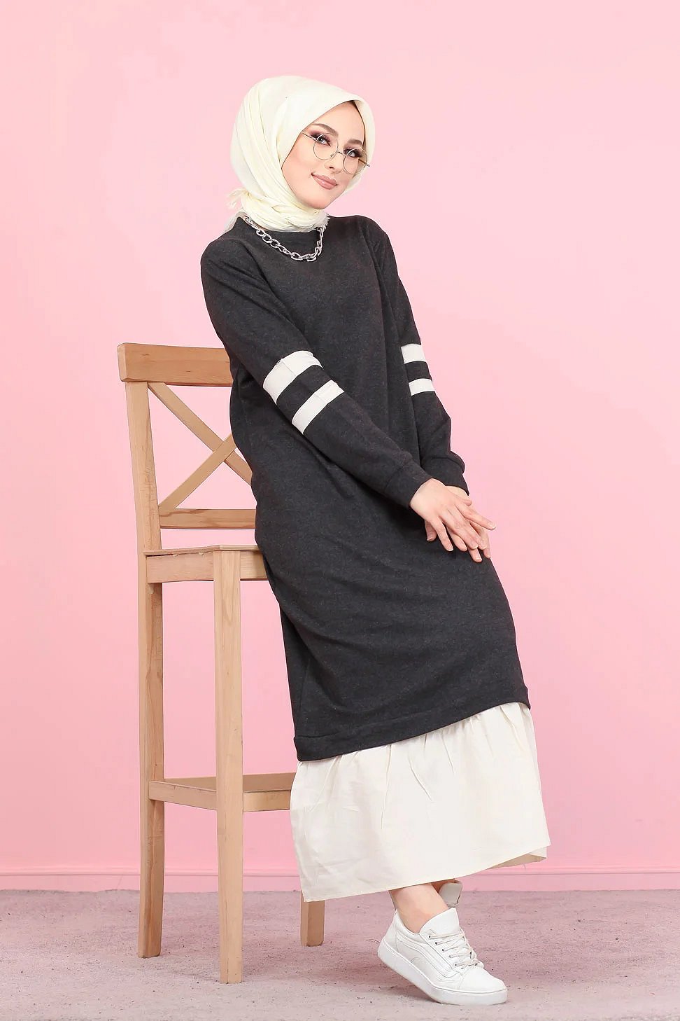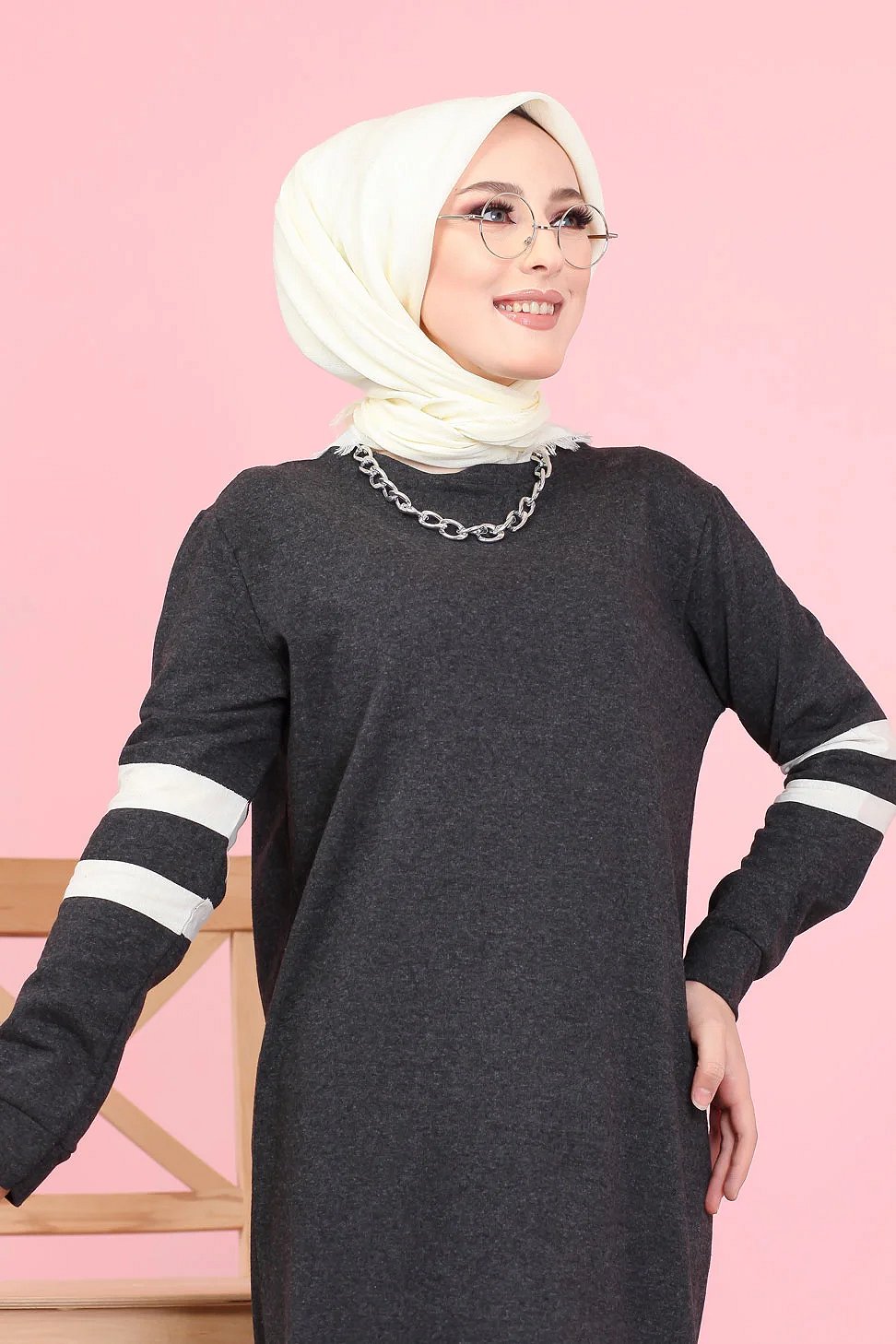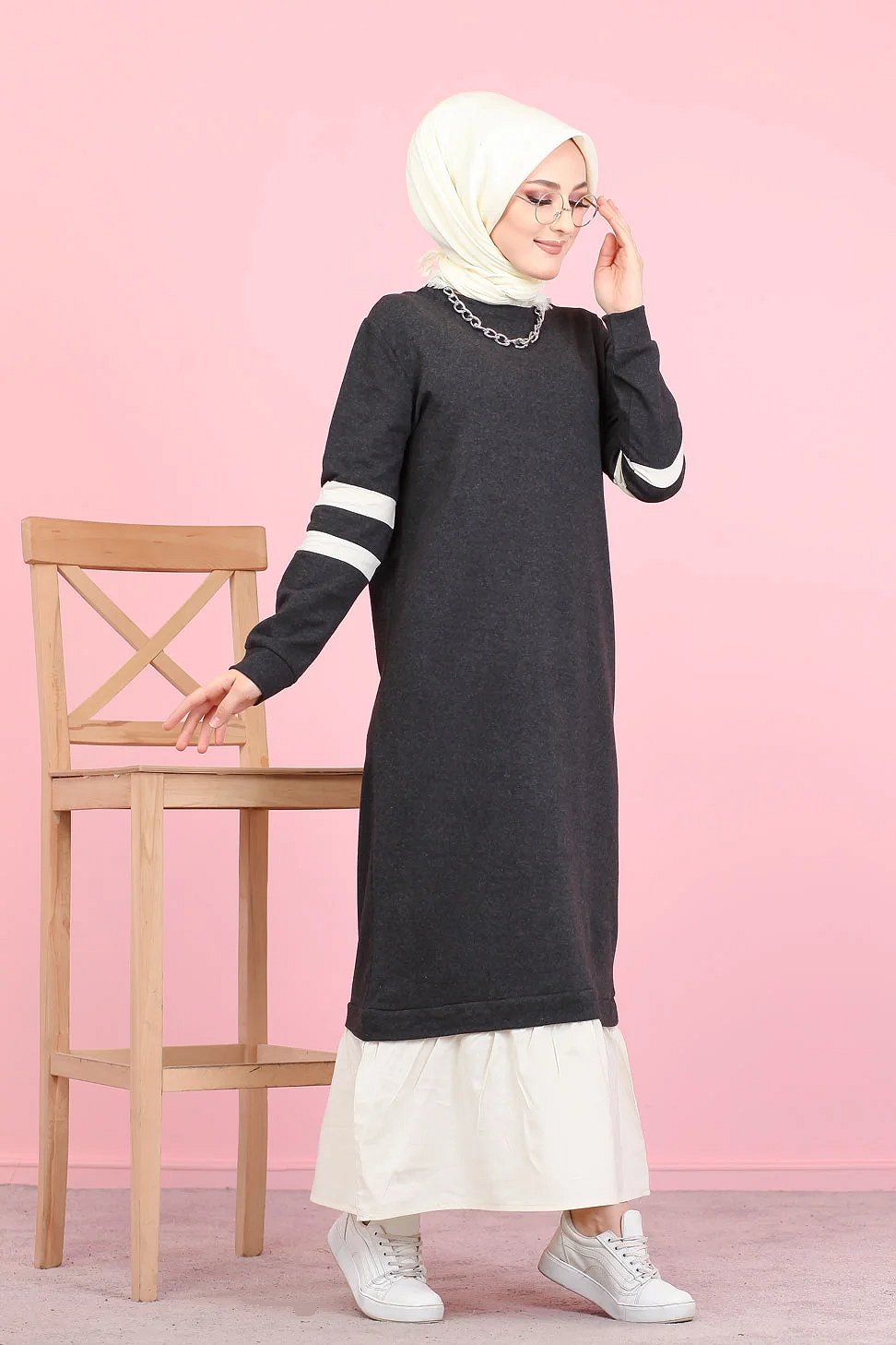 Robe longue moderne bi-couleur (Vetement hijab pas cher de Turquie pour femme voilée) - Couleur gris anthracite et blanc Vetement & Accessoire