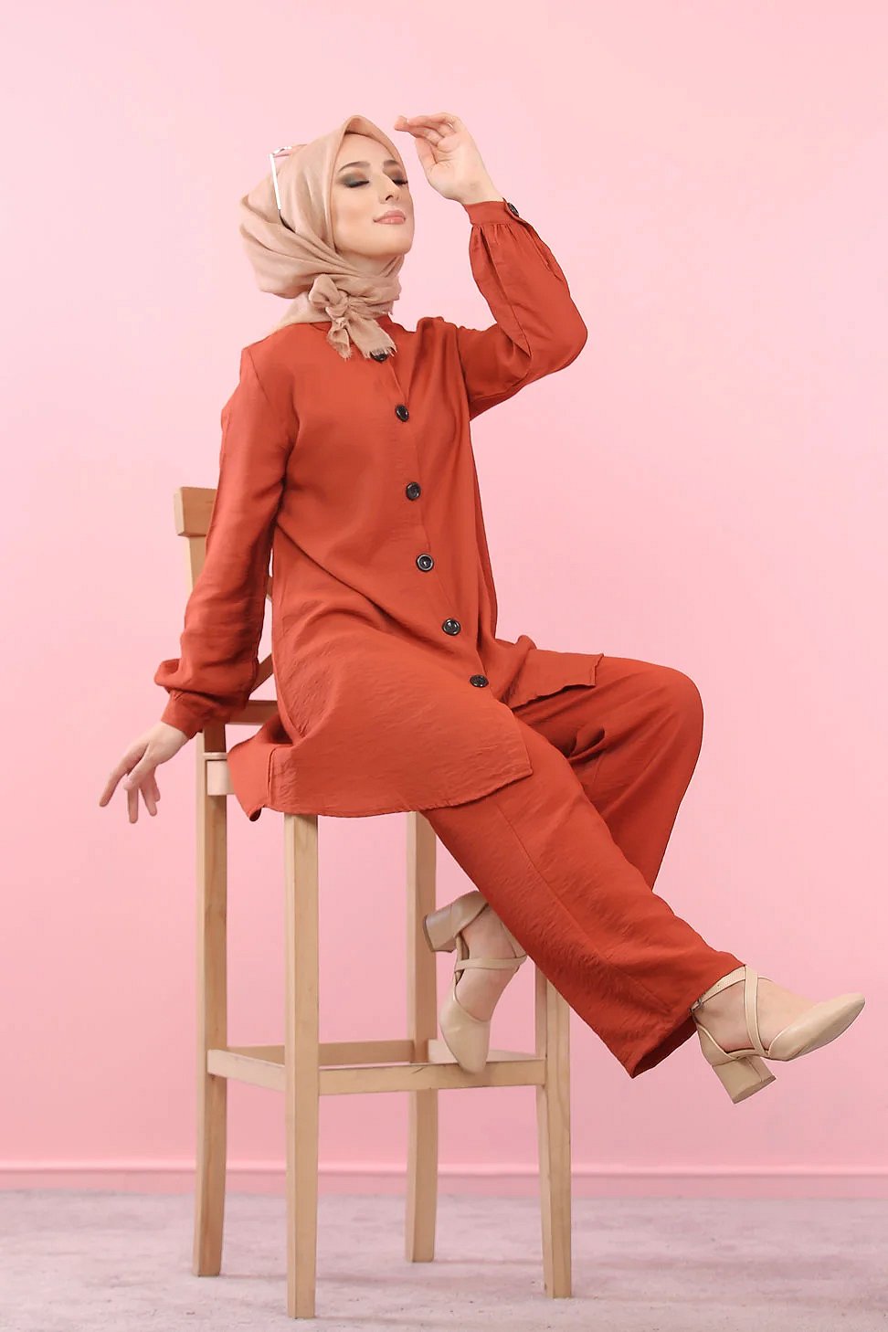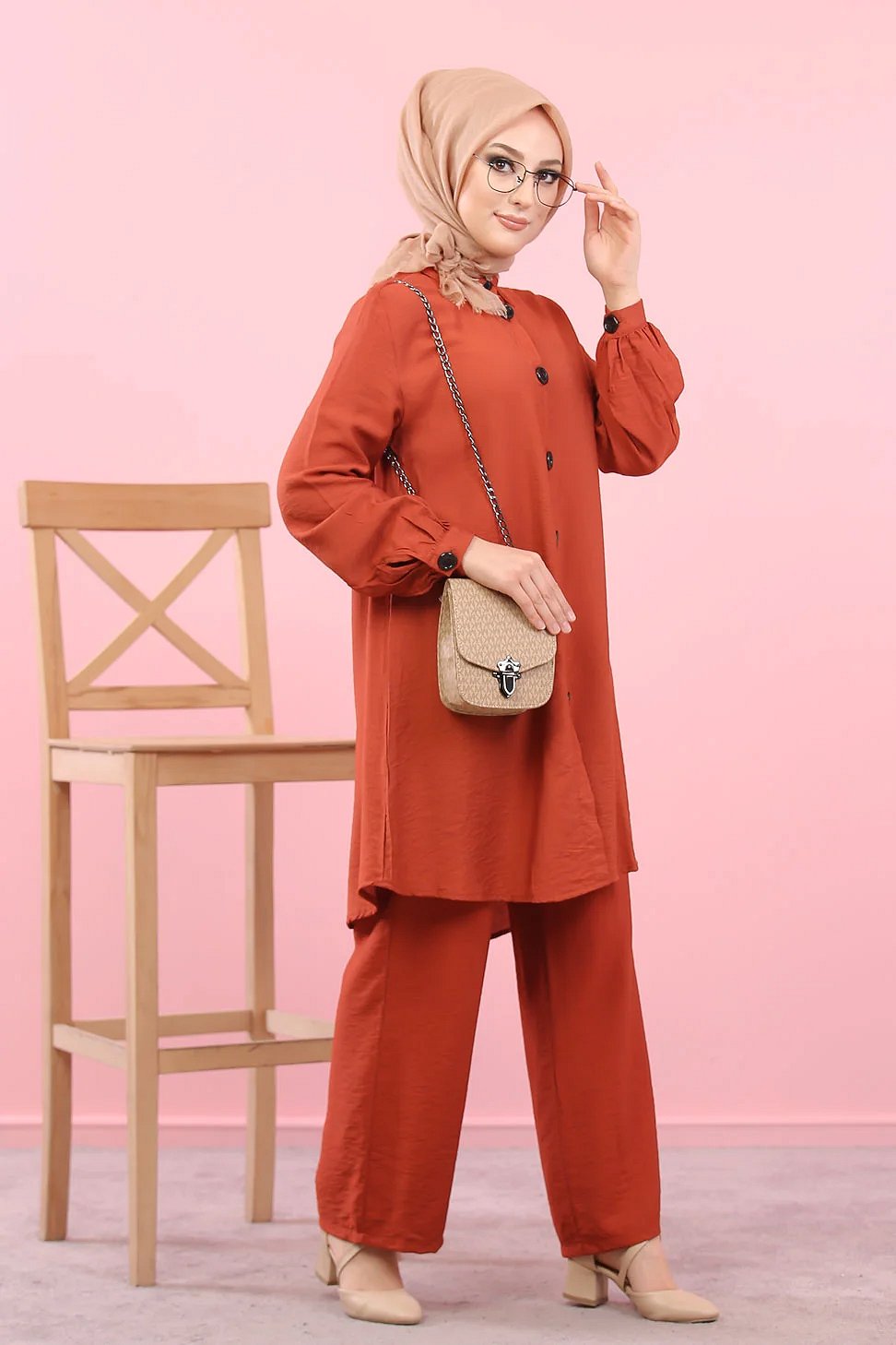 Ensemble tunique boutonnée et pantalon assorti (Vêtement femme voilée Turquie) - Couleur vison - REF. 36017 (36.90 €)