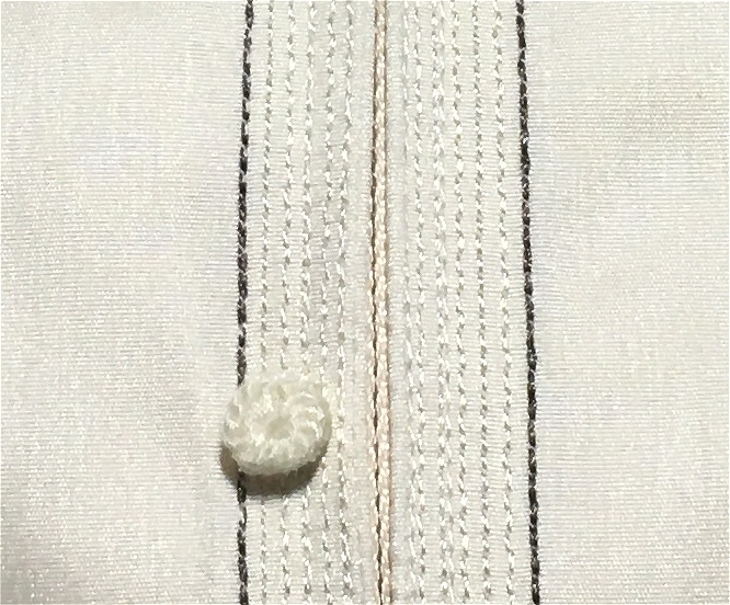 Tissu fluide et très agréable de qualité supérieure, légèrement satiné, toutes saisons. Très bonnes coutures et finitions. Décoration au niveau de la poitrine et des poignets. Deux grandes poches latérales.
