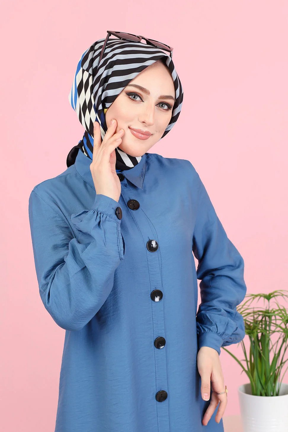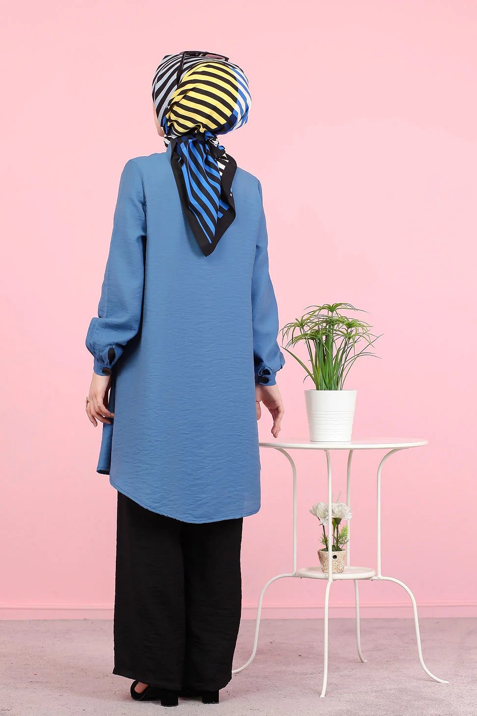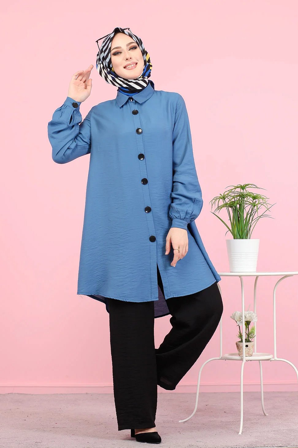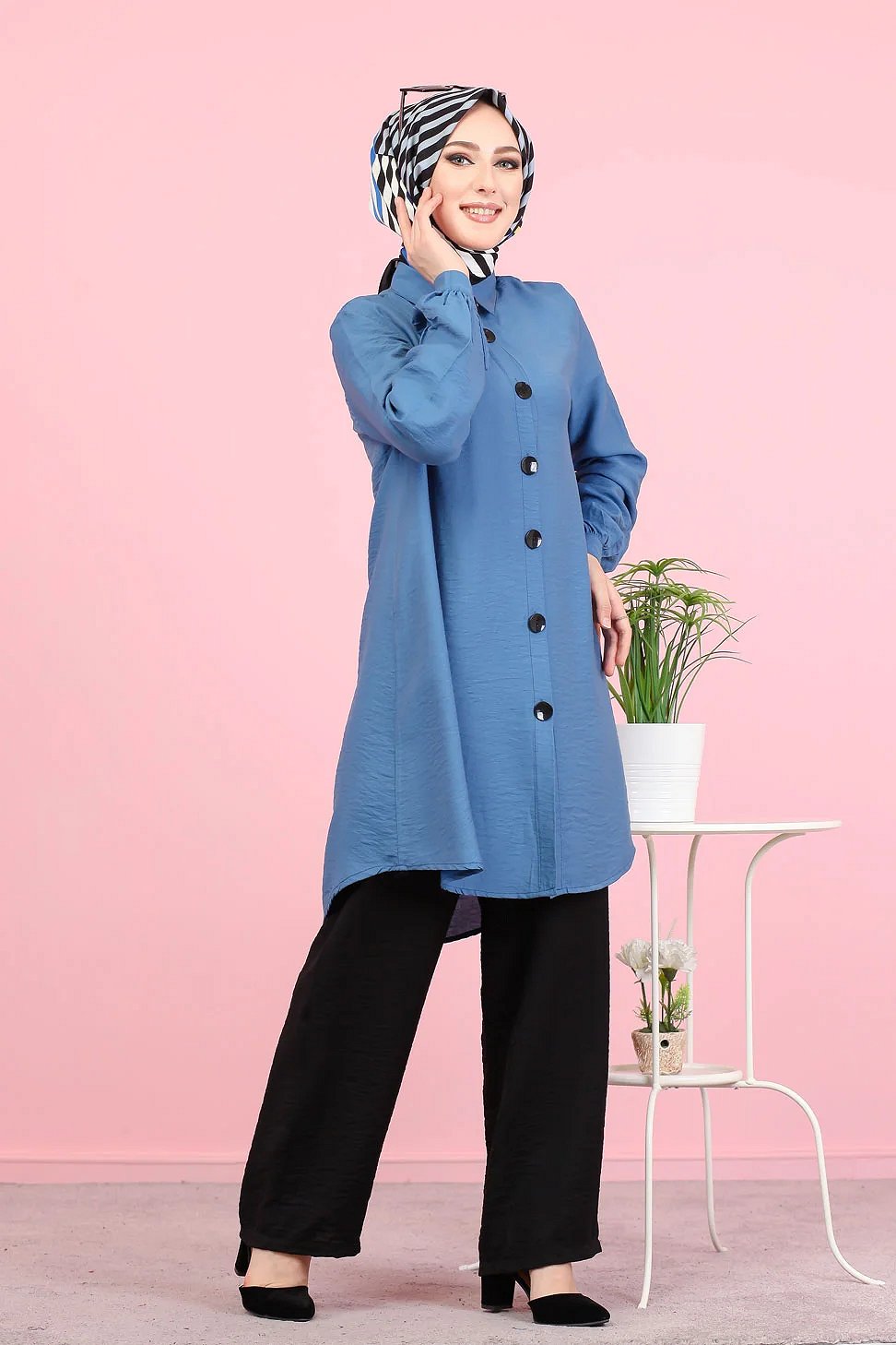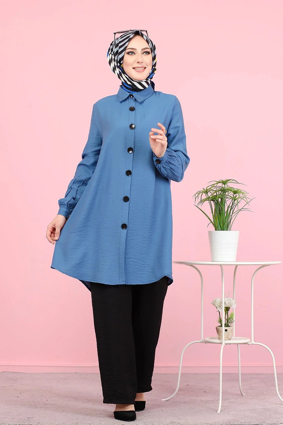 Chemise mi-longue fluide ample légèrement brillante (Vetement femme voilée) - Couleur Bleu Vetement & Accessoire