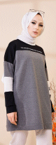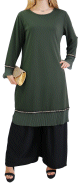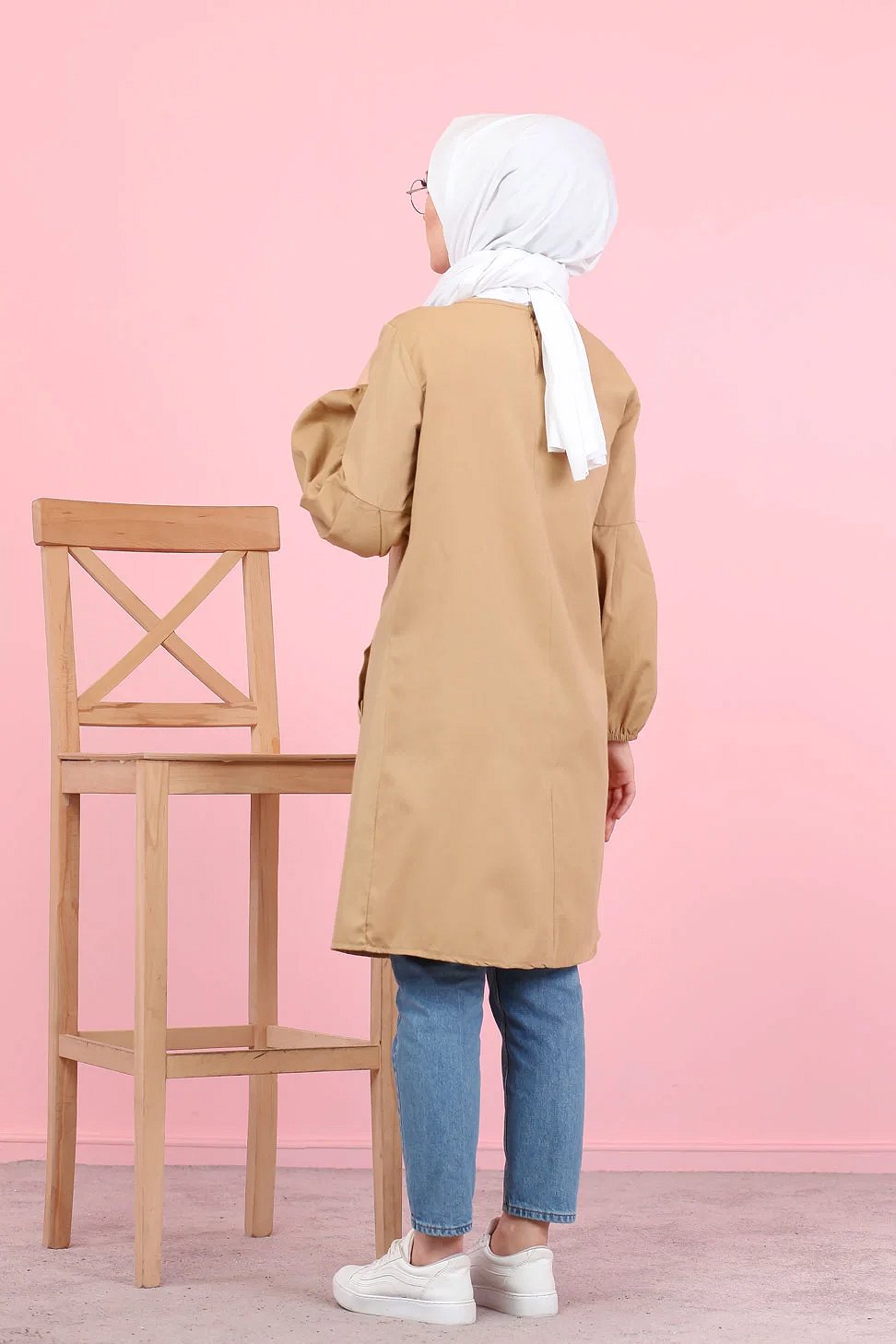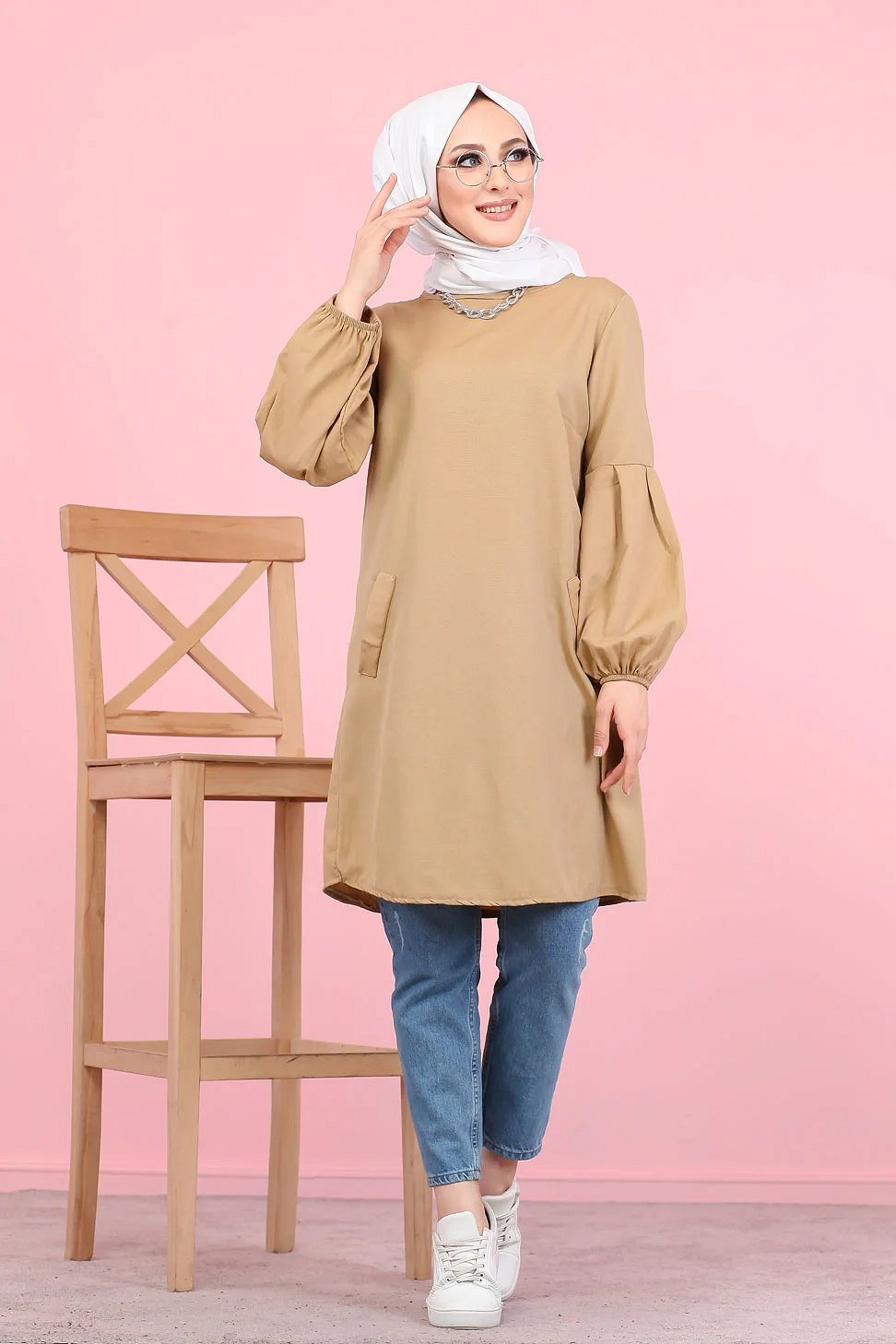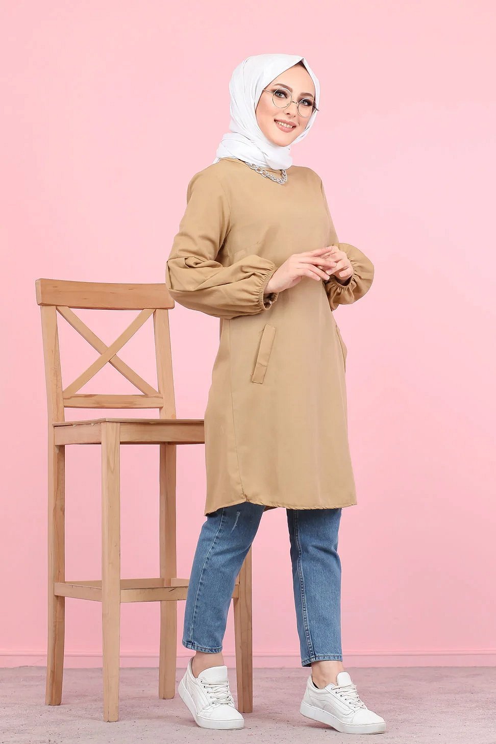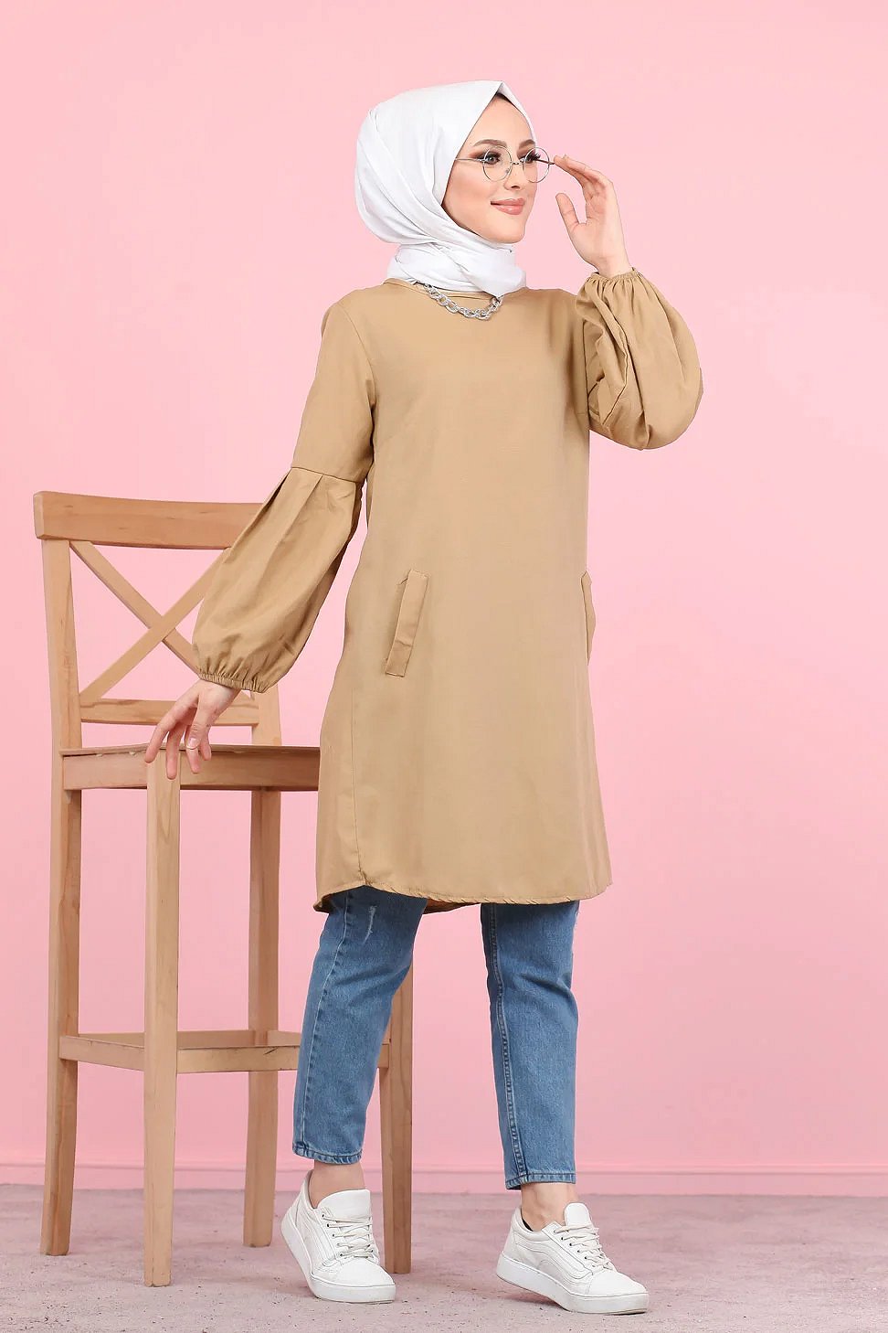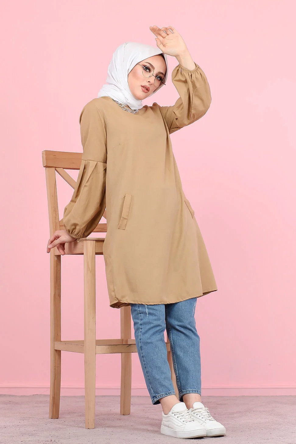 Tunique mi longue, col arrondi, manches légèrement bouffantes finition élastique, fermeture bouton au dos, deux fausses poches latérales, tissu léger mais non transparent.