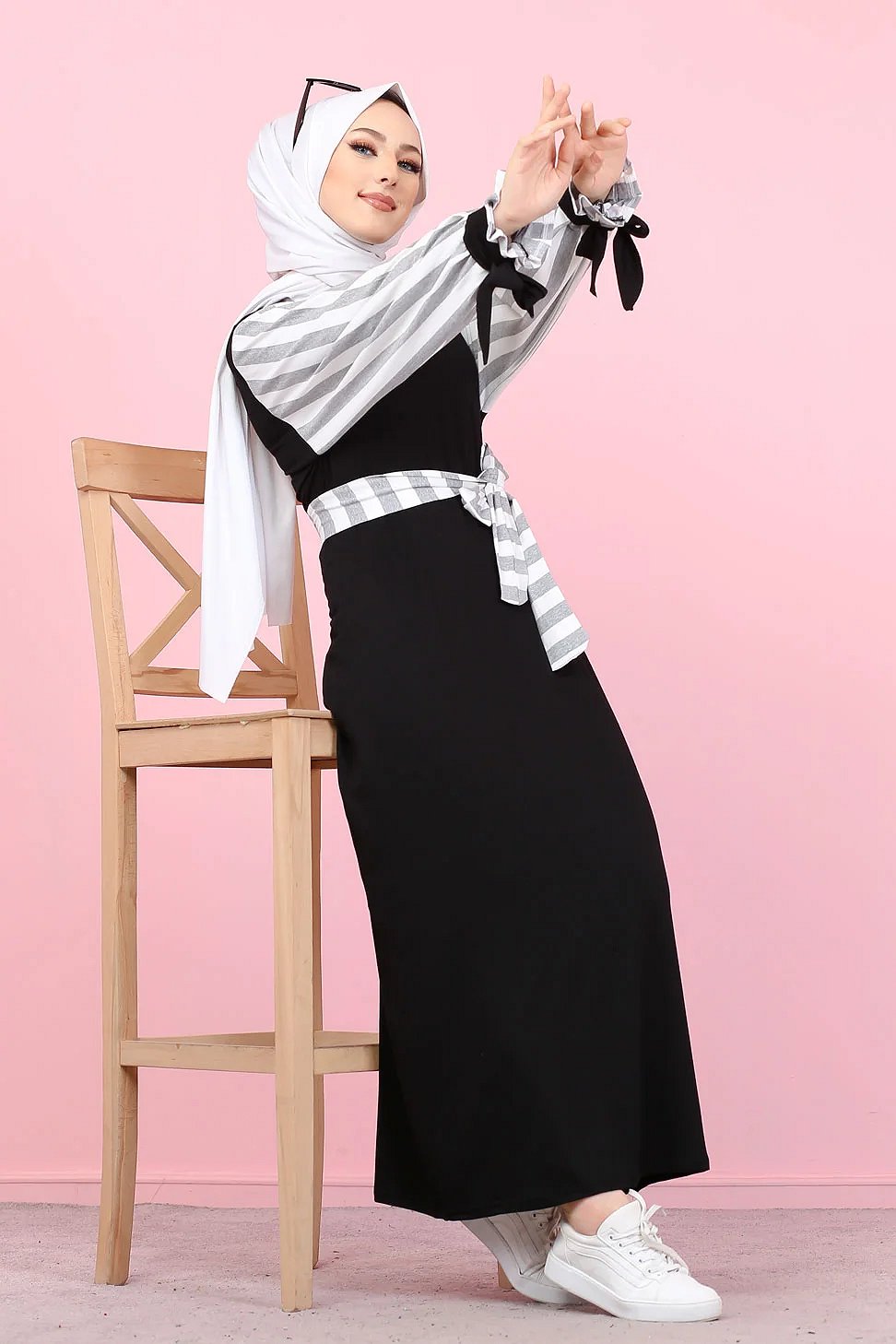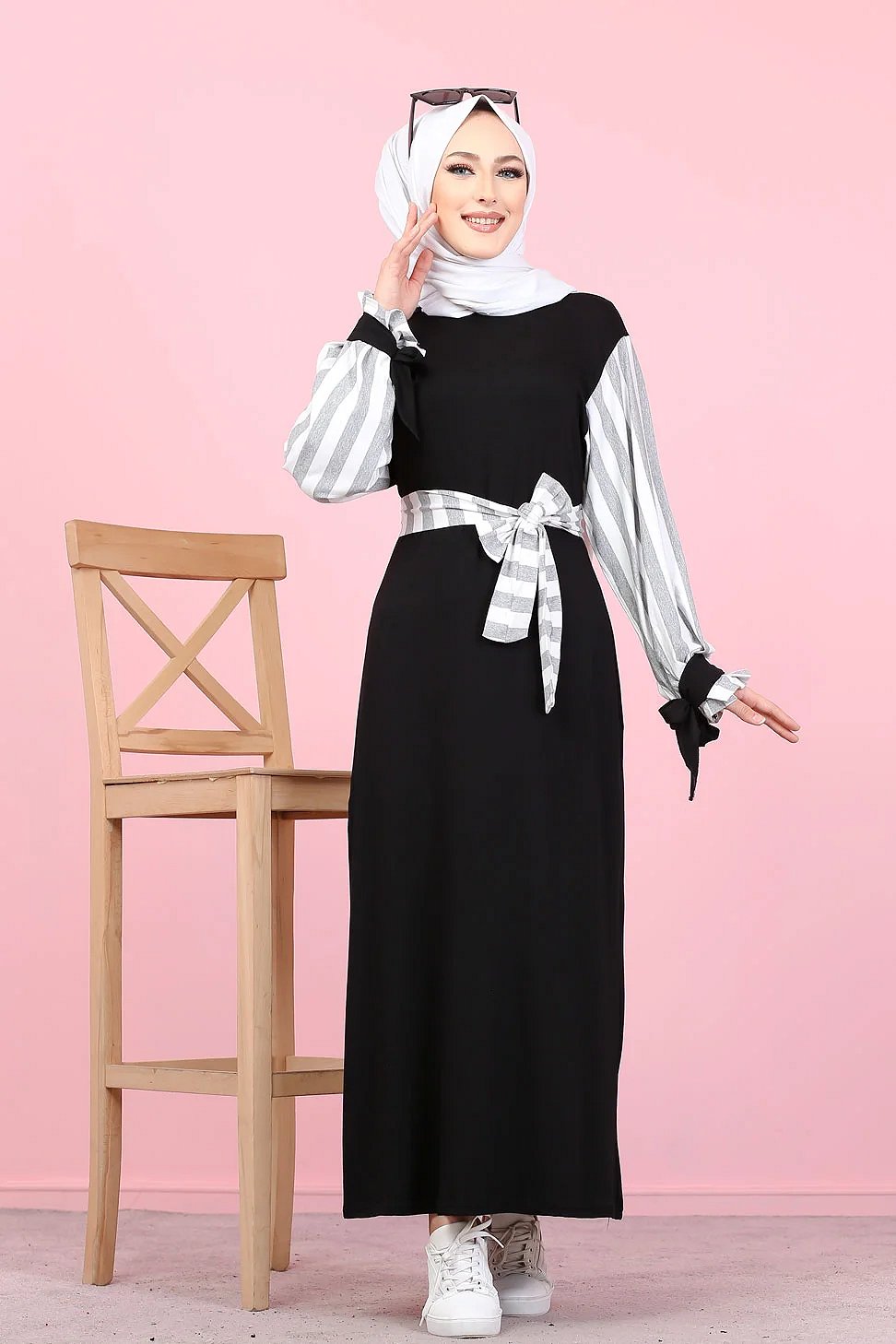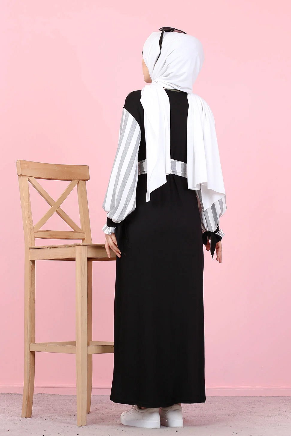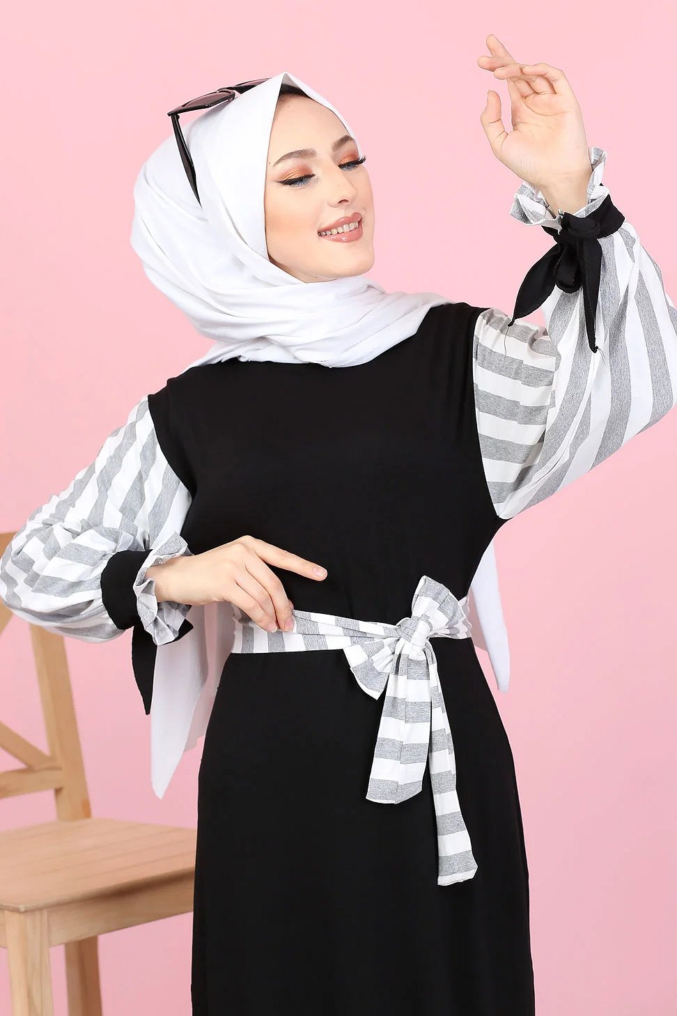 Robe longue noire à manches à rayures Grise et blanches (Grande taille disponible) Vetement & Accessoire