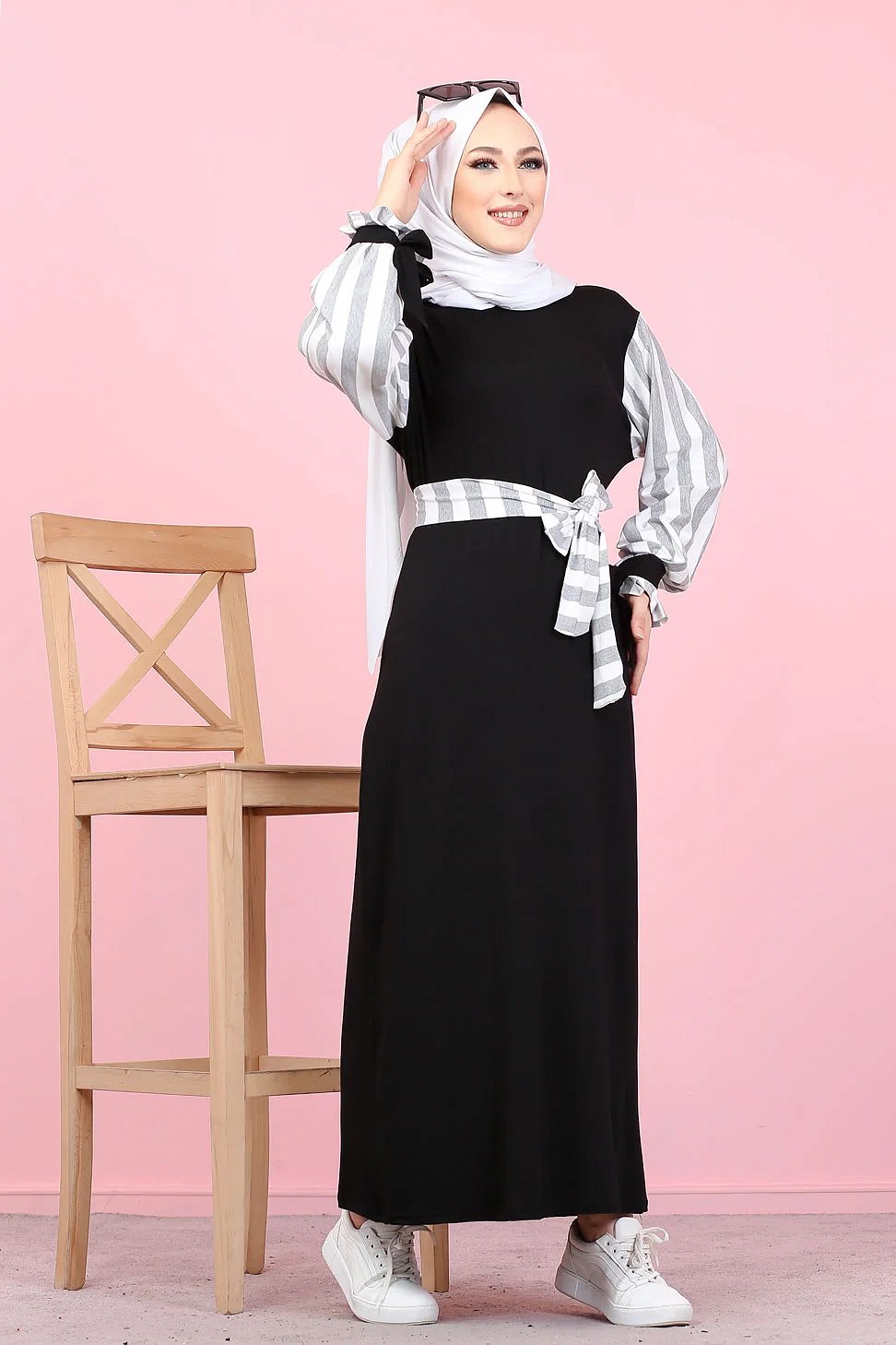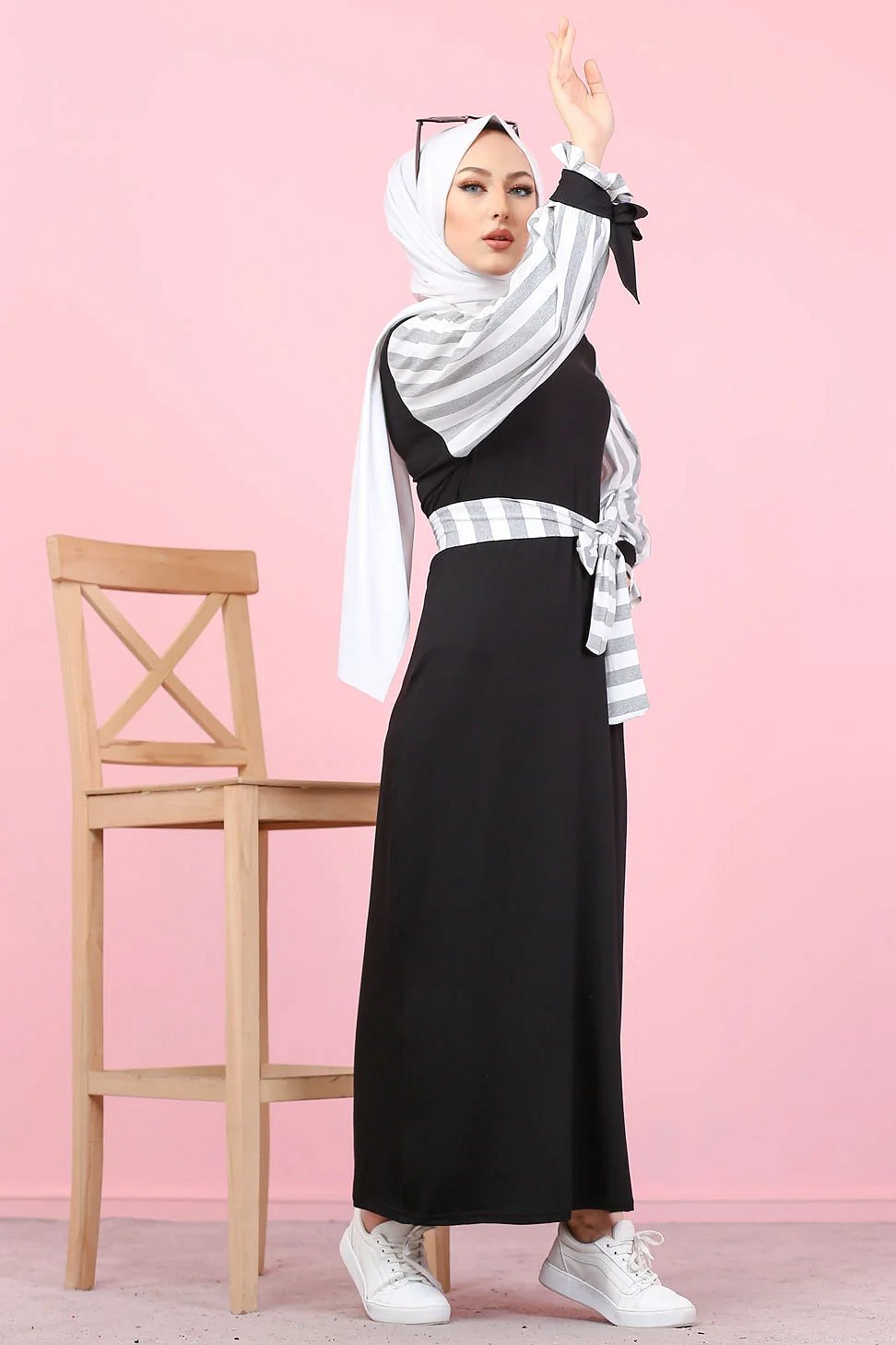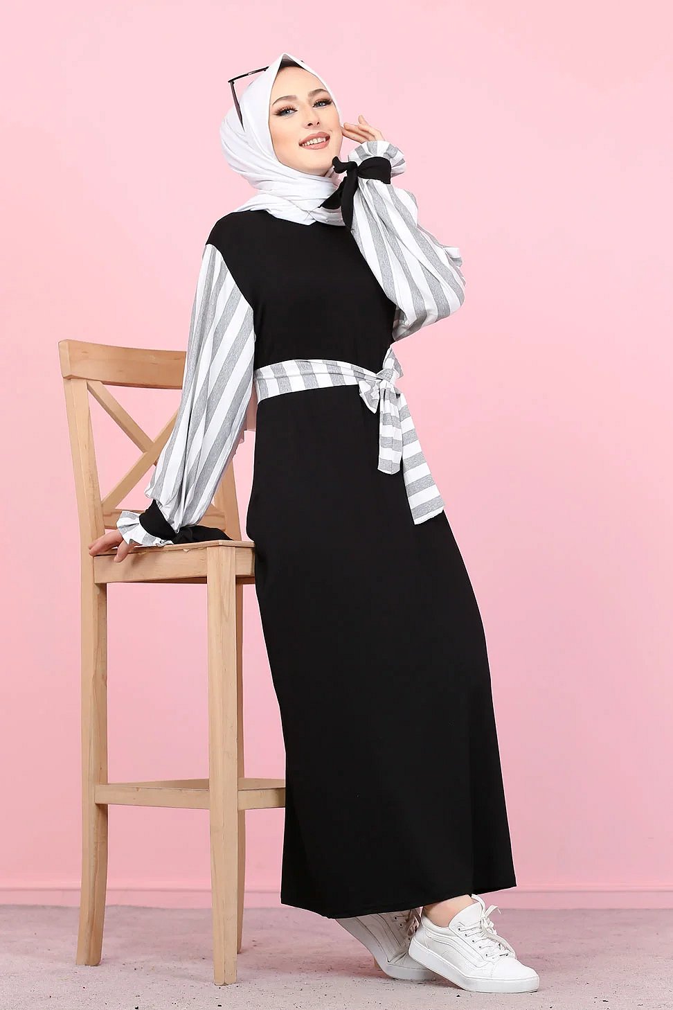 Robe pour femme musulmane - Ceinture et manche à rayure noir et blanc (Grande taille disponible) - Couleur prune - REF. 33256 (24.90 €)