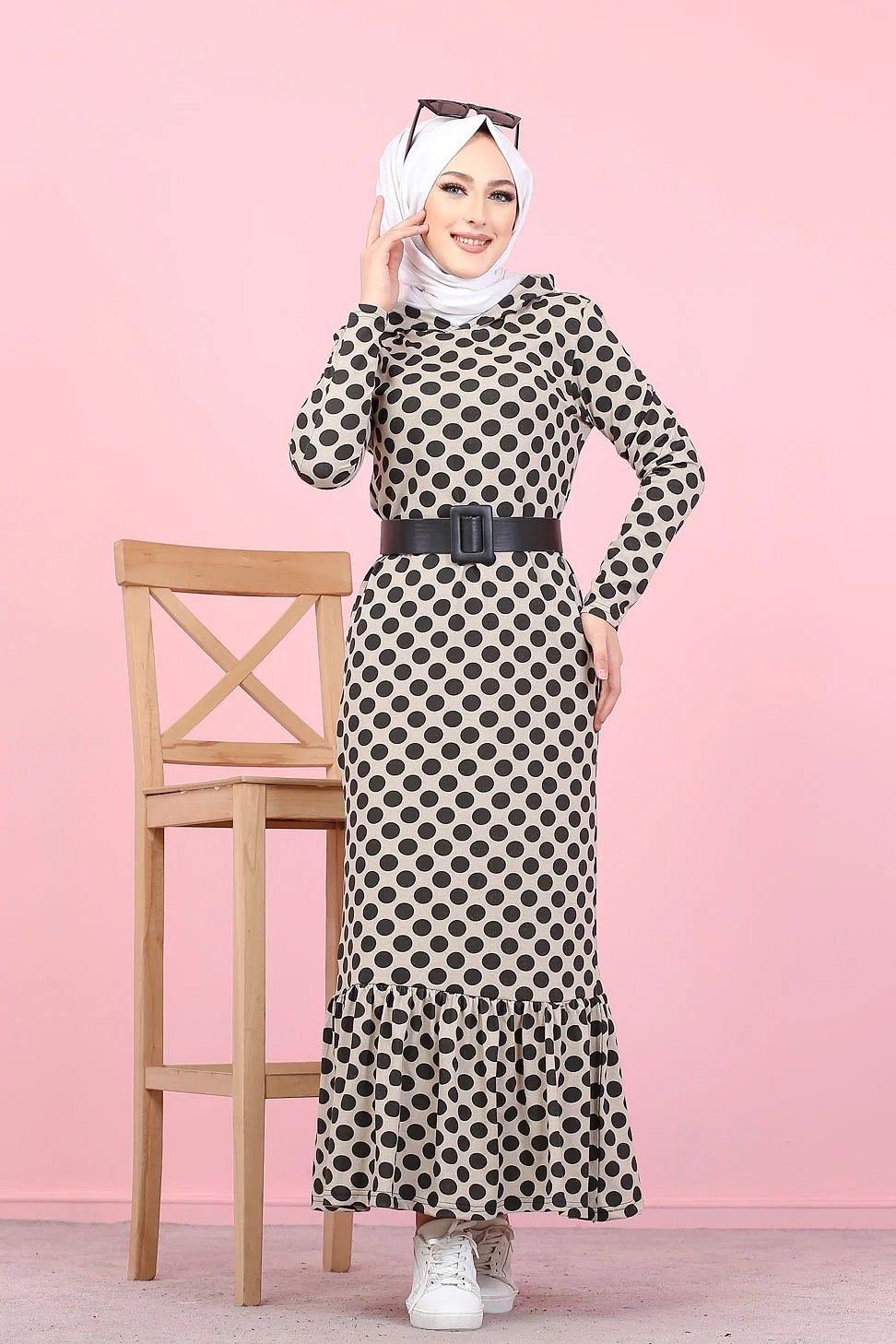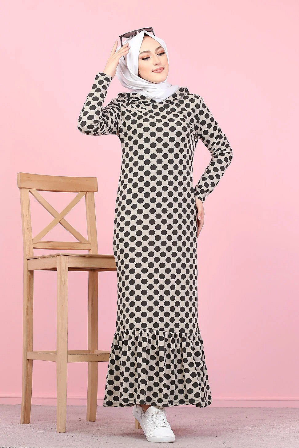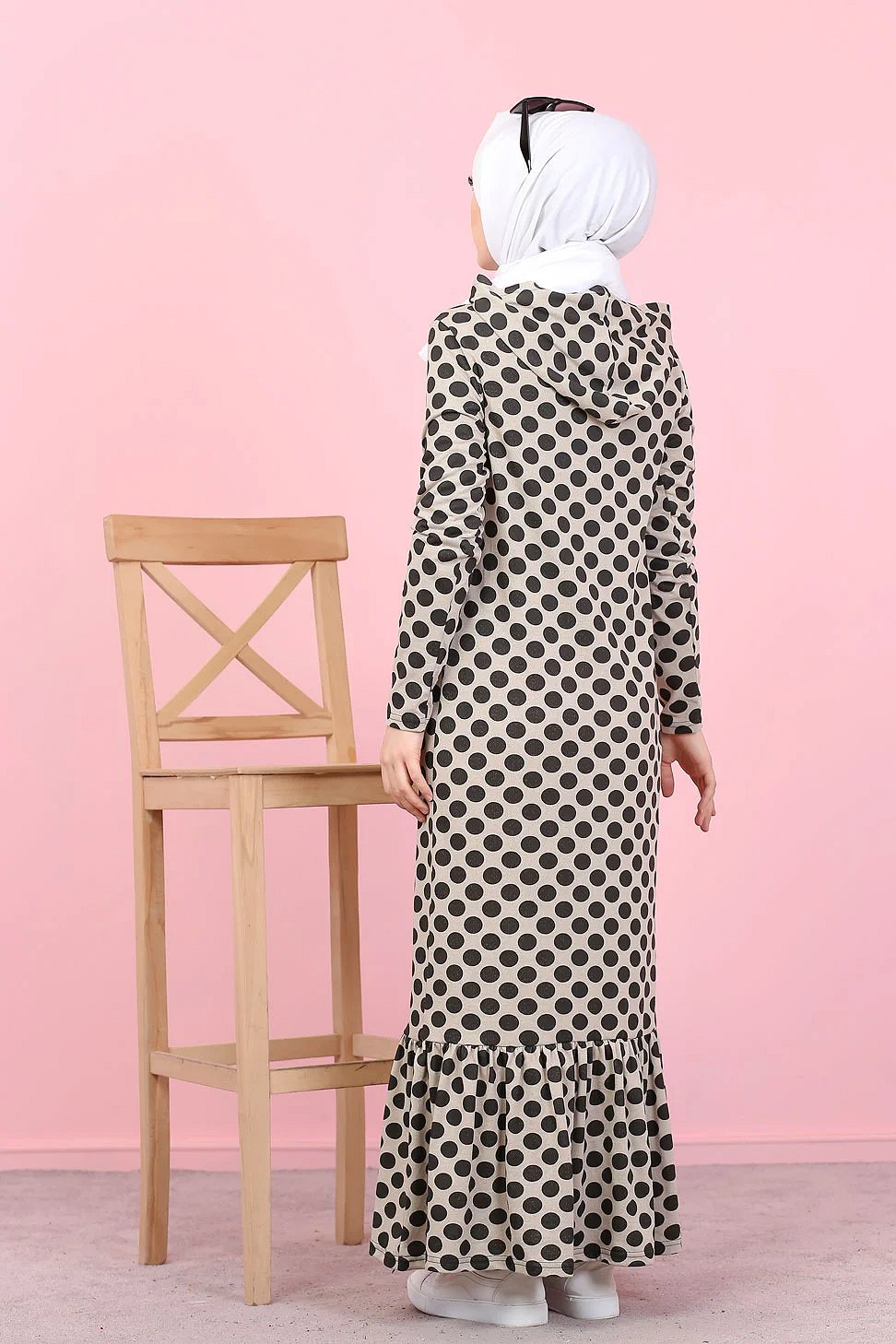 Robe longue, col à capuche, coupe droite finition volant. Ce modèle à pois reste tendance et indémodable.