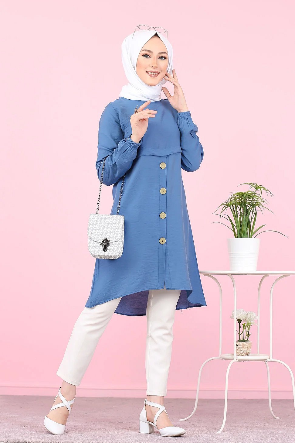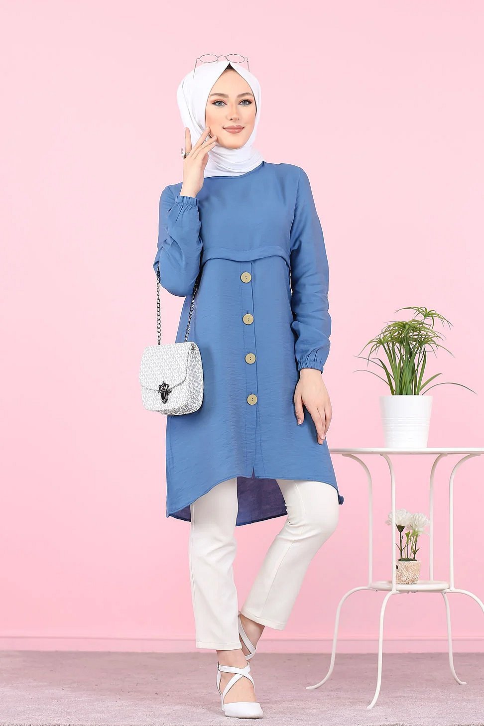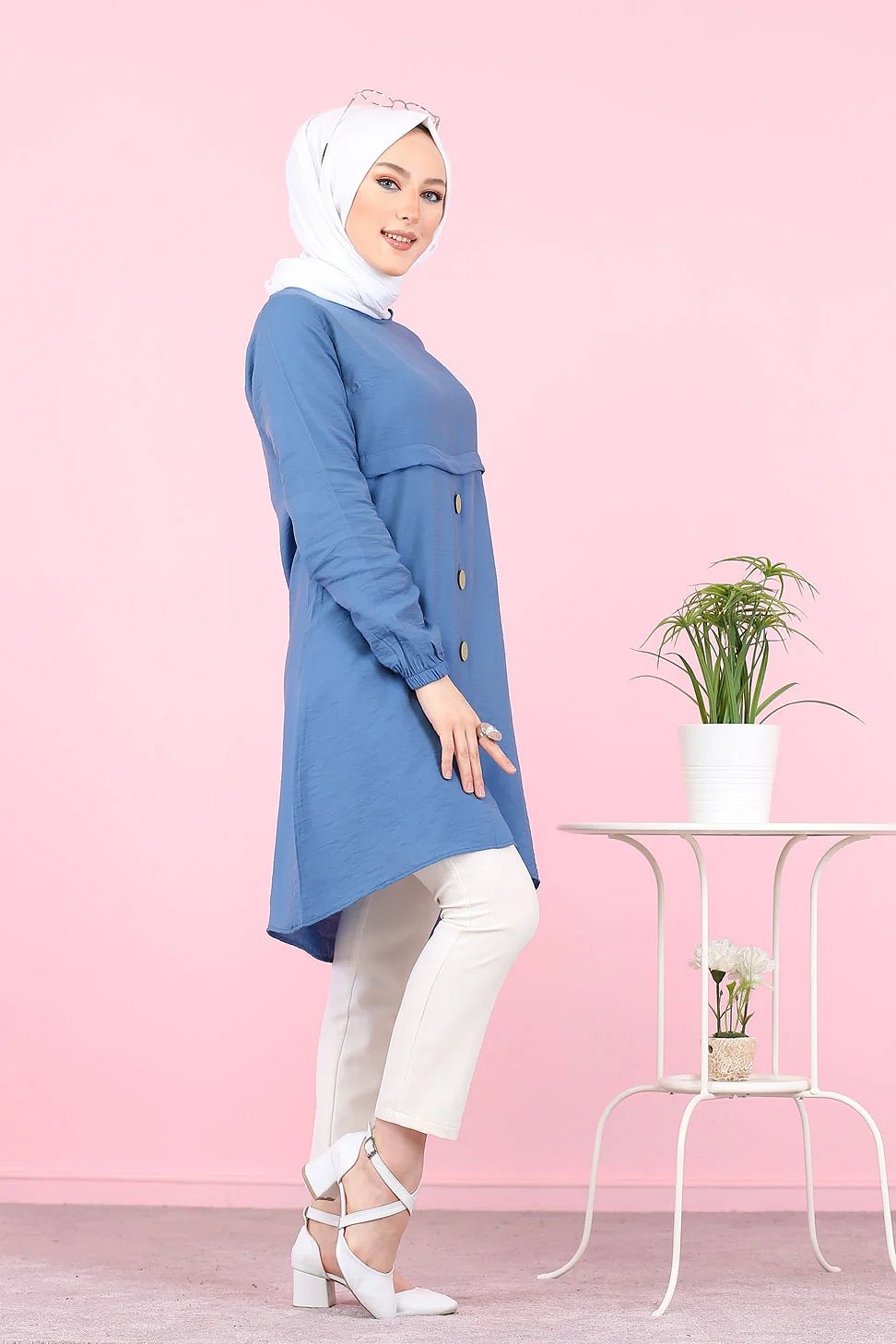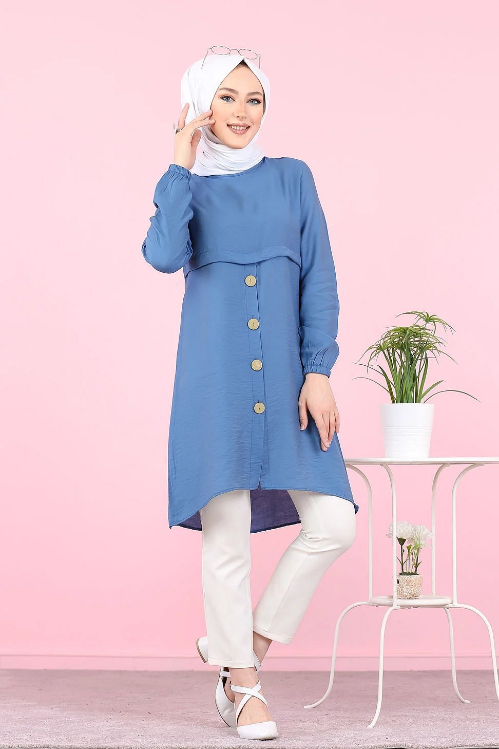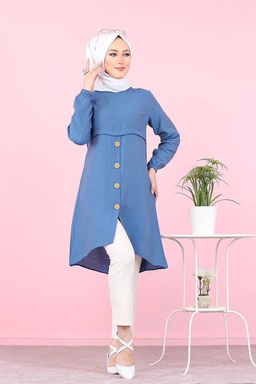 Tunique ample evasee boutonnee pour femme (Tenue Mastoura pour Hijab) - Couleur Bleu indigo
