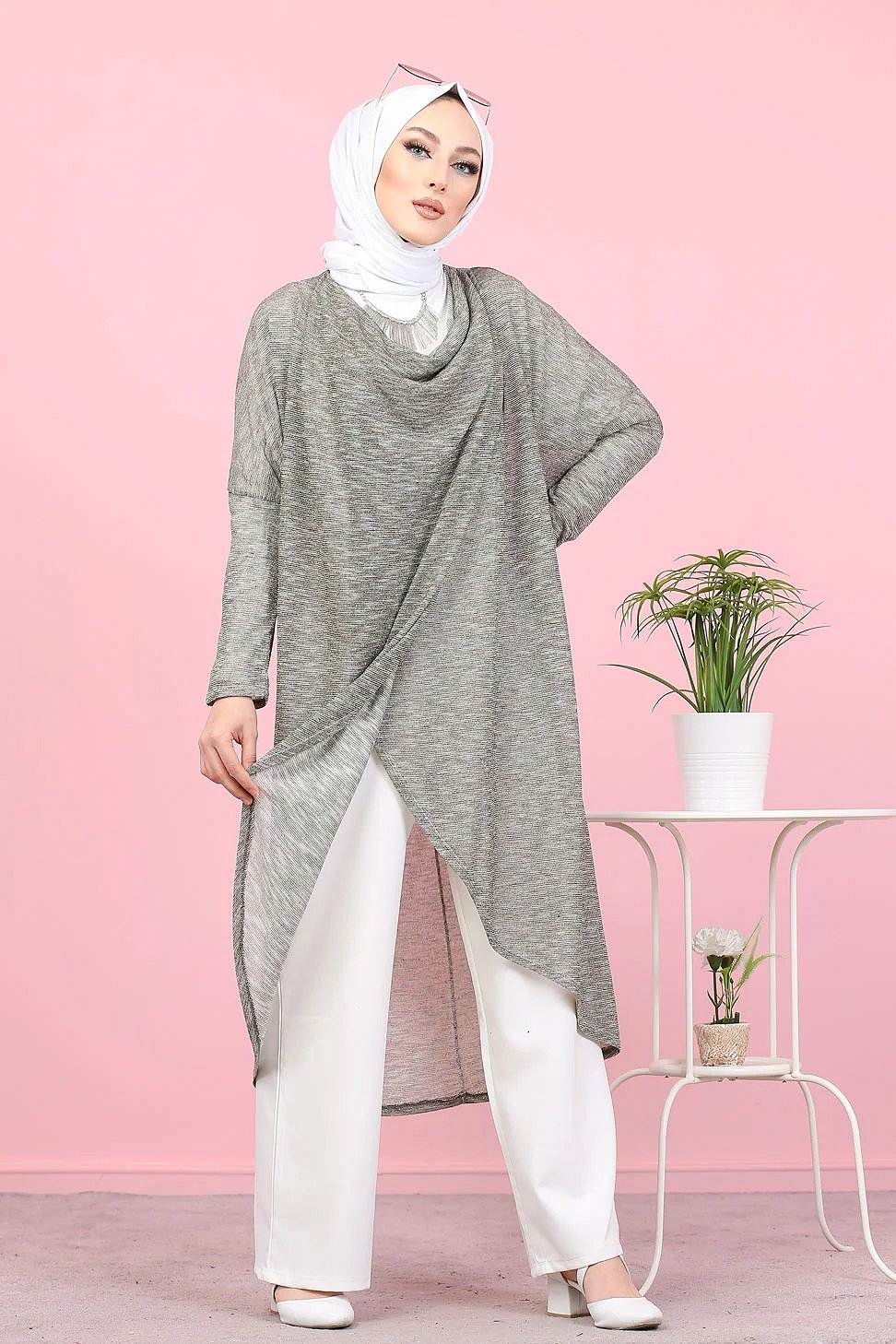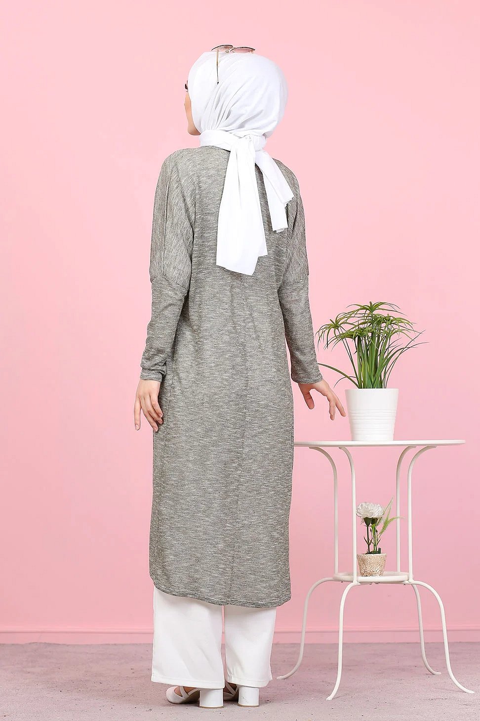 Tunique décontractée avec capuche (Tenue moderne pour Hijab) - Couleur gris clair avec bandes blanches - REF. 35610 (19.00 €)