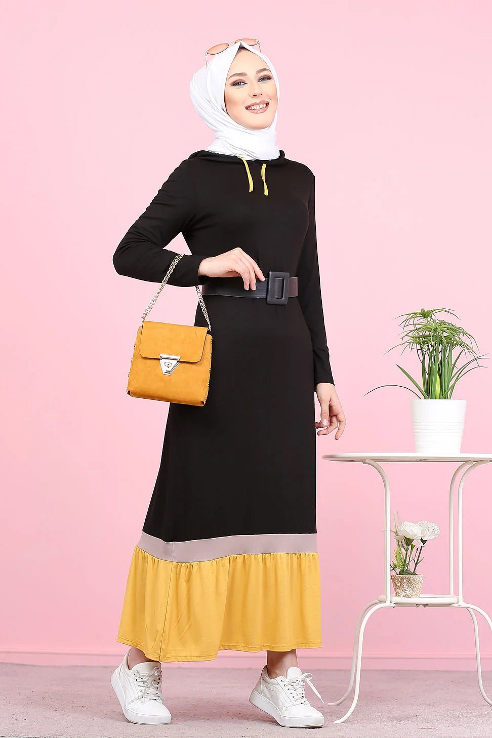Robe longue avec capuche style Urban moderne (Vetement pour femme voilée) - Couleur noir et jaune moutarde Vetement & Accessoire