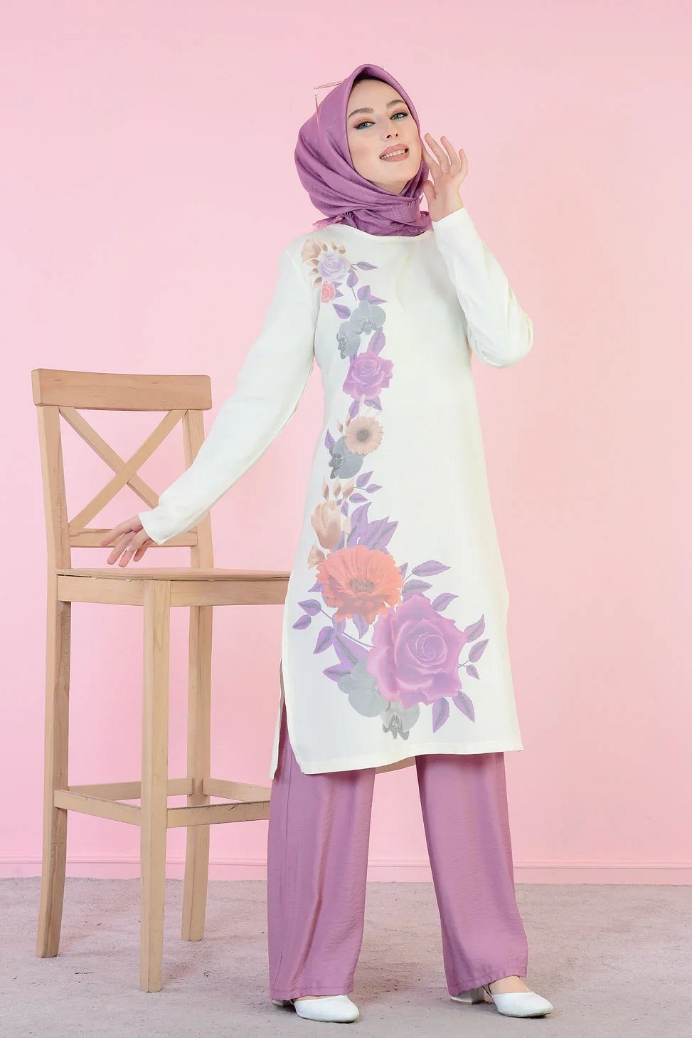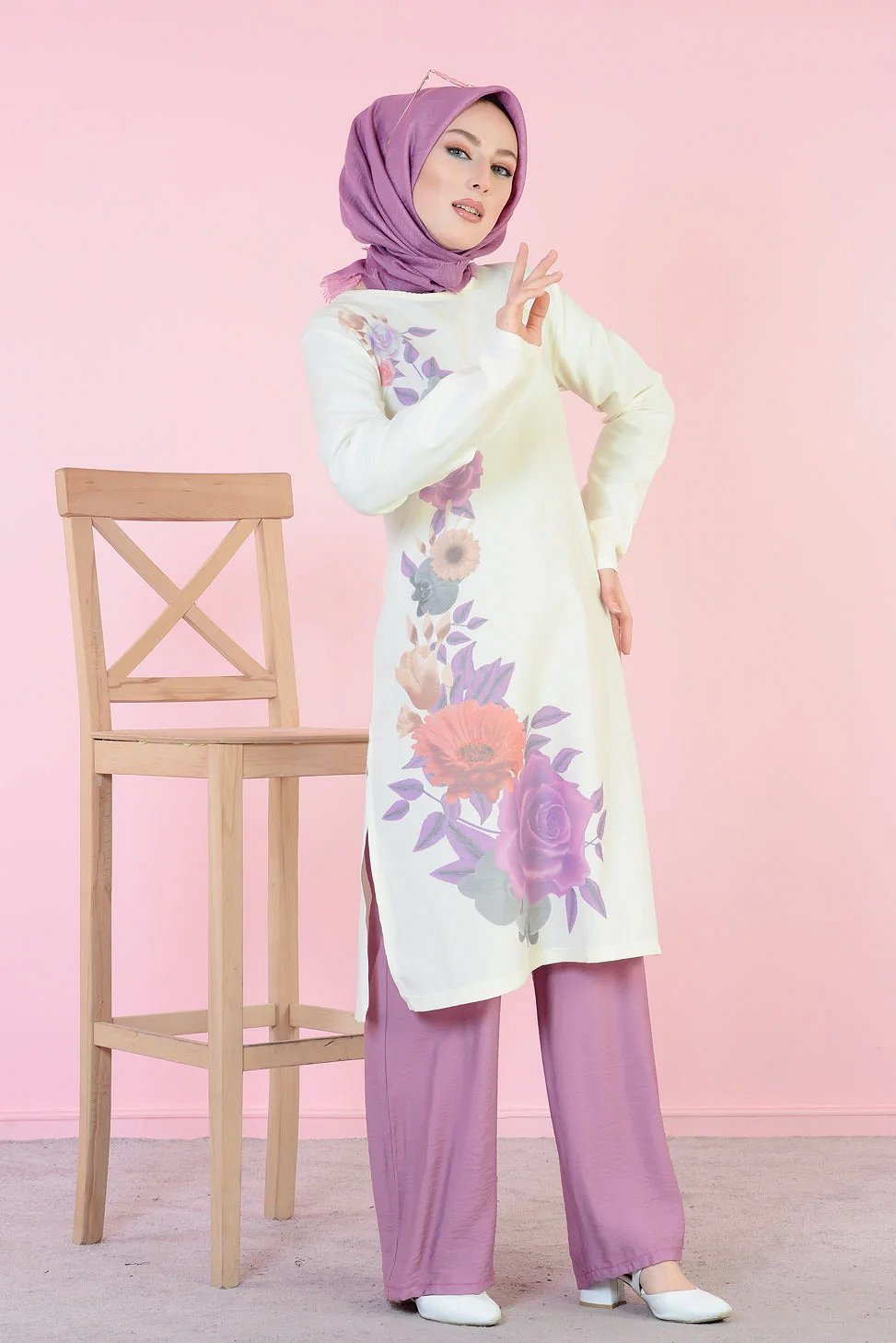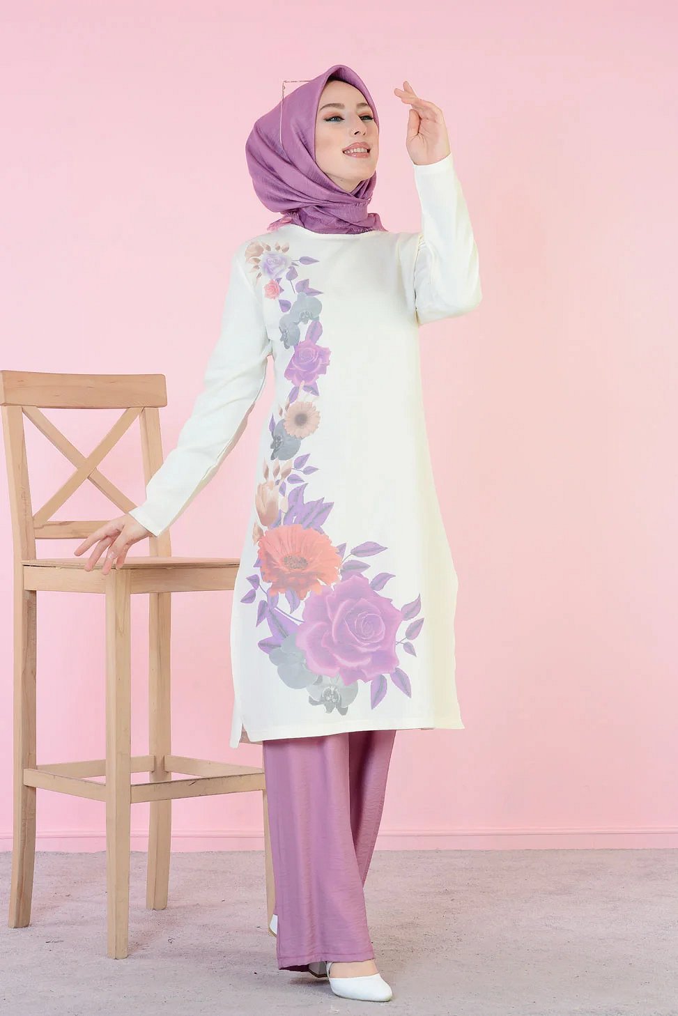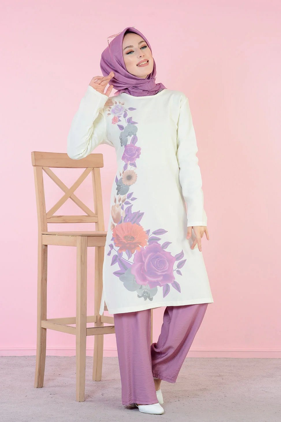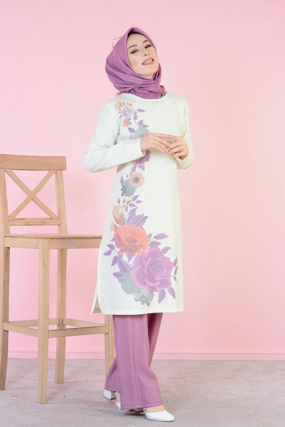 Tunique longue imprimée grandes fleurs mauves (Vetement hijab en ligne) Vetement & Accessoire