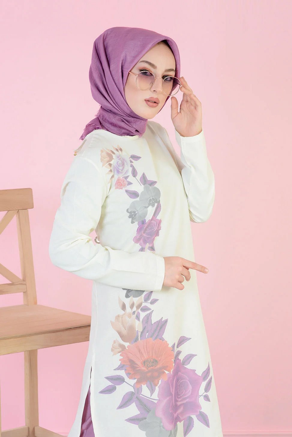 Tunique longue imprimee grandes fleurs mauves (Vetement hijab en ligne)