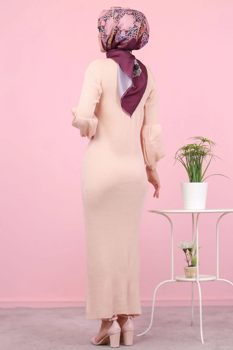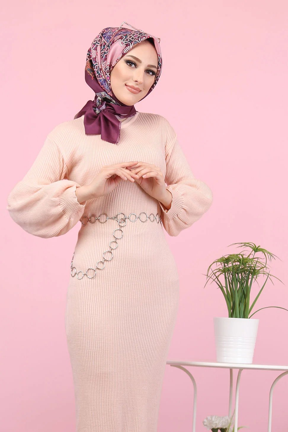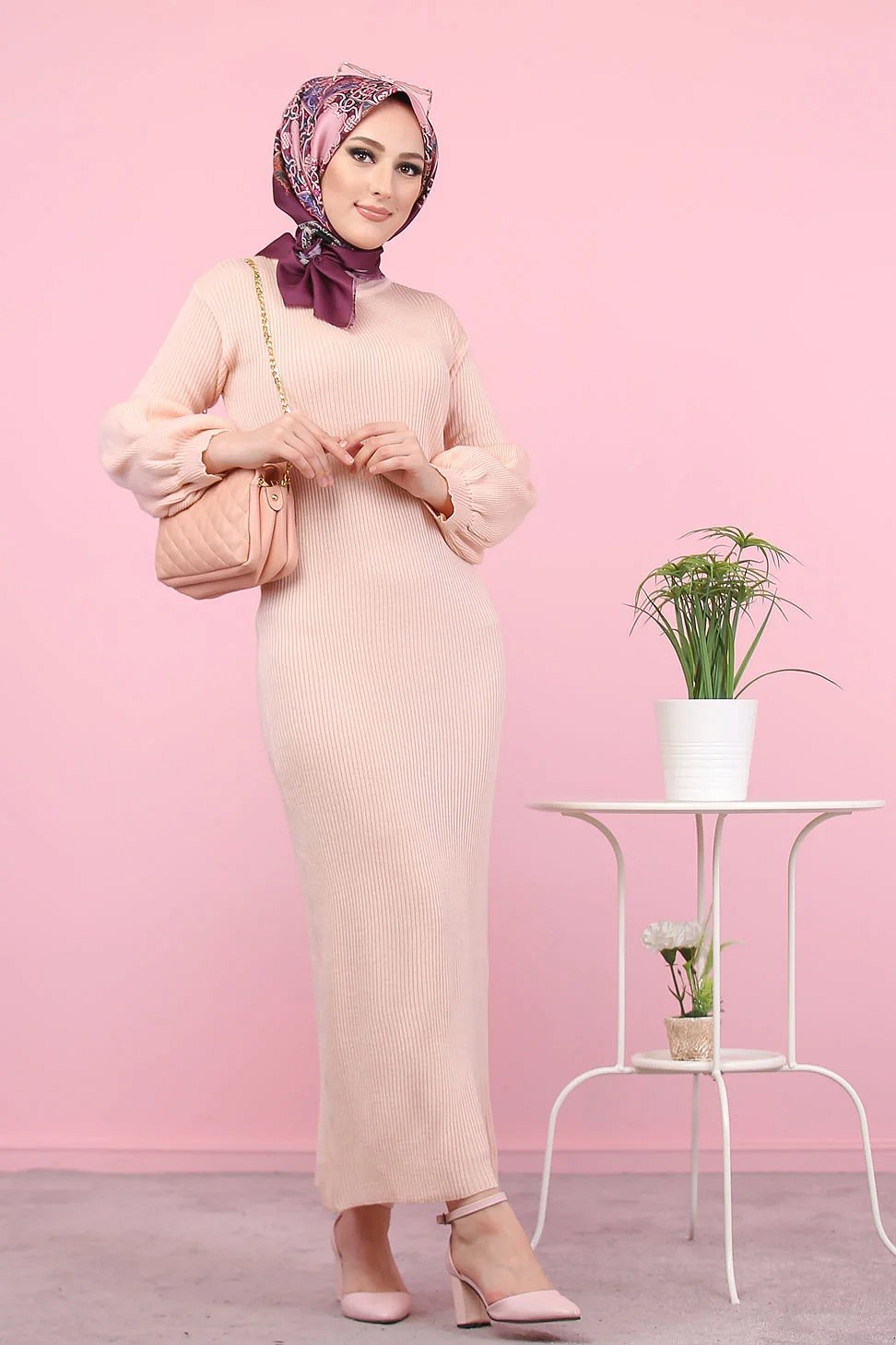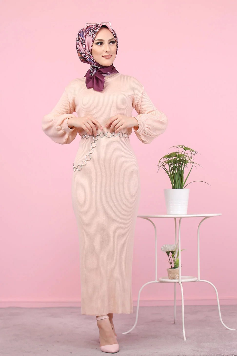 Robe longue tricotee pour femme (Mode Musulmane - Automne Hiver) - Couleur rose poudre