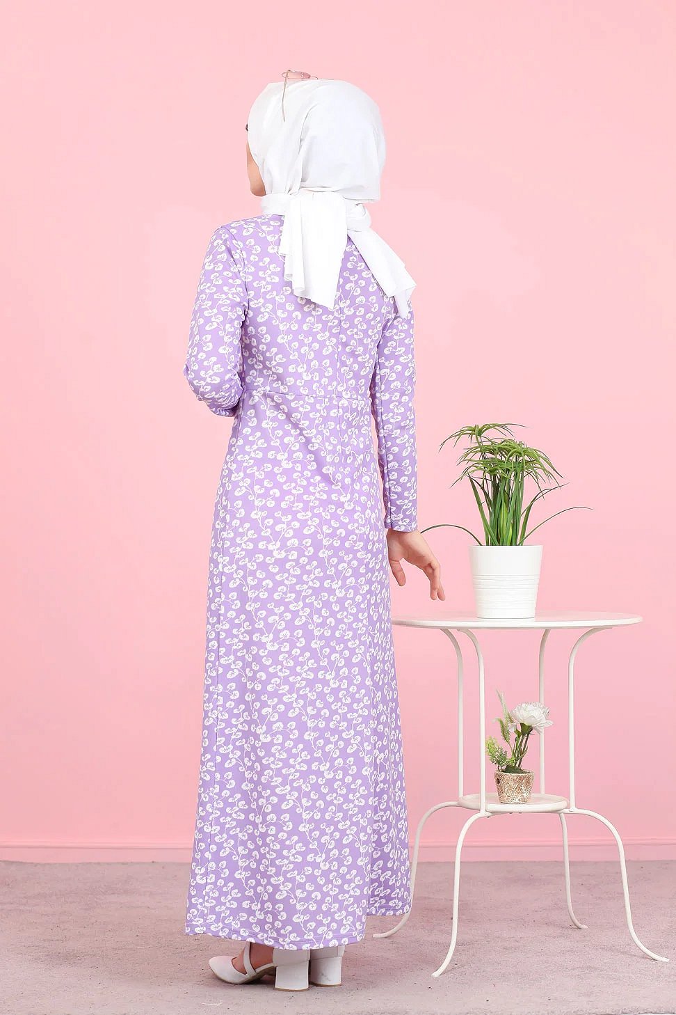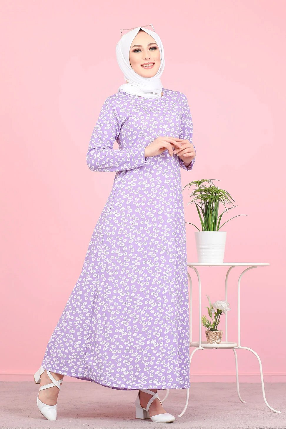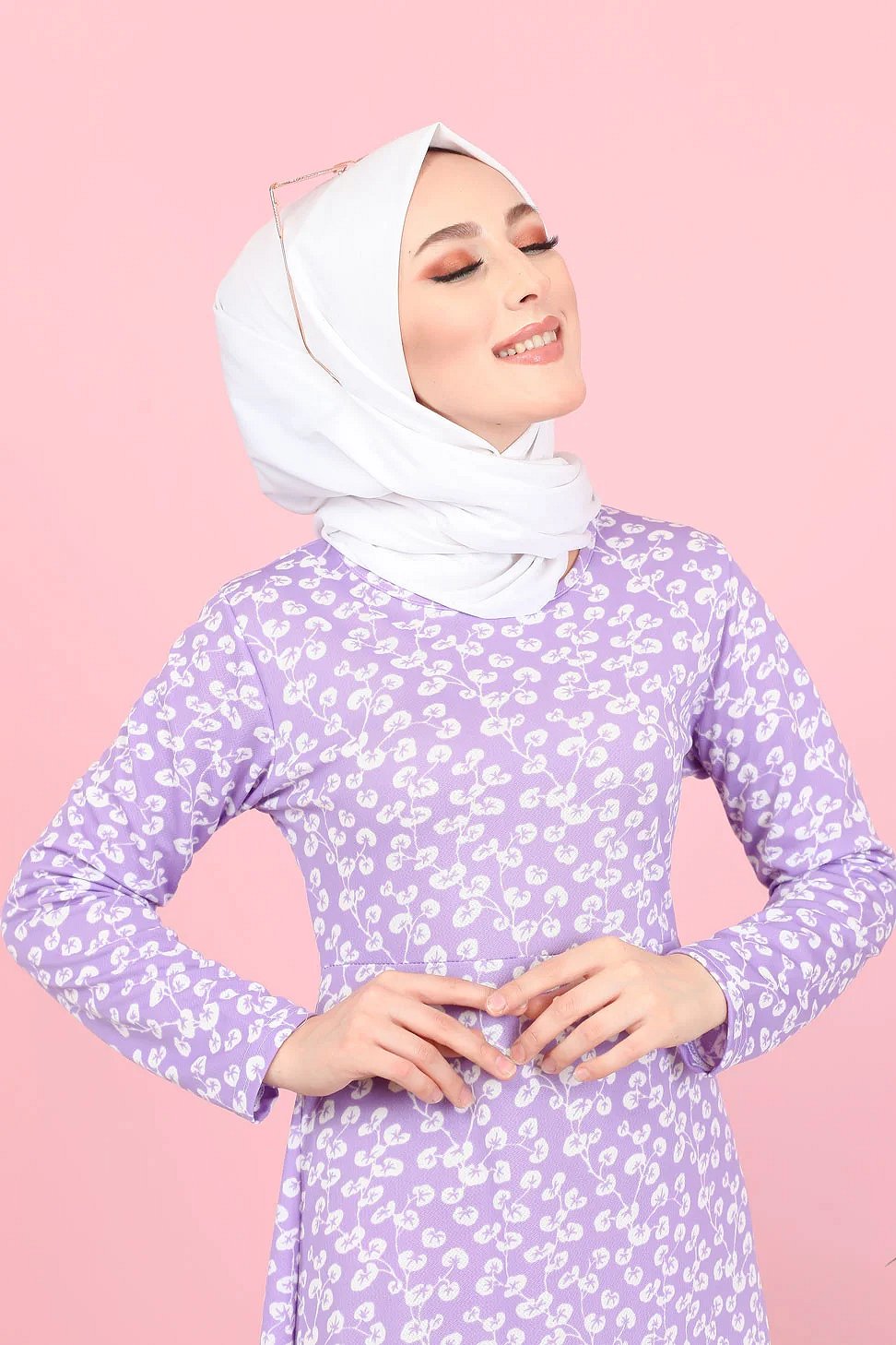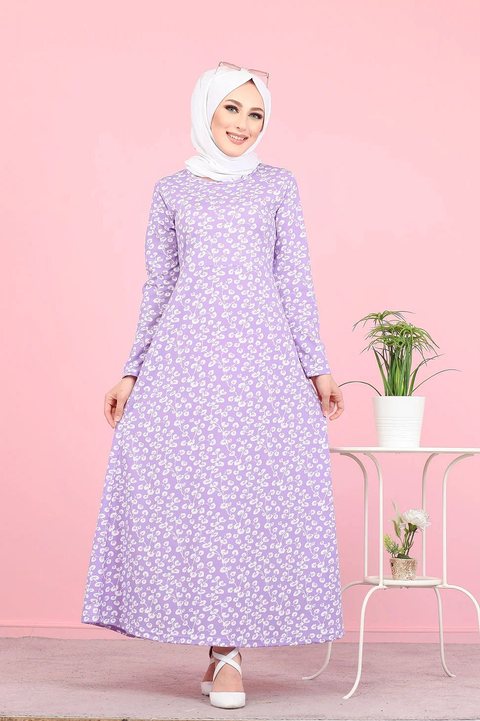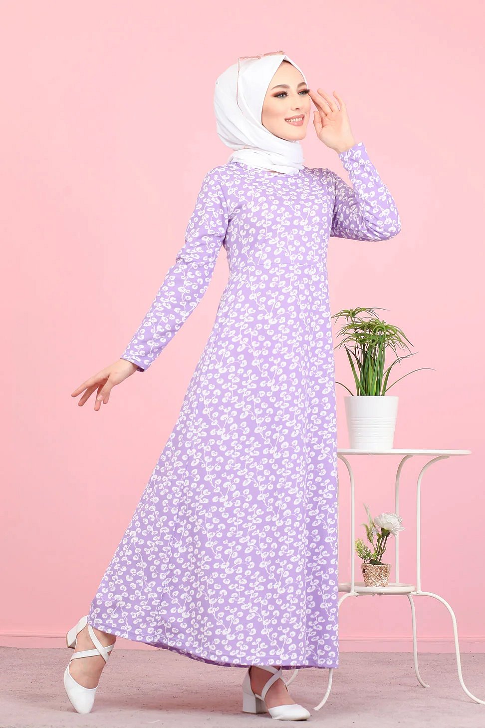 Robe evasee a motifs fleuris pour femme (Boutique Mode Musulmane en ligne) - Couleur lilas