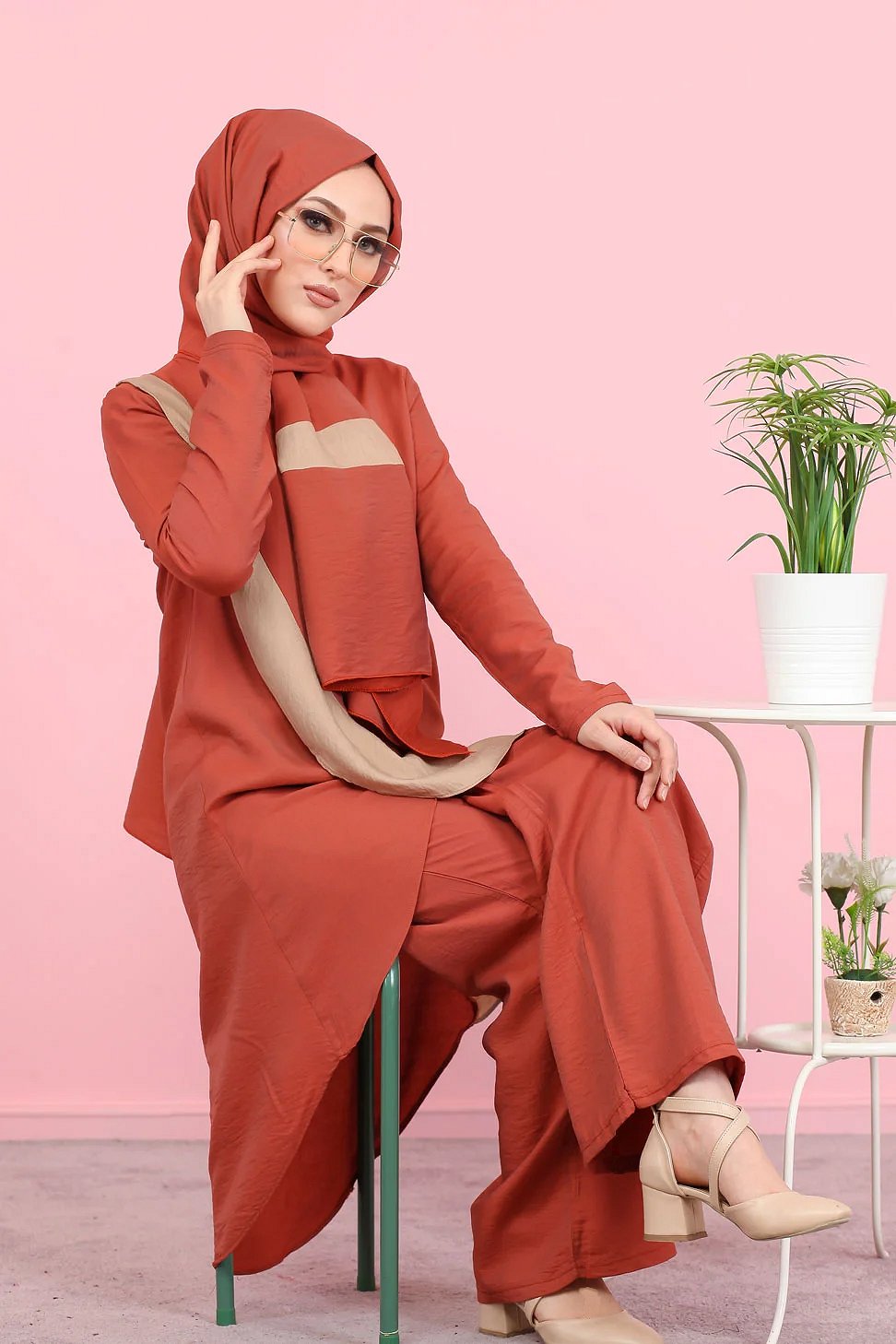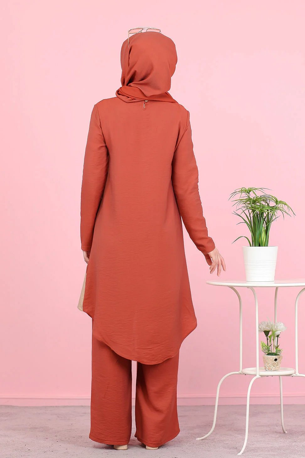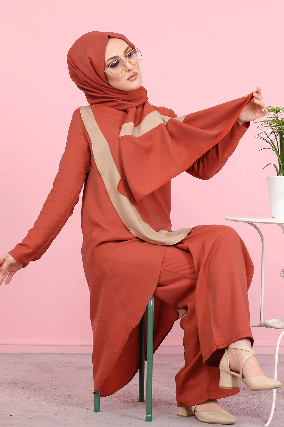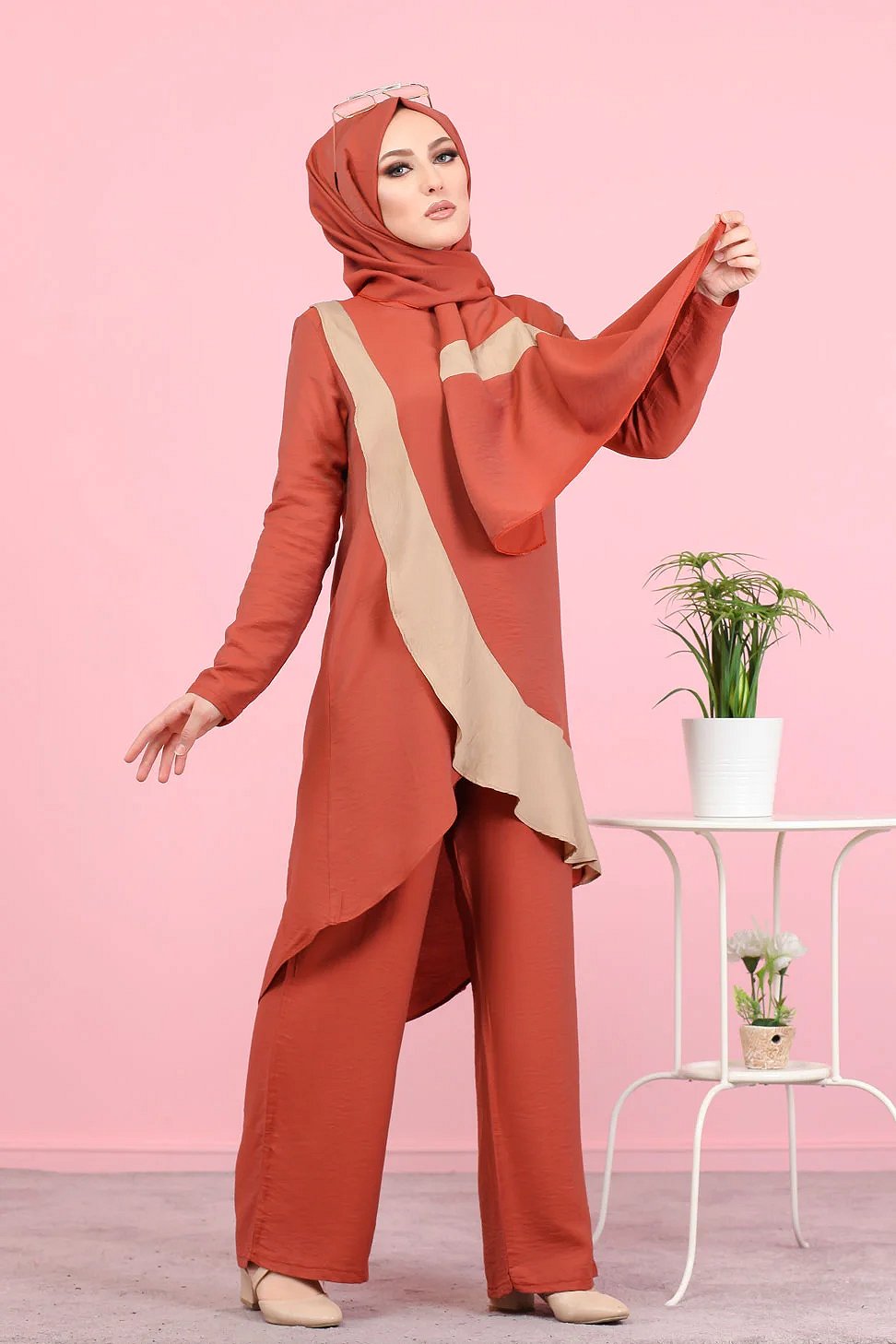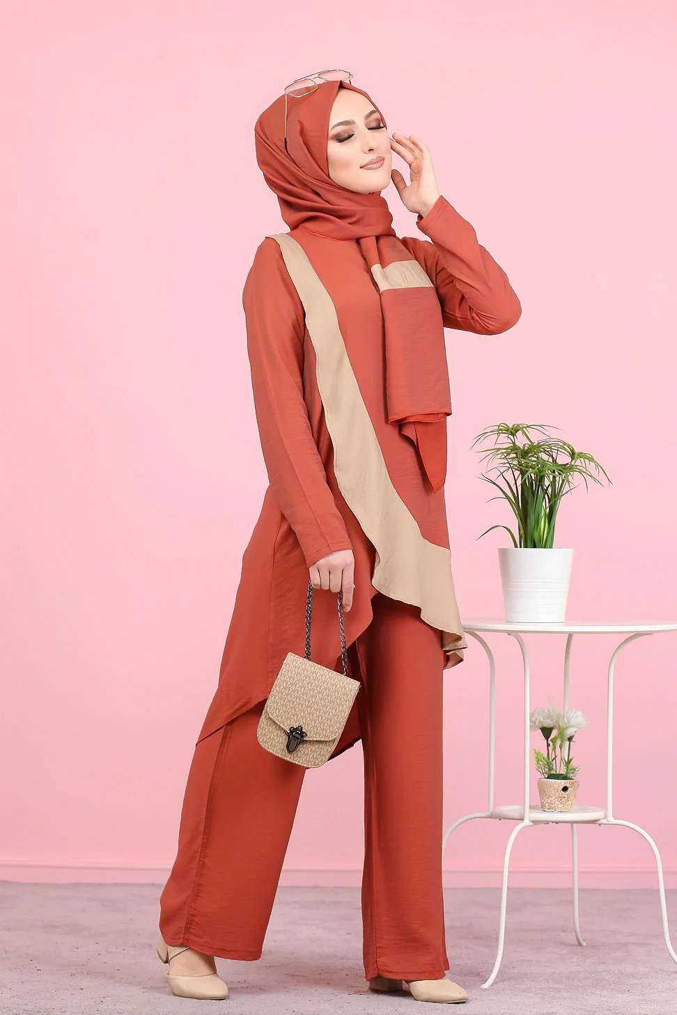 Ensemble ample 3 pieces : tunique - pantalon et voile assorti pour femme (Tenue Hijab mastour) - Couleur Brique