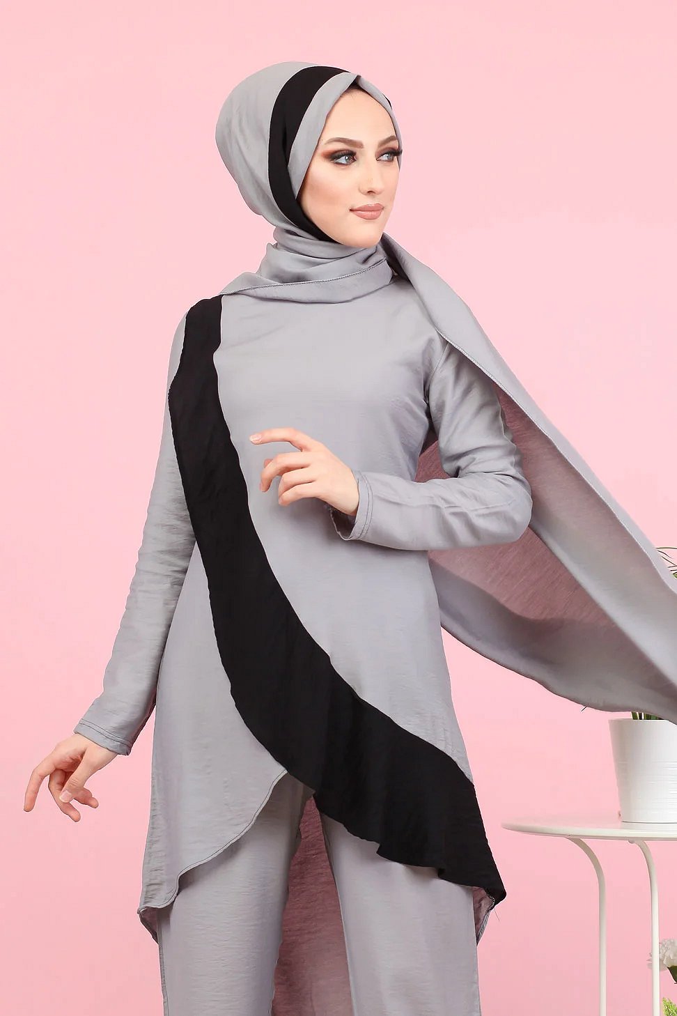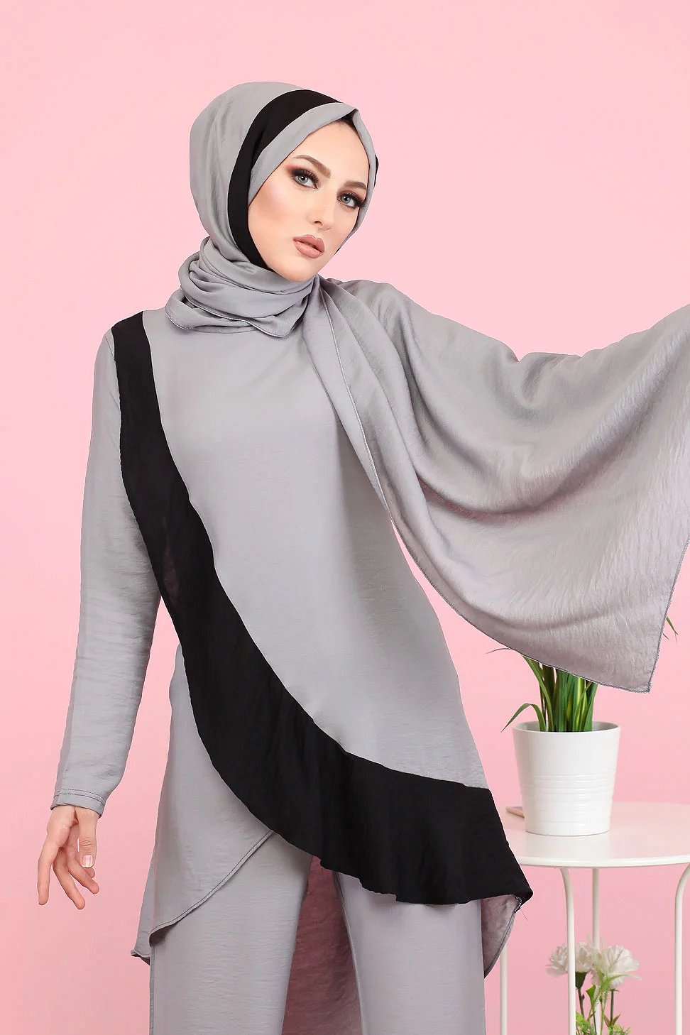 Ensemble ample 3 pieces : tunique - pantalon et voile assorti (Vetement pour femme voilee) - Couleur Gris