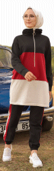 Ensemble survêtement tricolore pour femme : tunique zippée à capuche et pantalon (Vetement Hijab 2021) - Couleur noir blanc et bordeaux - REF. 33241 (29.90 €)