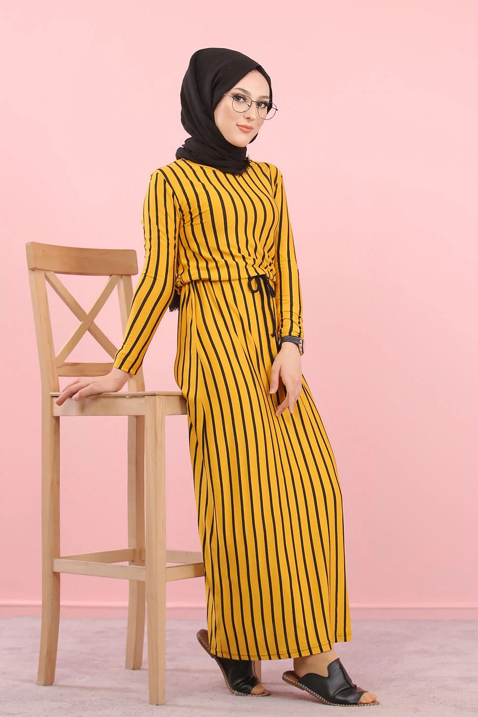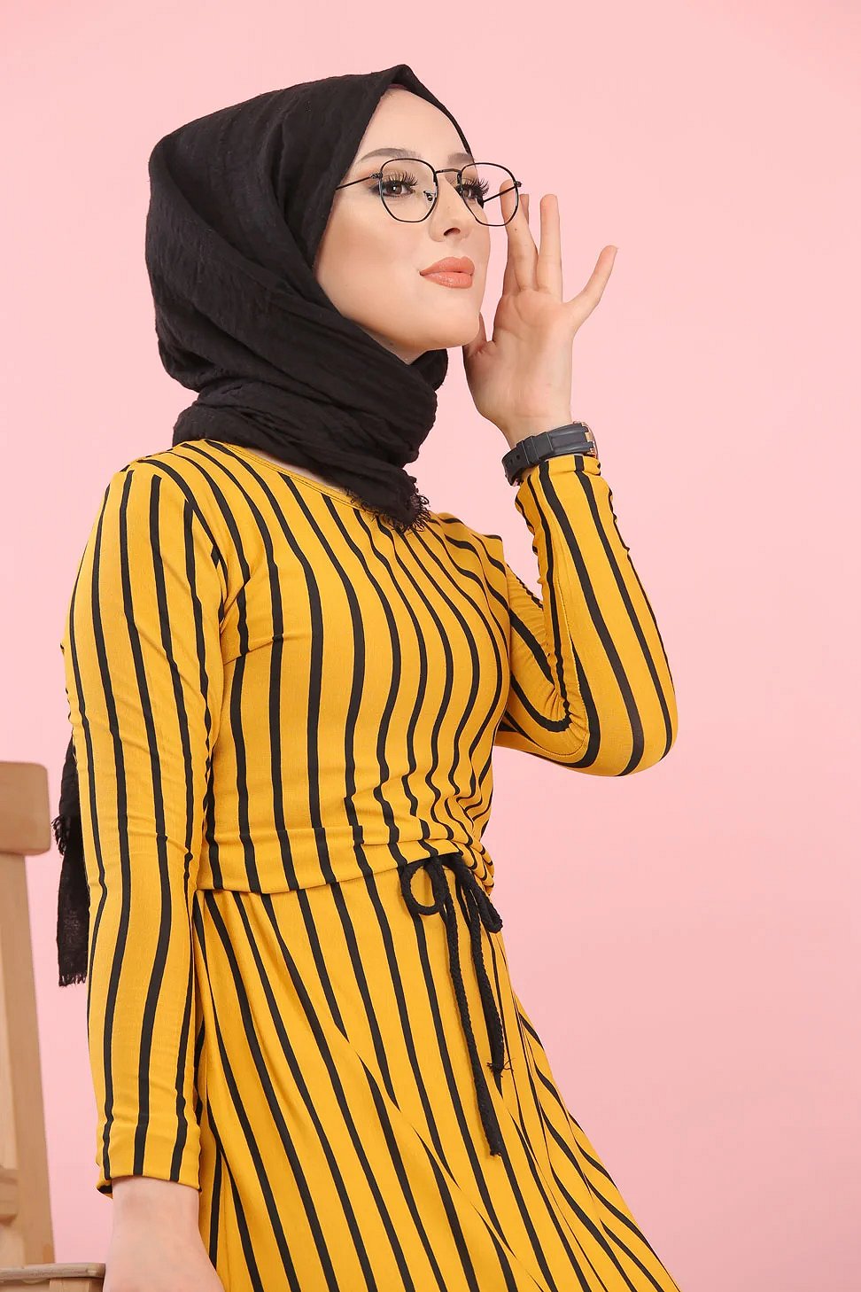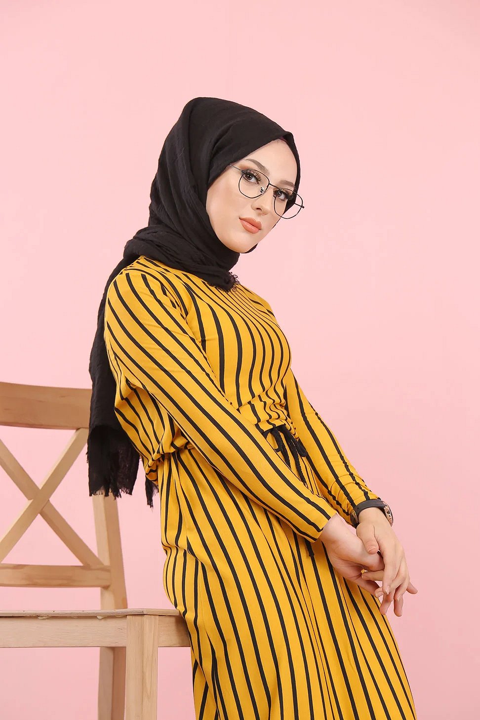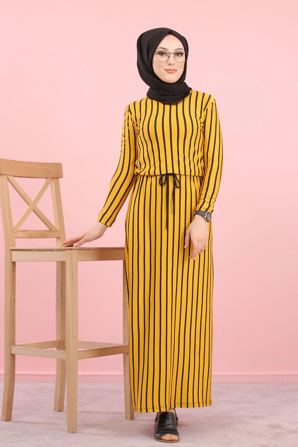 Robe maxi-longue a rayures mode decontracte ceinture integree (Vetement femme Hijab en ligne) - Couleur Moutarde