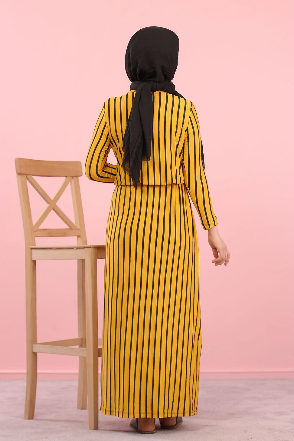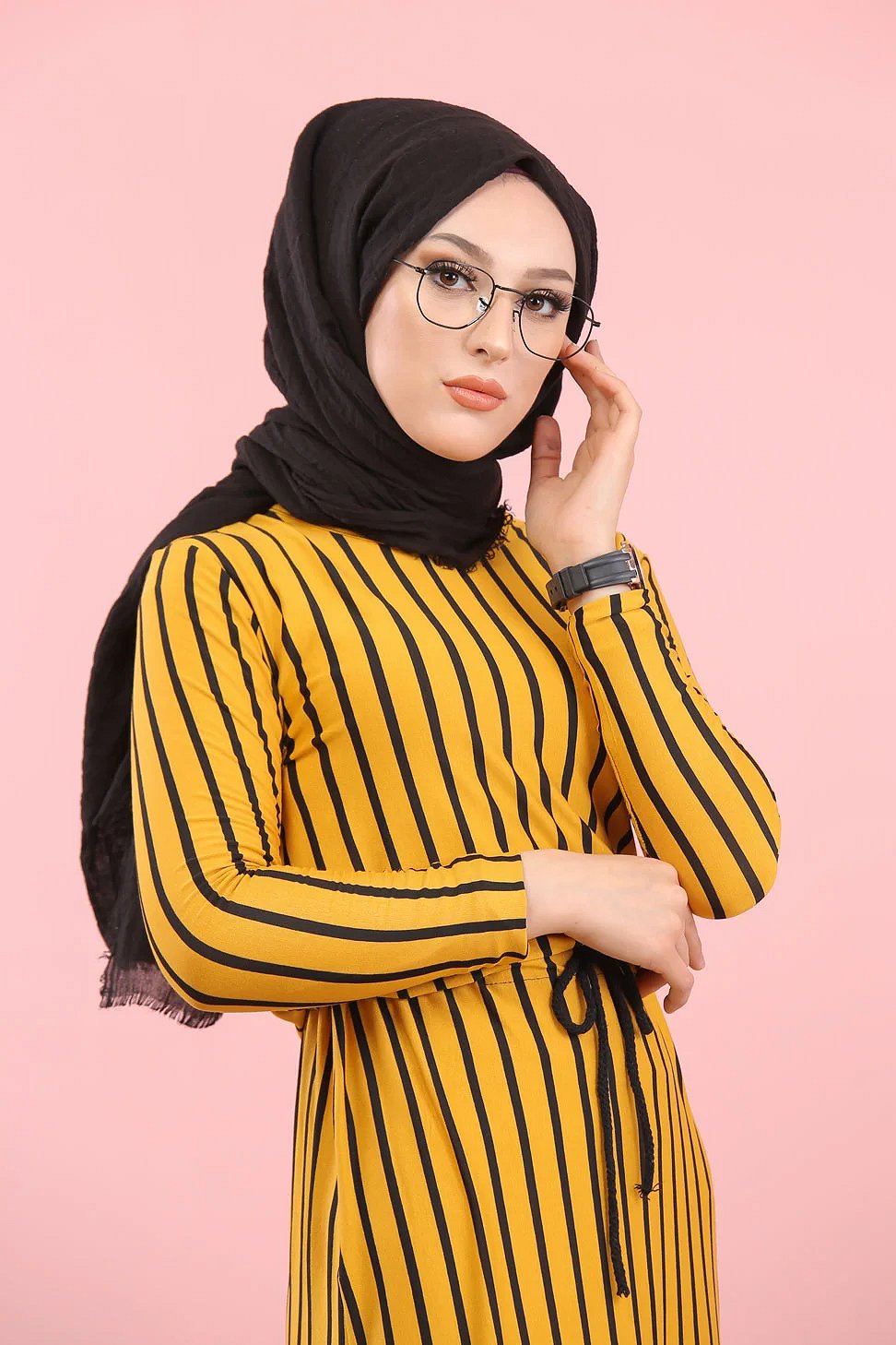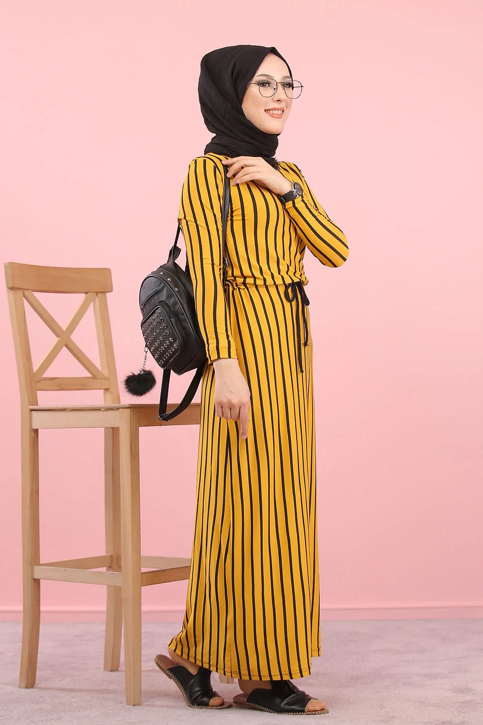 Robe maxi-longue à rayures mode décontracté ceinture intégrée (Vêtement femme Hijab en ligne) - Couleur Moutarde Vetement & Accessoire