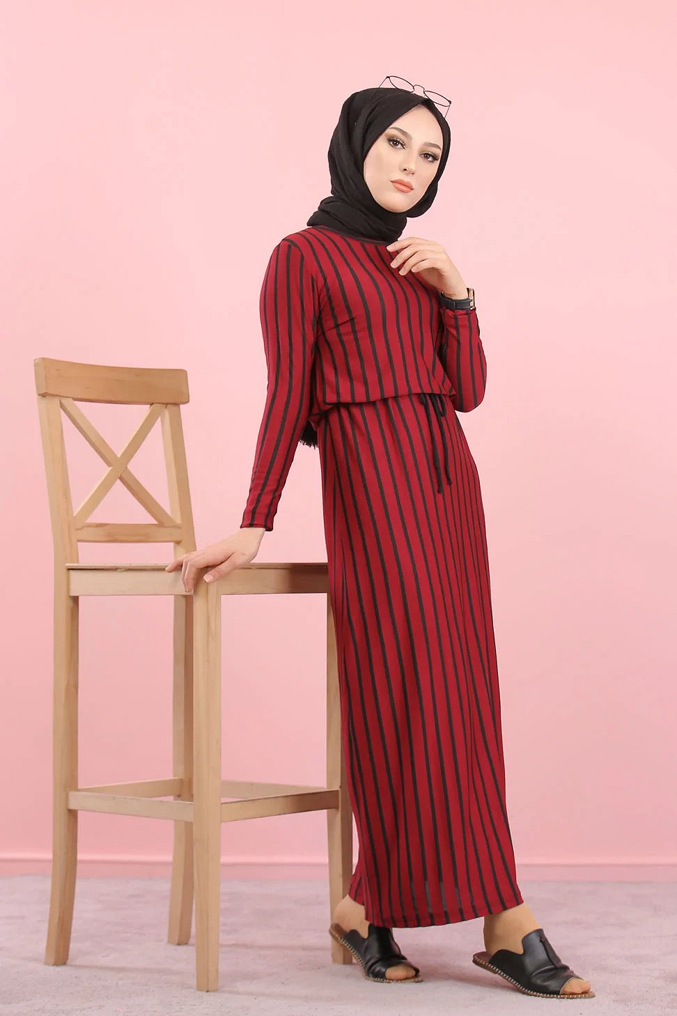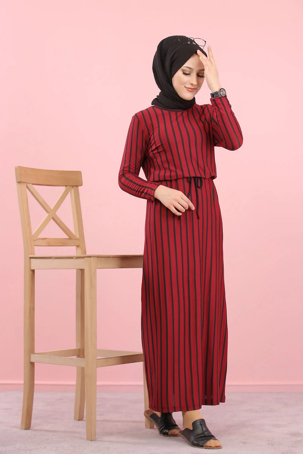 Robe longue col rond, lien de serrage à la taille, coupe droite.