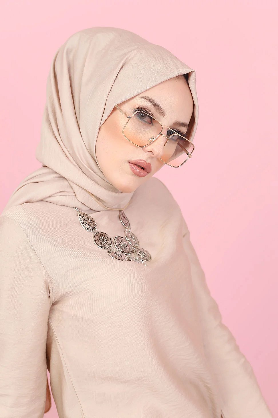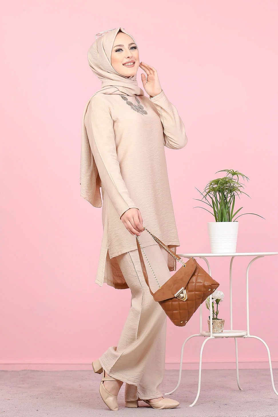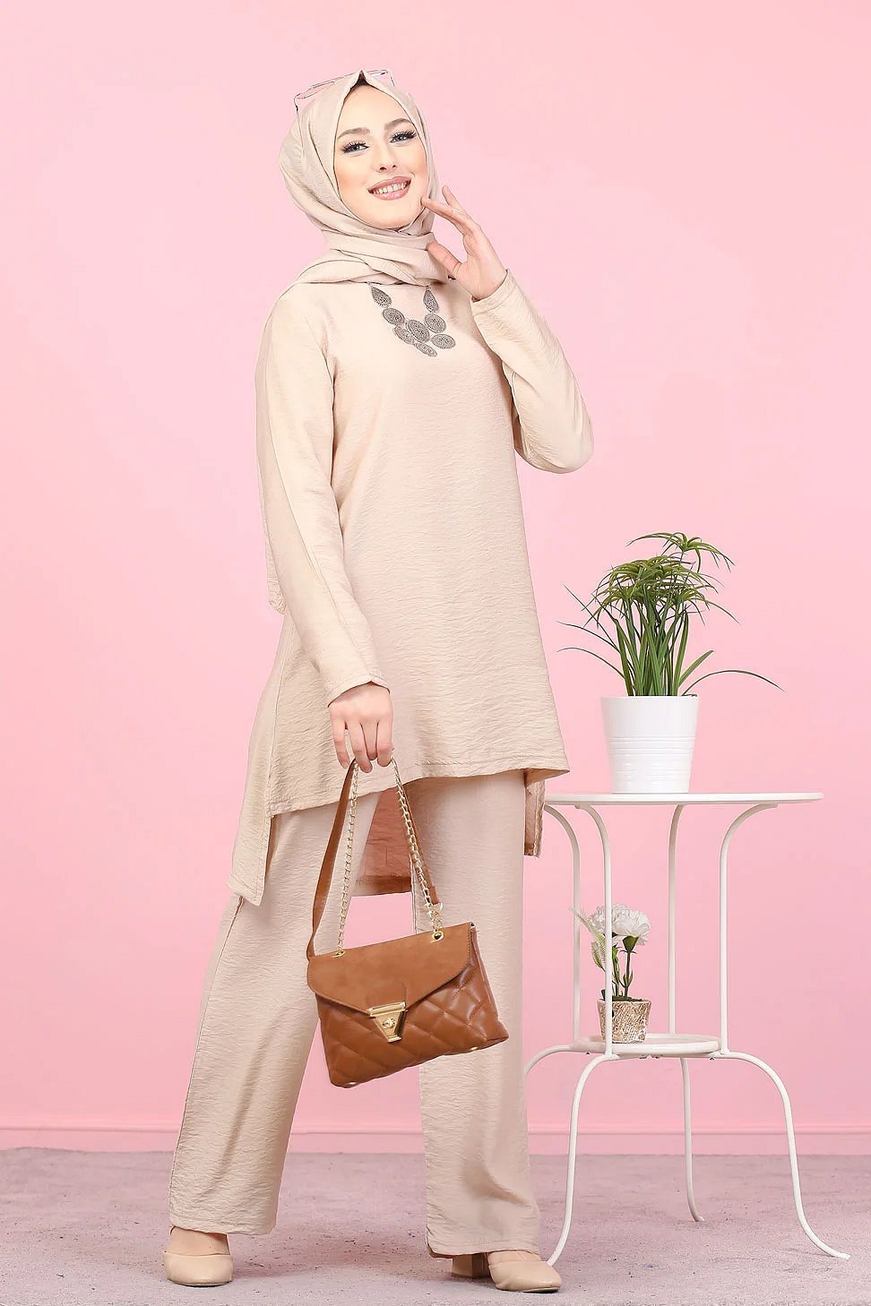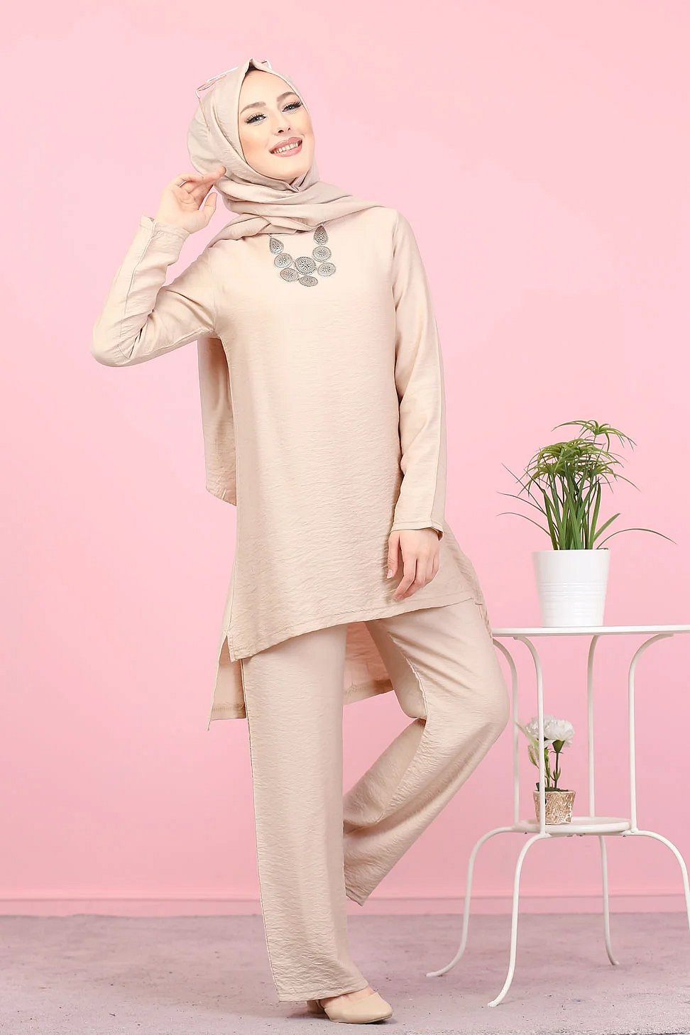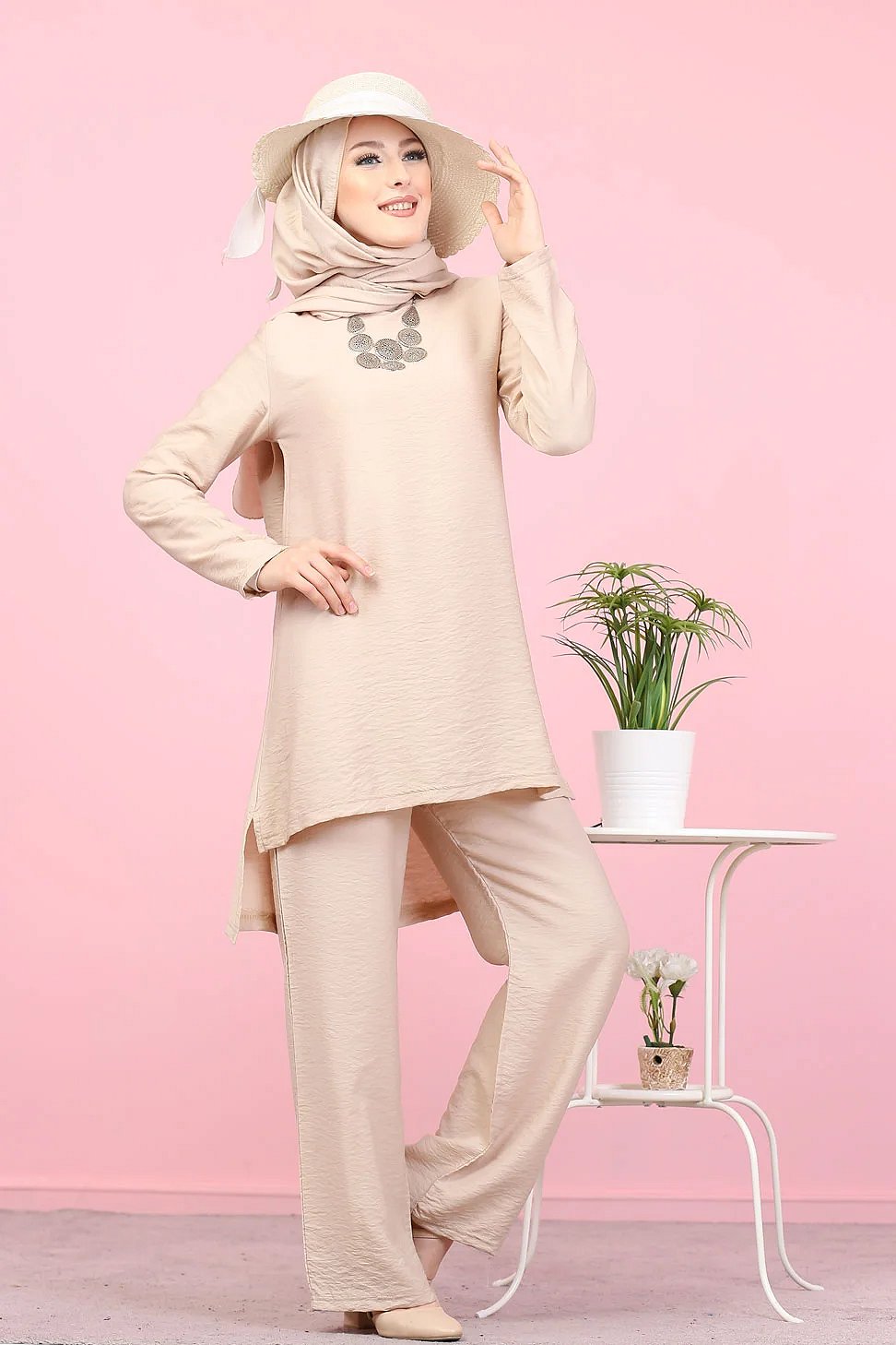 Ensemble 2 pièces assorti de son long hijab pour femme musulmane (Voile inclus) - Couleur beige Vetement & Accessoire