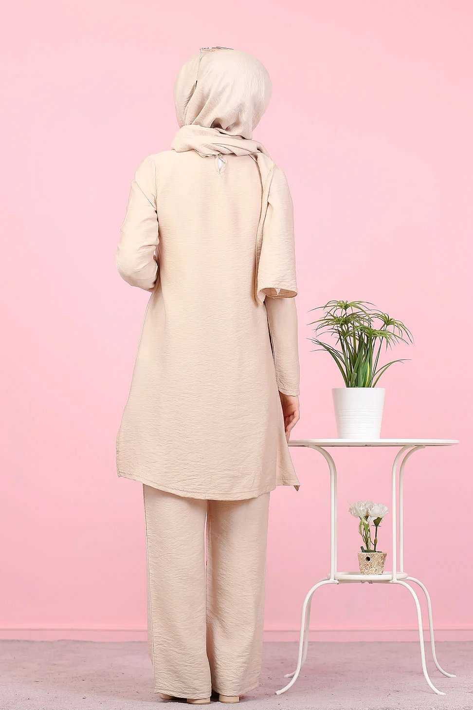 Ensemble 2 pieces assorti de son long hijab pour femme musulmane (Voile inclus) - Couleur beige